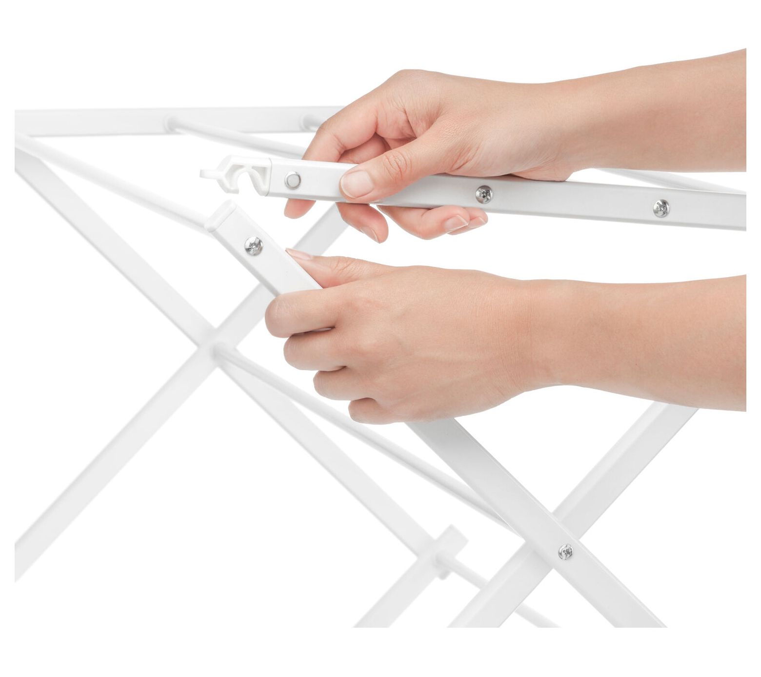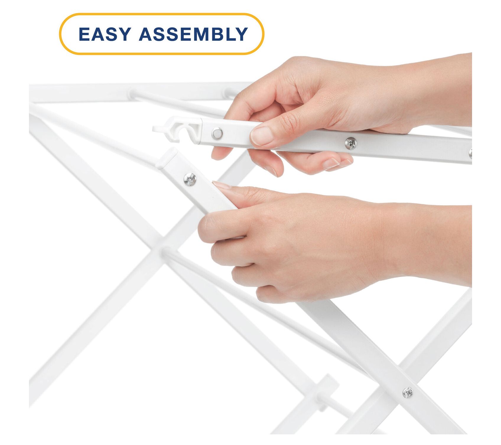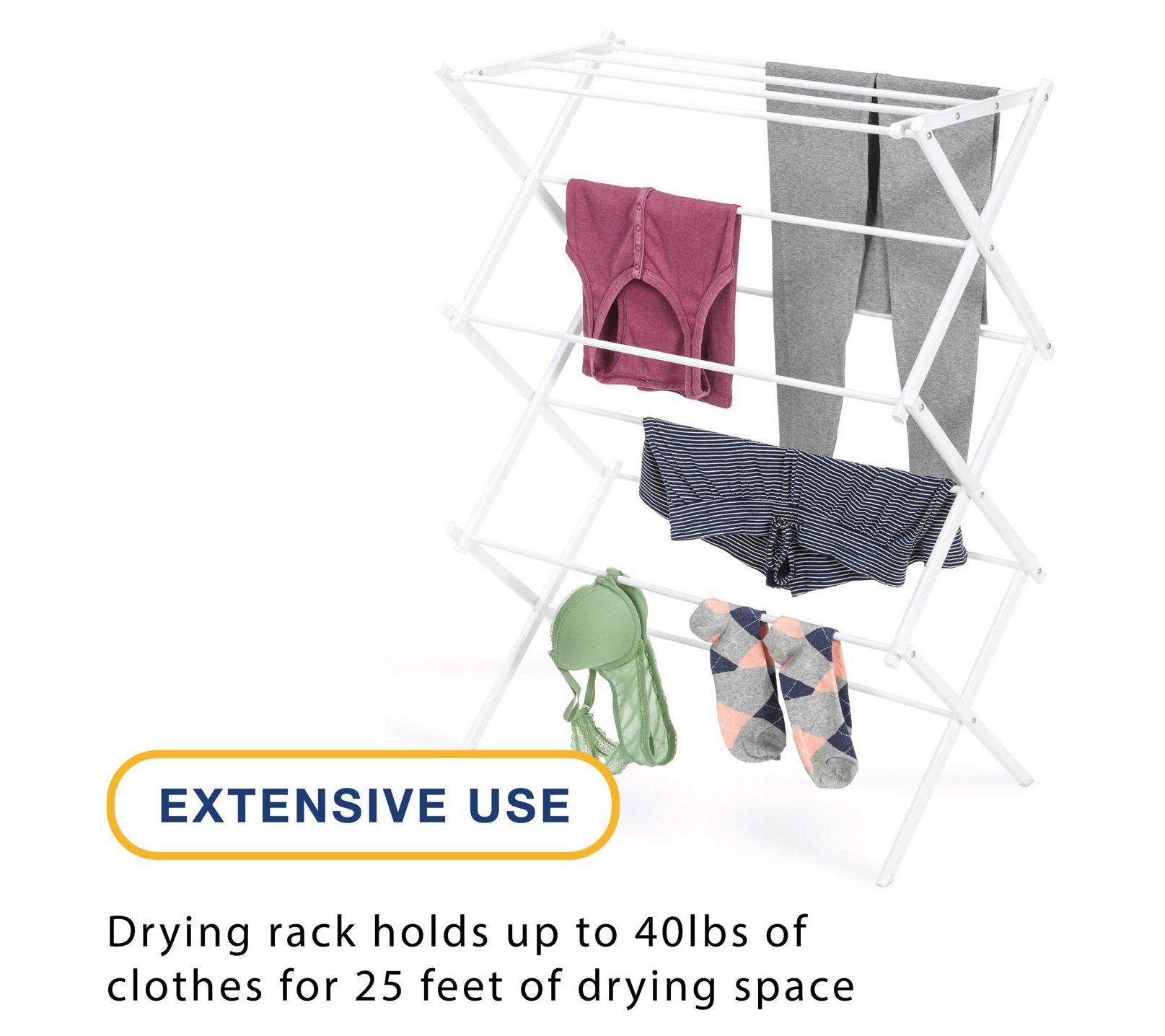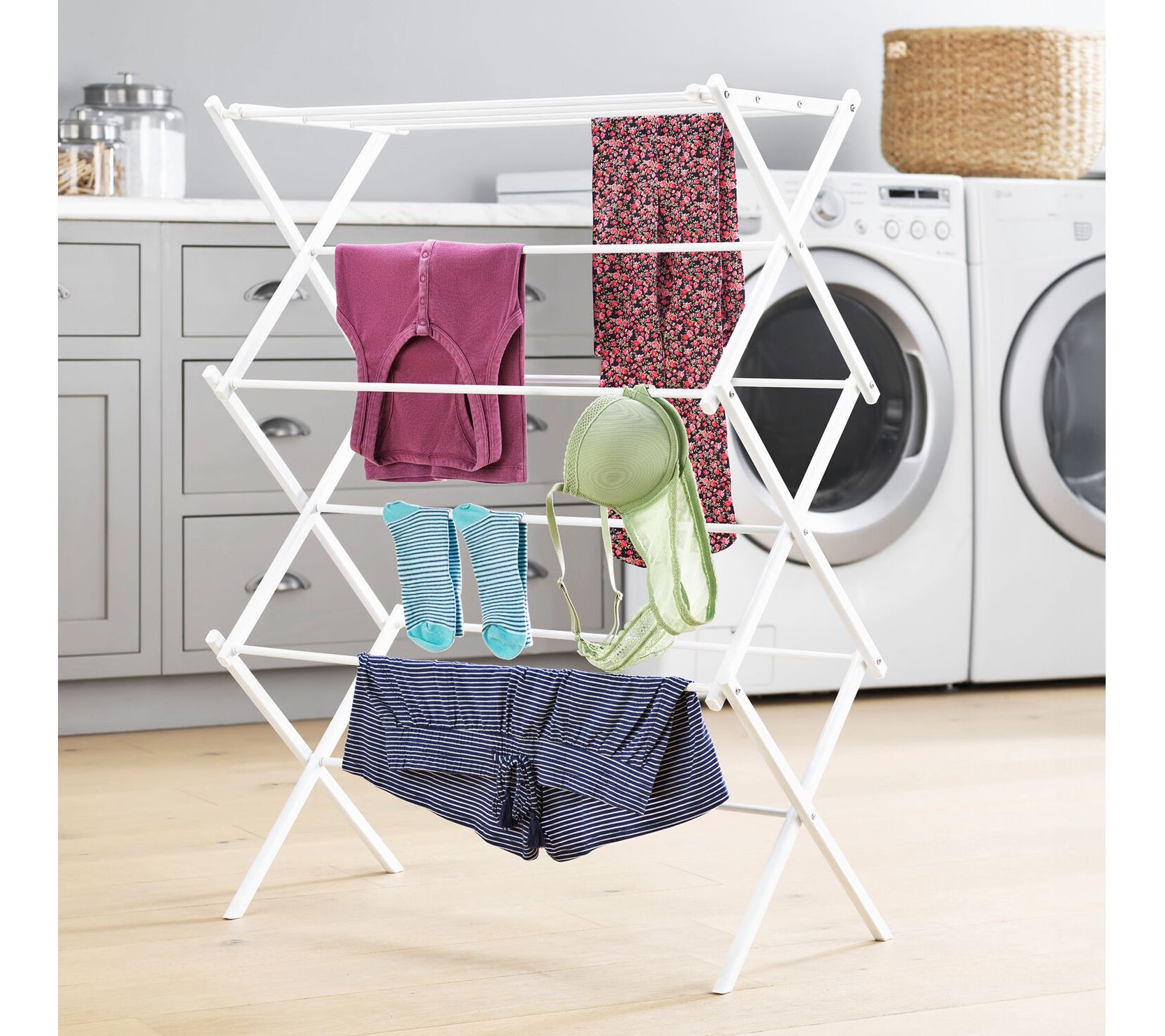 Dry all your clothes with ease using the Whitmor three-tier folding metal drying rack. Its accordion design allows you to set it up effortlessly, whether indoors or out, while the 11 epoxy-coated steel bars provide ample drying space. When not in use, it folds flat to store neatly in your closet or behind your washer. From Whitmor.