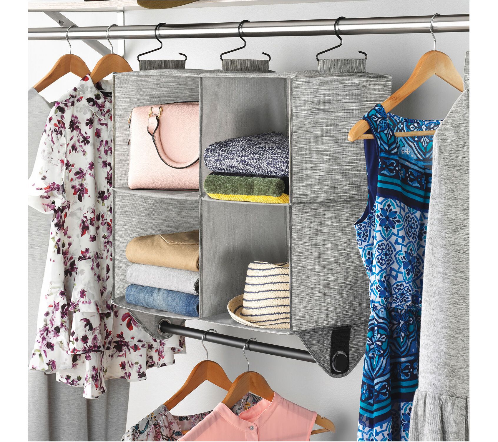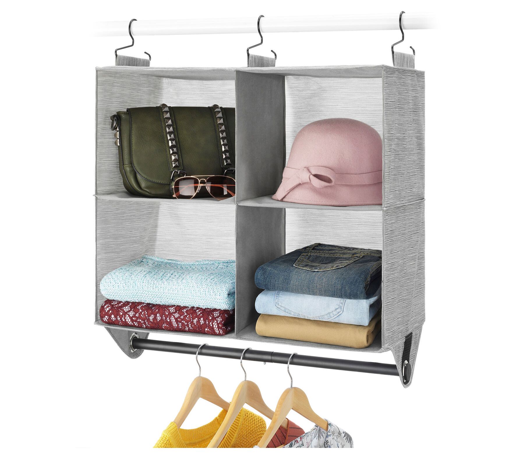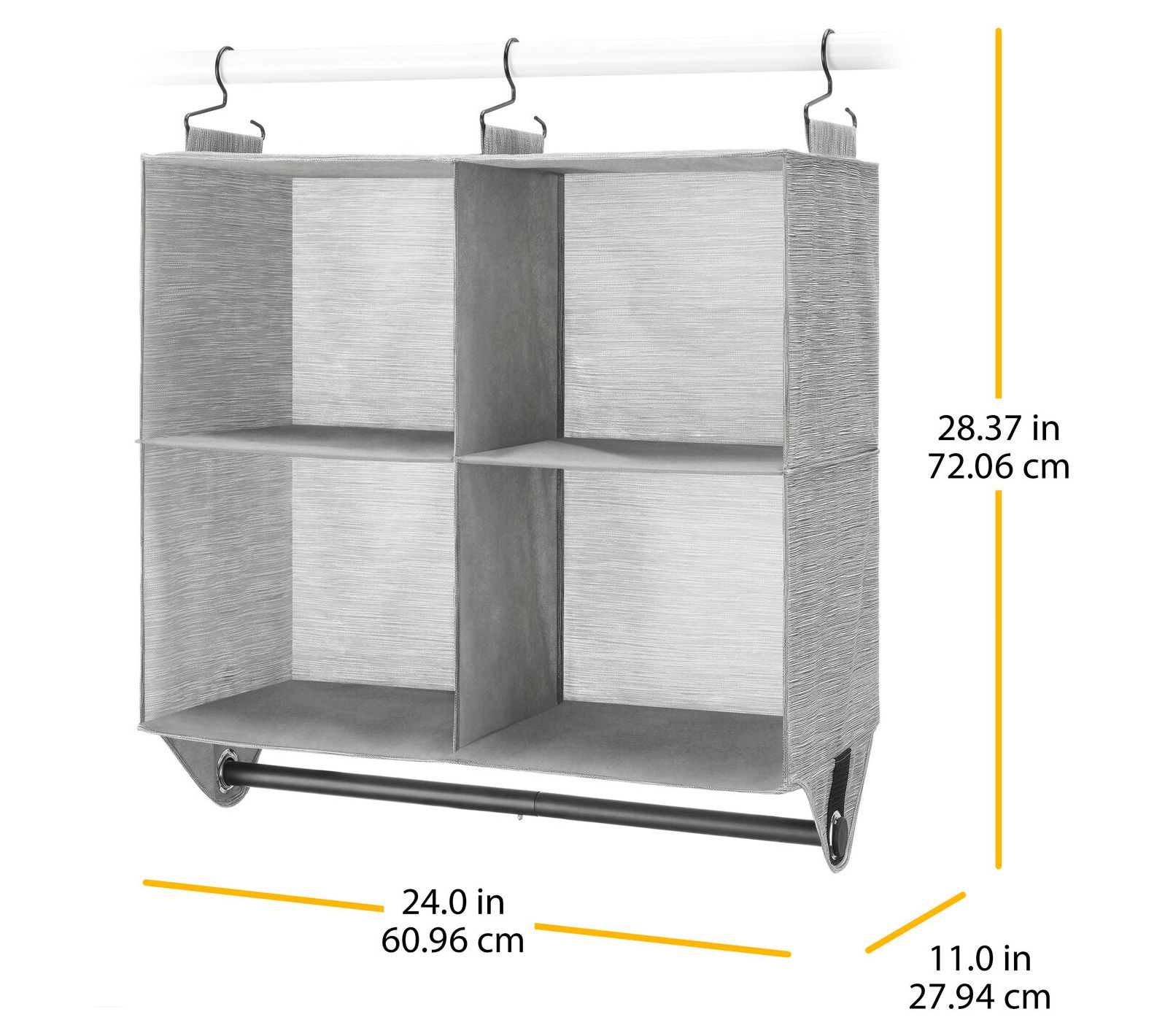 The Whitmor four-section fabric closet organizer with chrome rods keeps your hanging and folded garments neatly organized. It features large cubbies for storing sweaters, bags, and other accessories, plus a bottom garment rod for extra hanging space. Suitable for any closet rod, it's easy to care for -- simply wipe with a clean damp cloth. From Whitmor.