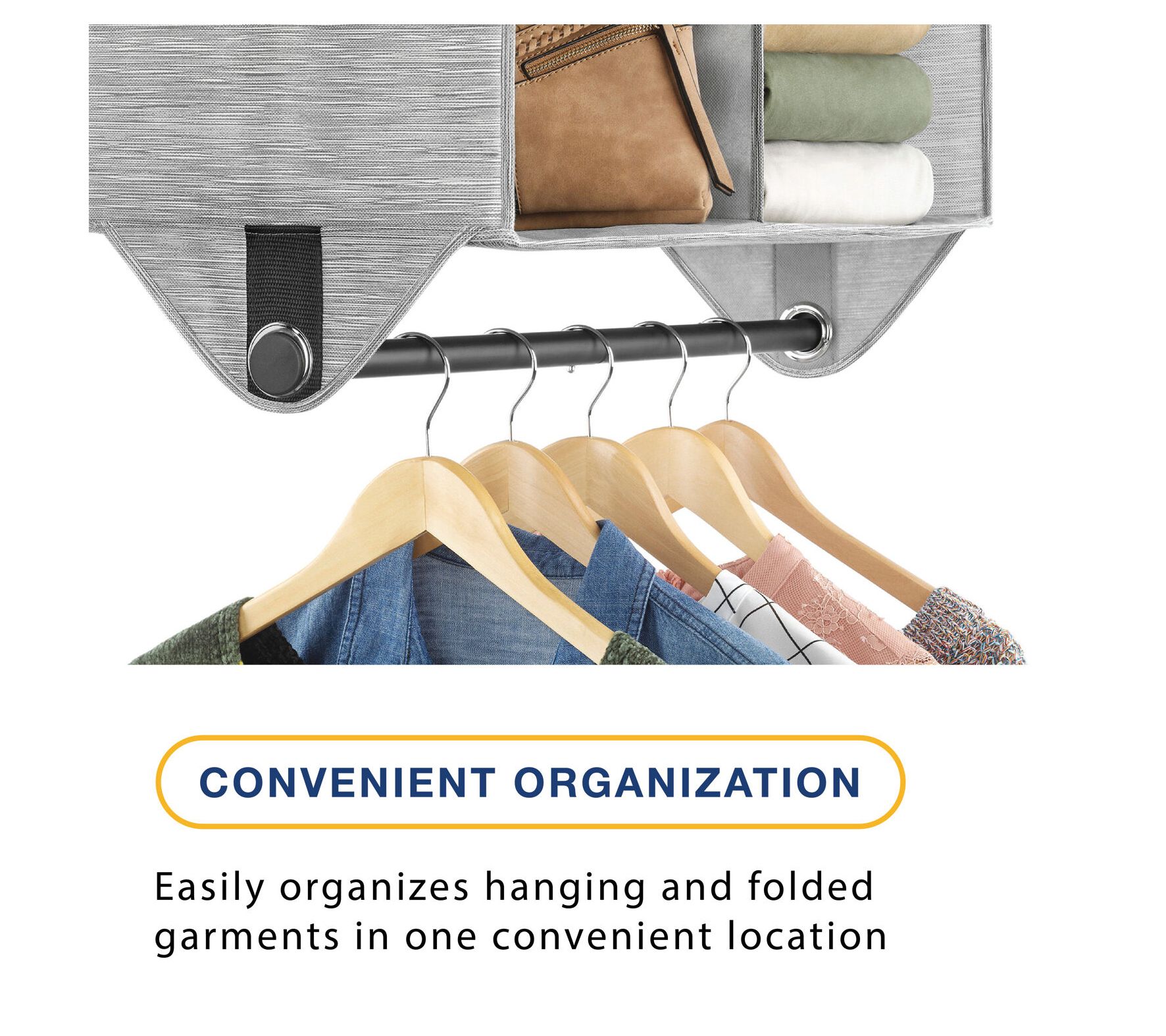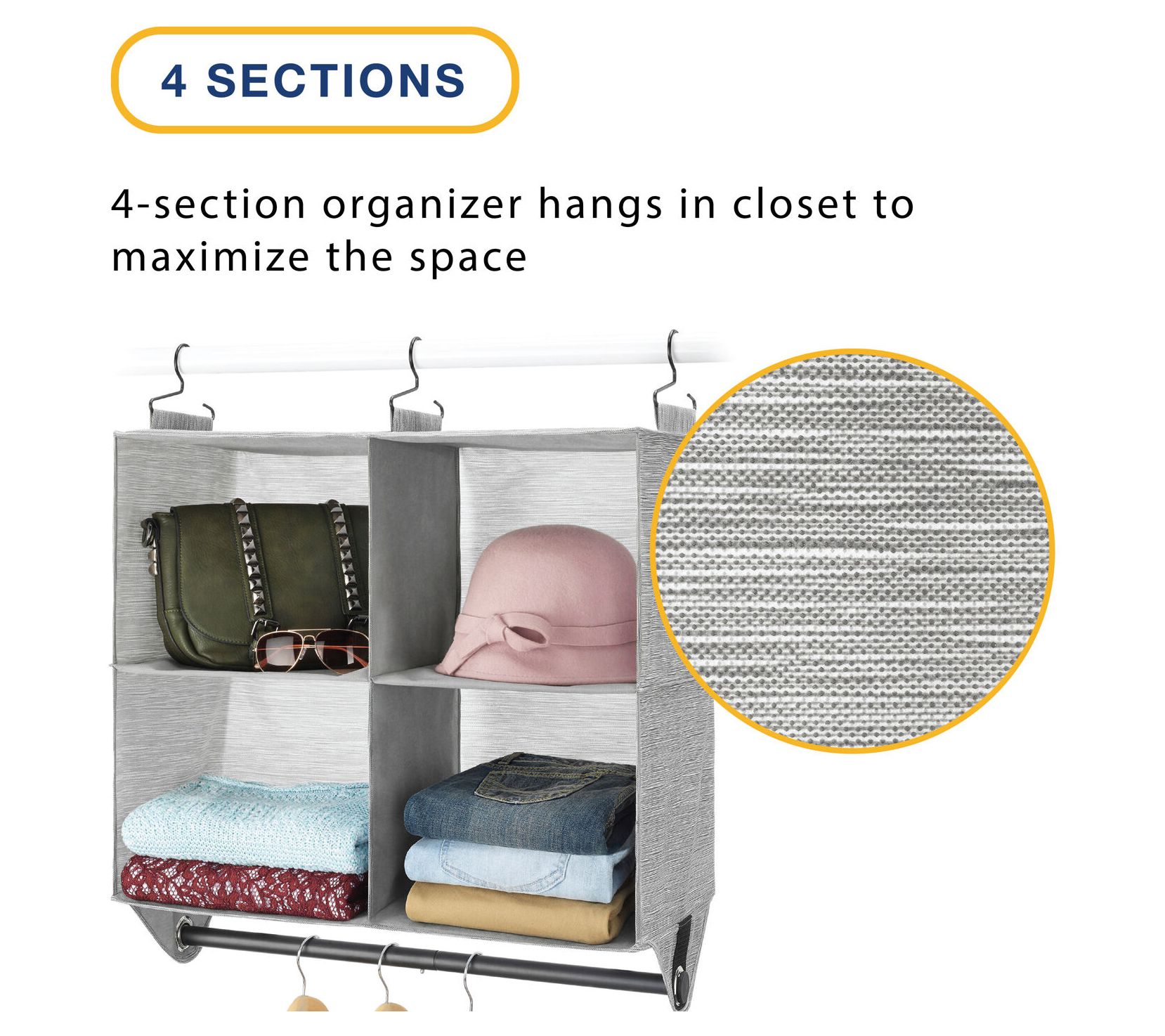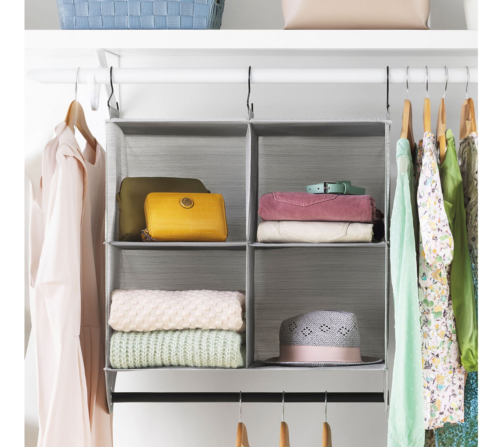 The Whitmor four-section fabric closet organizer with chrome rods keeps your hanging and folded garments neatly organized. It features large cubbies for storing sweaters, bags, and other accessories, plus a bottom garment rod for extra hanging space. Suitable for any closet rod, it's easy to care for -- simply wipe with a clean damp cloth. From Whitmor.