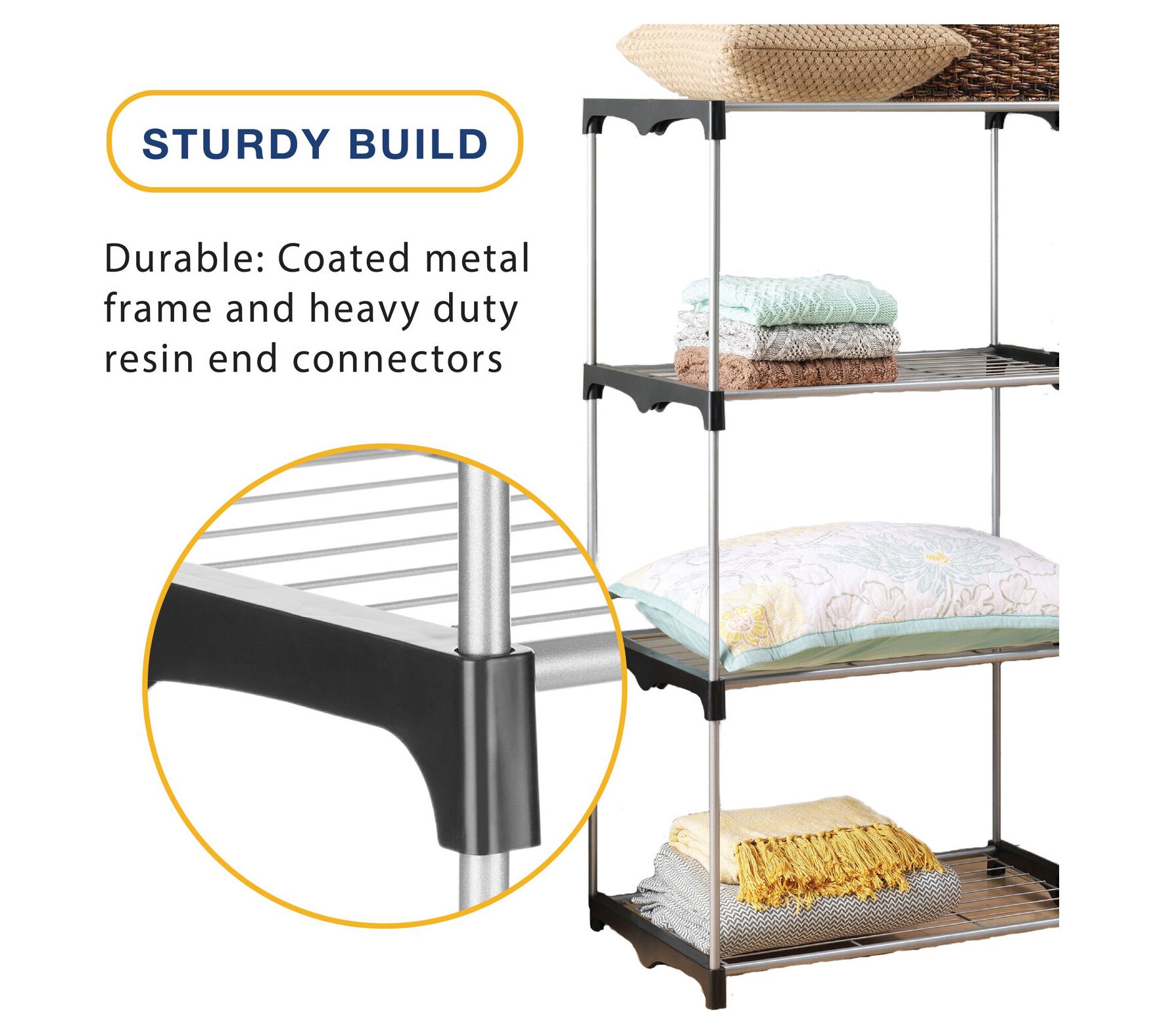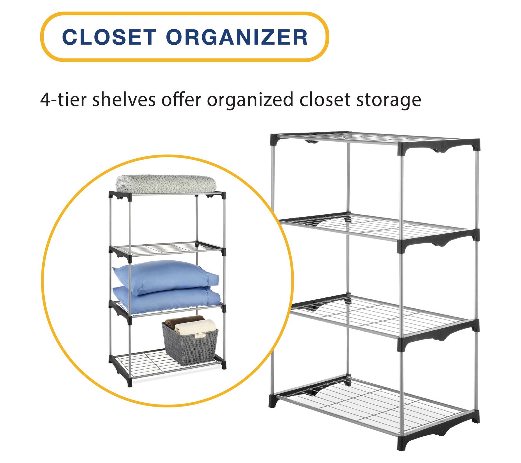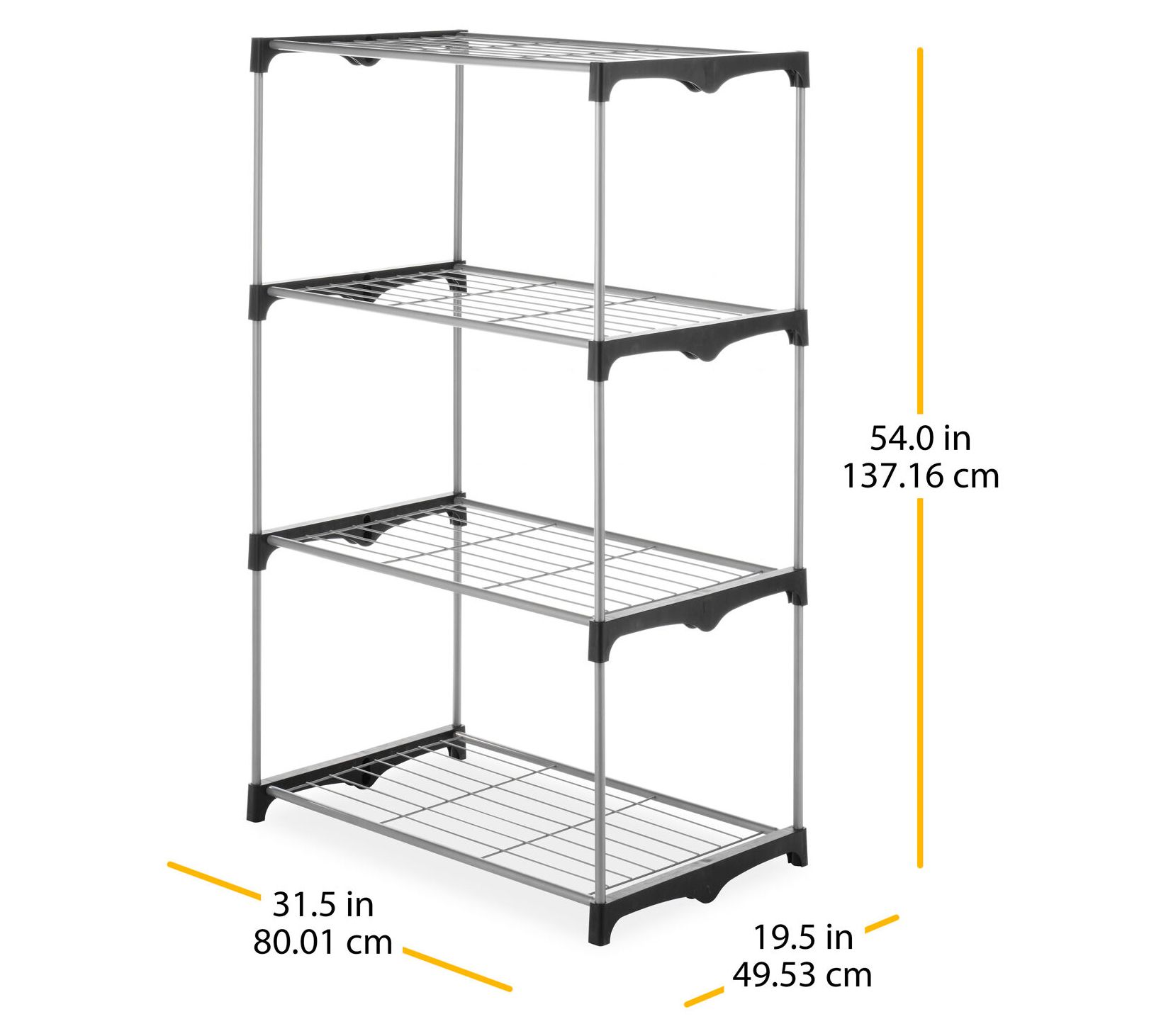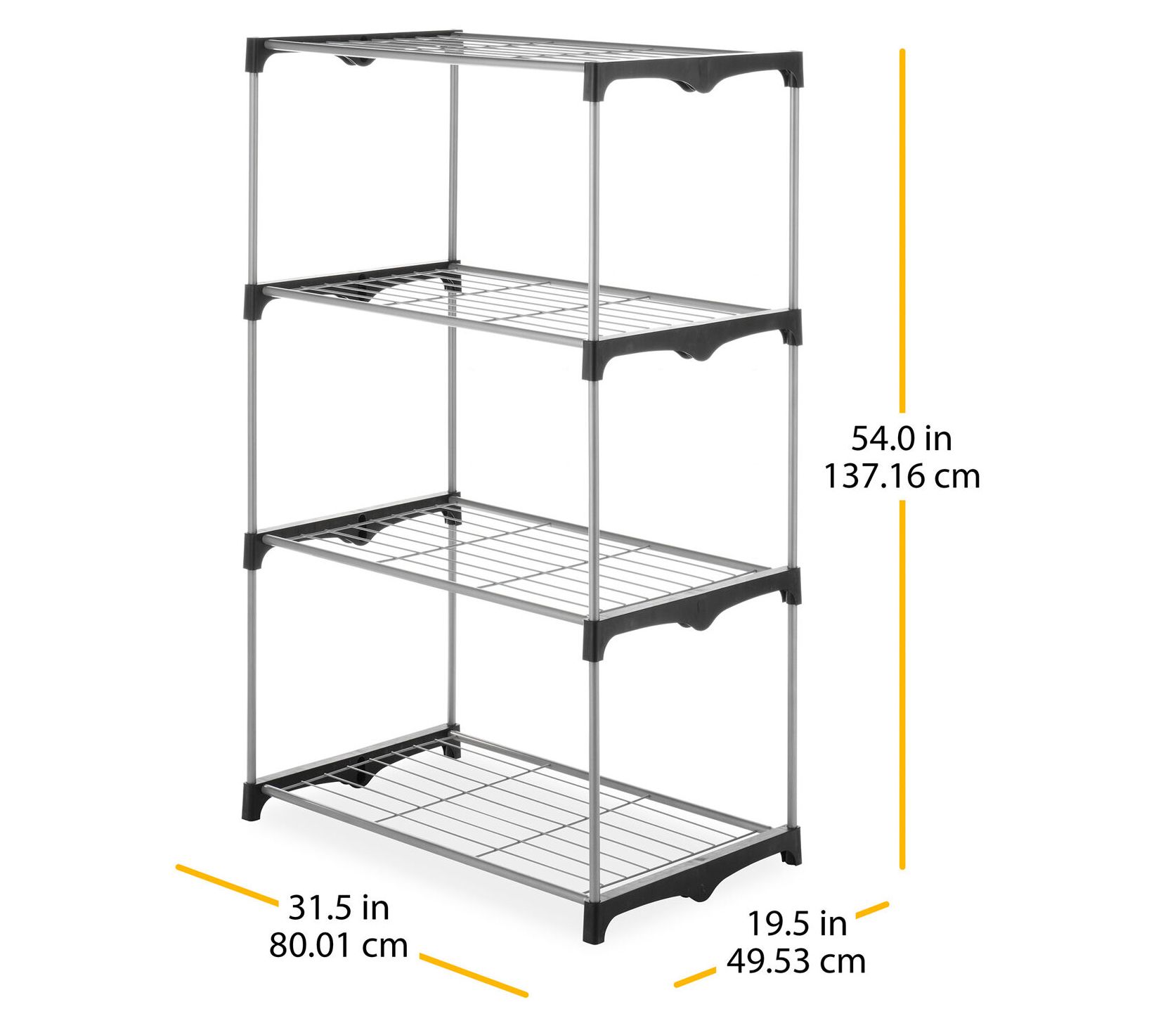 Add extra storage space effortlessly with Whitmor's four-tier closet shelves. With extra-strong wire shelves and heavy-duty resin end connectors, this unit offers robust storage for your closet, basement, laundry room, or anywhere you need it. Easily set up without any tools, it provides a convenient and neat way to store and access your clothes. From Whitmor.