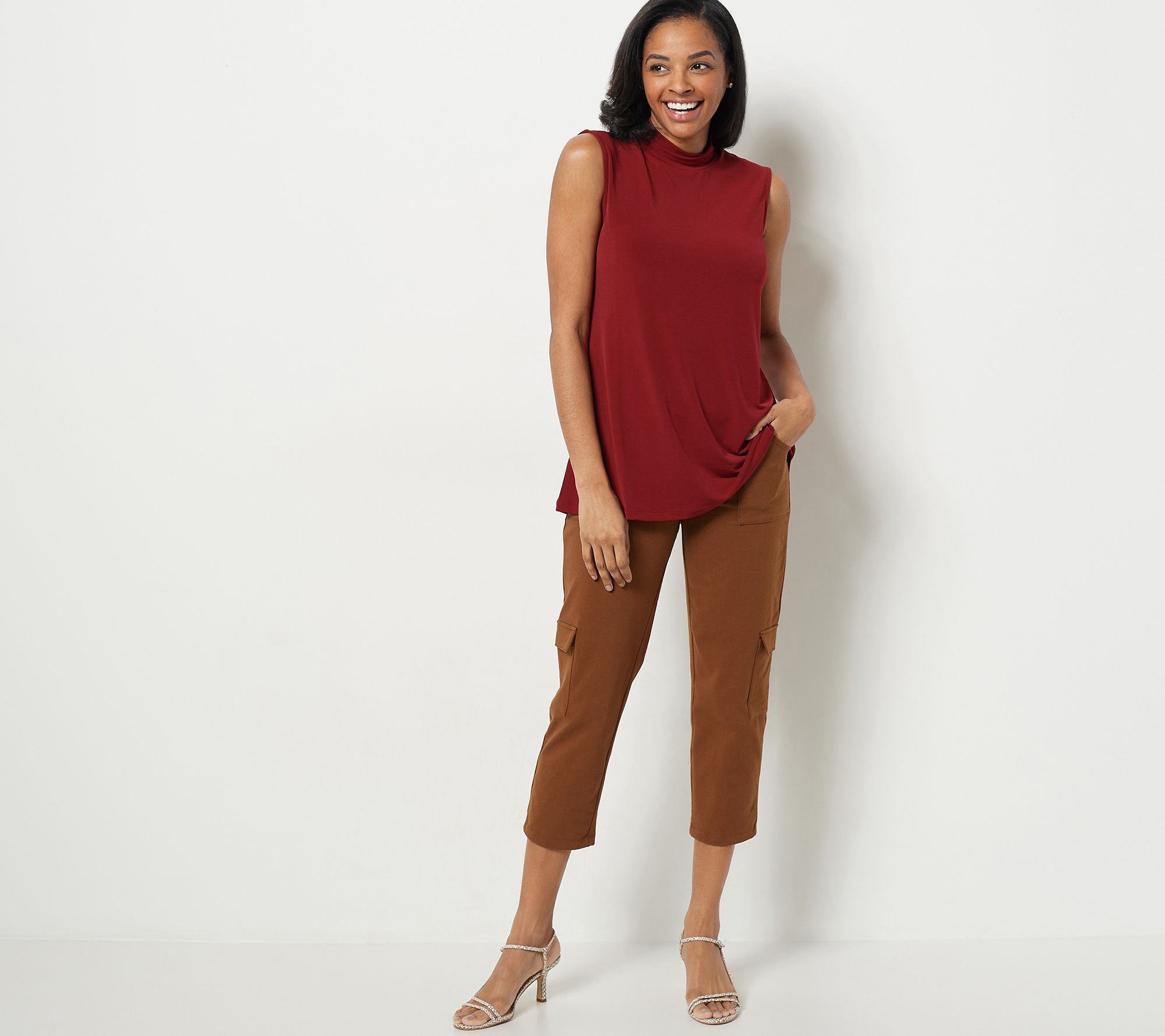 Wicked by Women with Control, tall, cropped, pants, with cargo pockets, features contour waist. Fitted-Cut to follow the lines of the body;Slightly below;Slim leg._ Inseam: 26 1/2"._________ Content: 54% Cotton/30% Polyester/16% Spandex. Care: MWC/WS/ONCBWN/TDL/RP/WIIN. COO: Imported.