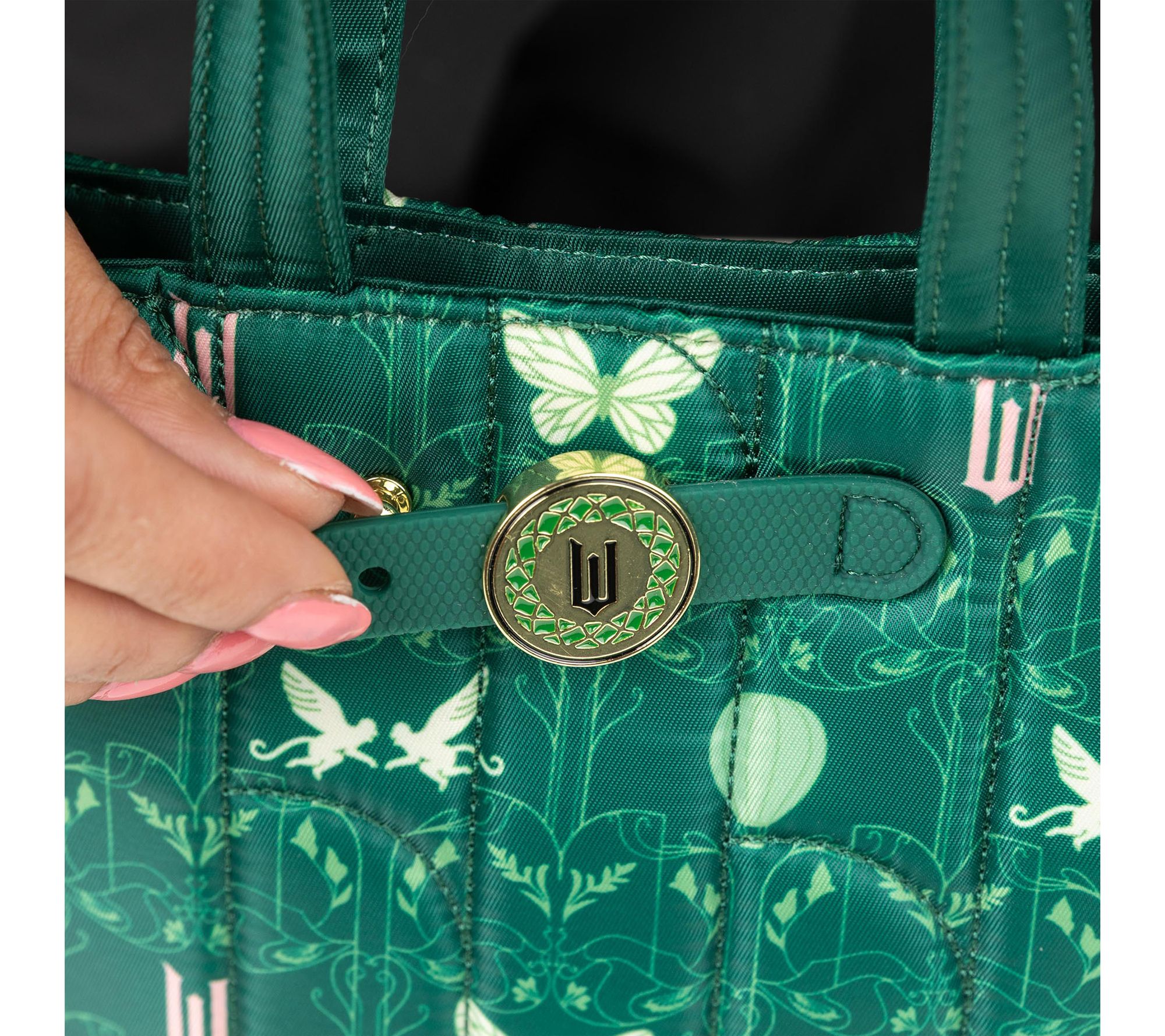Water-repellent quilted exterior, main compartment with magnetic snap closure, tote handles, removable/adjustable crossbody strap, D-rings, charm bar, goldtone hardware