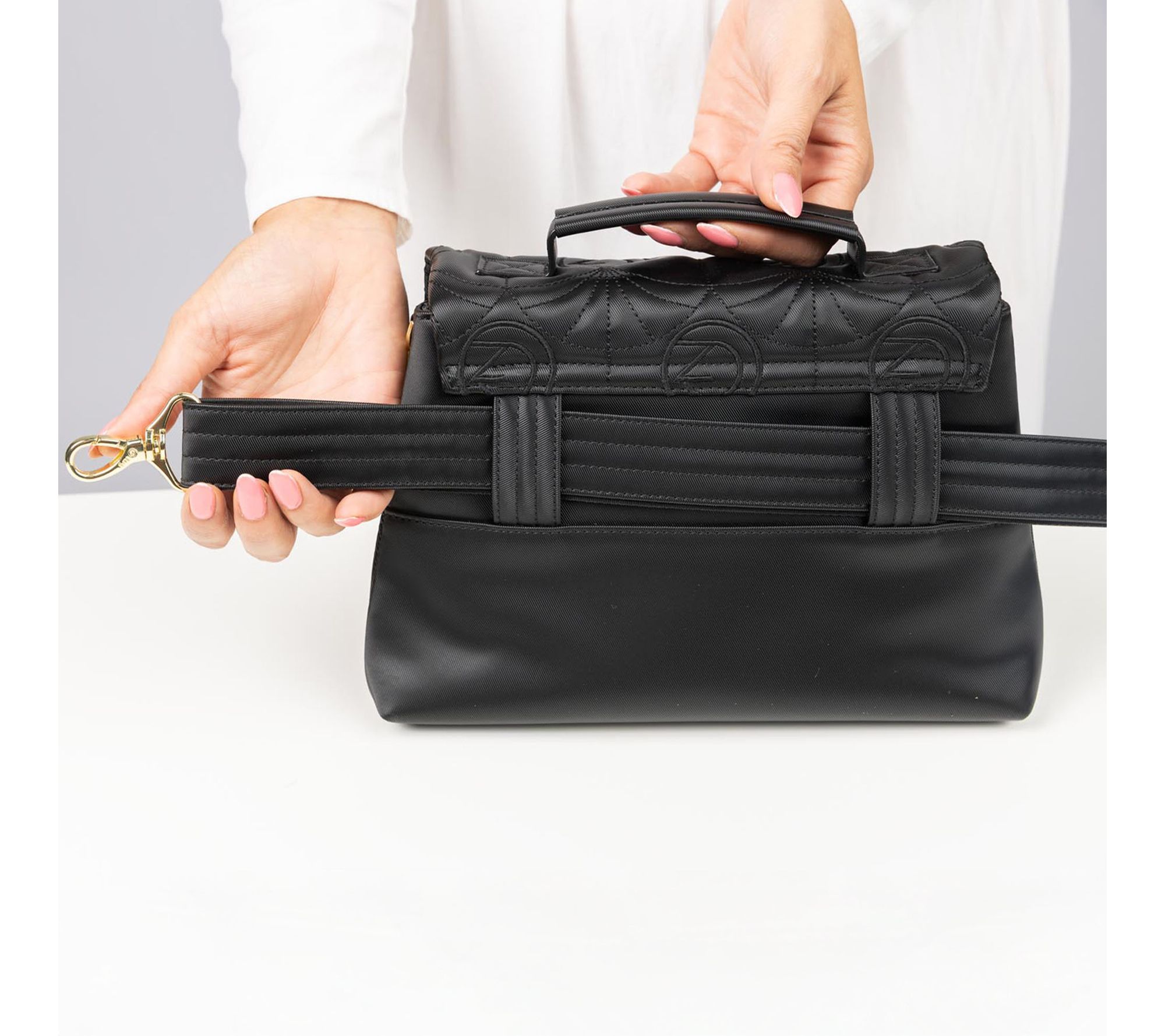 Removable chain metal strap, adjustable/removable crossbody strap, top handle with silicon grip, snap lock closure, goldtone hardware