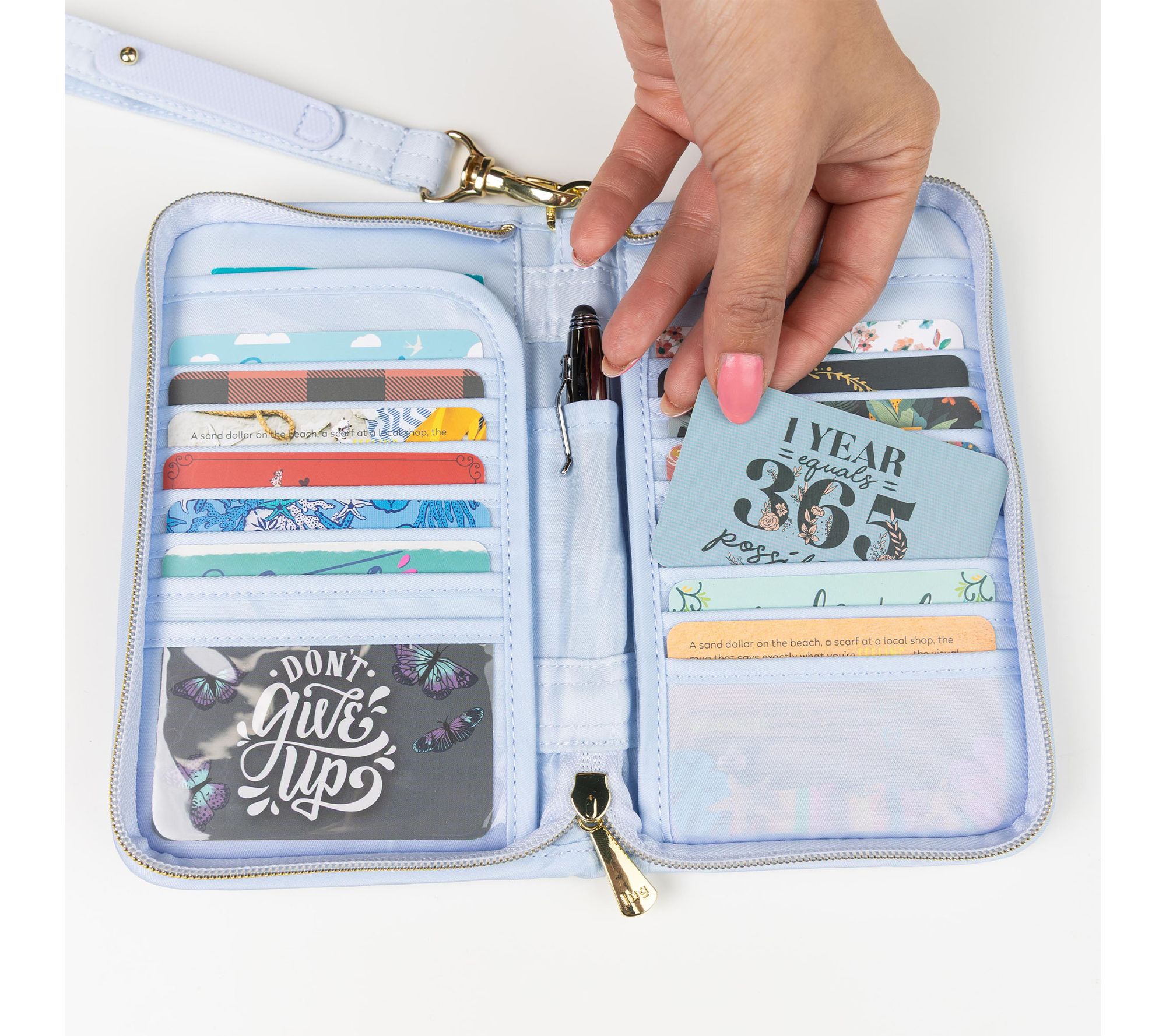 14 card slots, clear-view card slot, two bill slots, D-ring