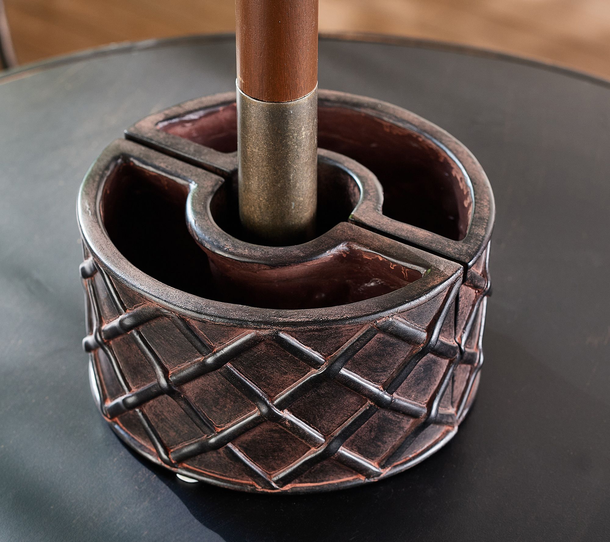Perk up your patio table with beautiful blooms, fancy foliage, or even fresh herbs. You pick what to display in this two-piece planter that conveniently curves around the umbrella pole. From Wicker Park.