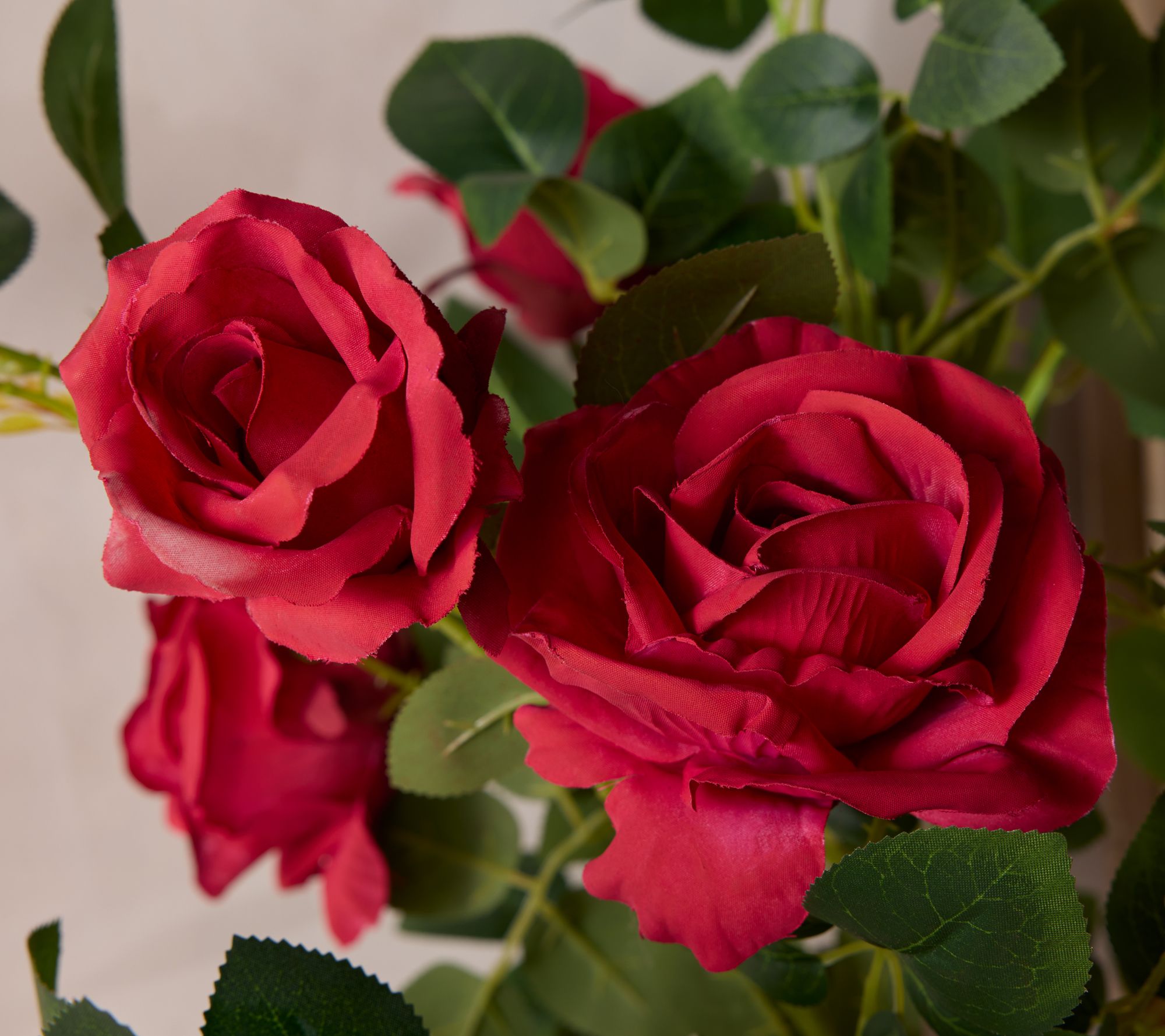 • Realistic roses and vibrant greens in a decorative pot