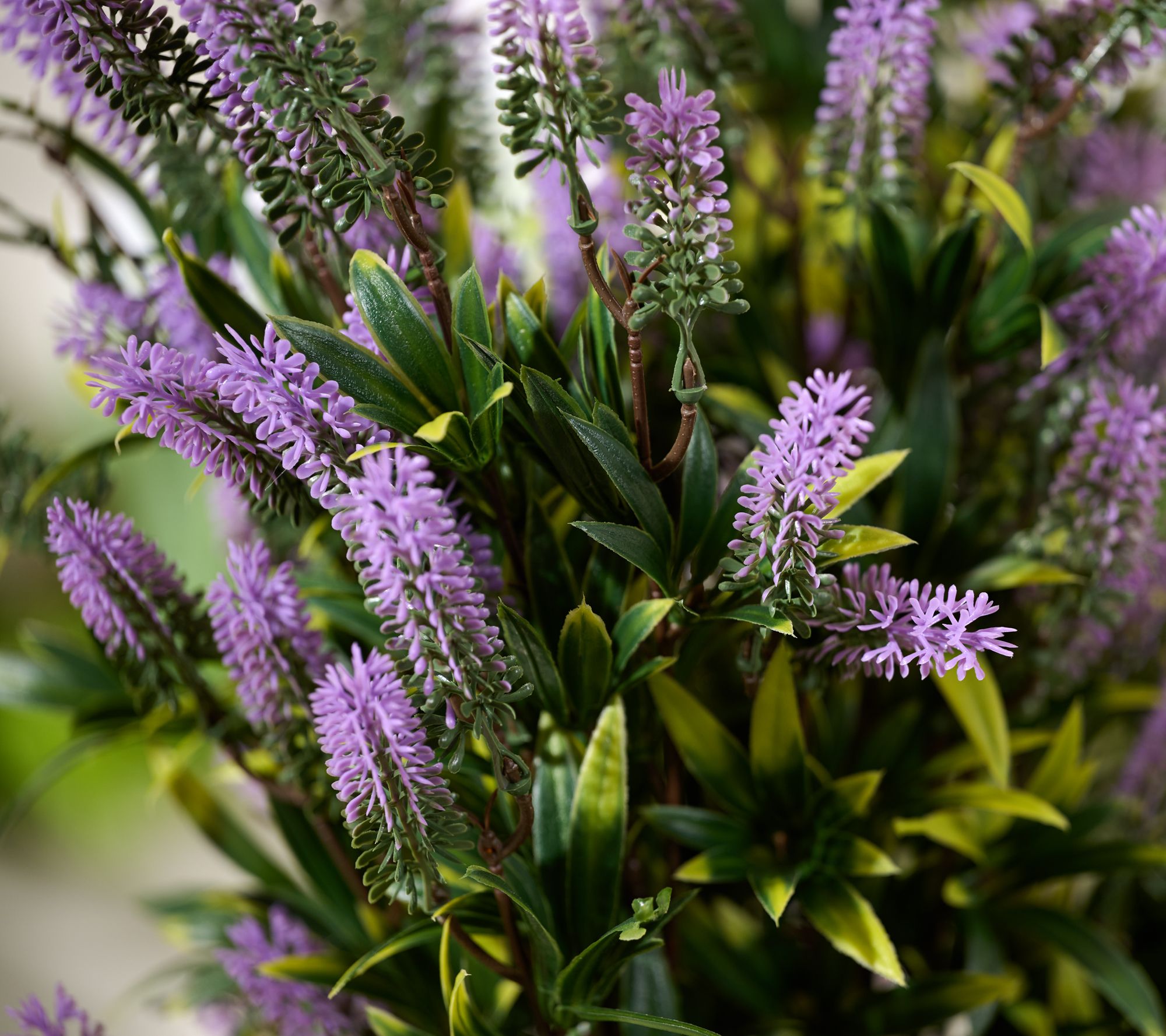 • Decorative pot with faux lavender blooms and textured greenery
