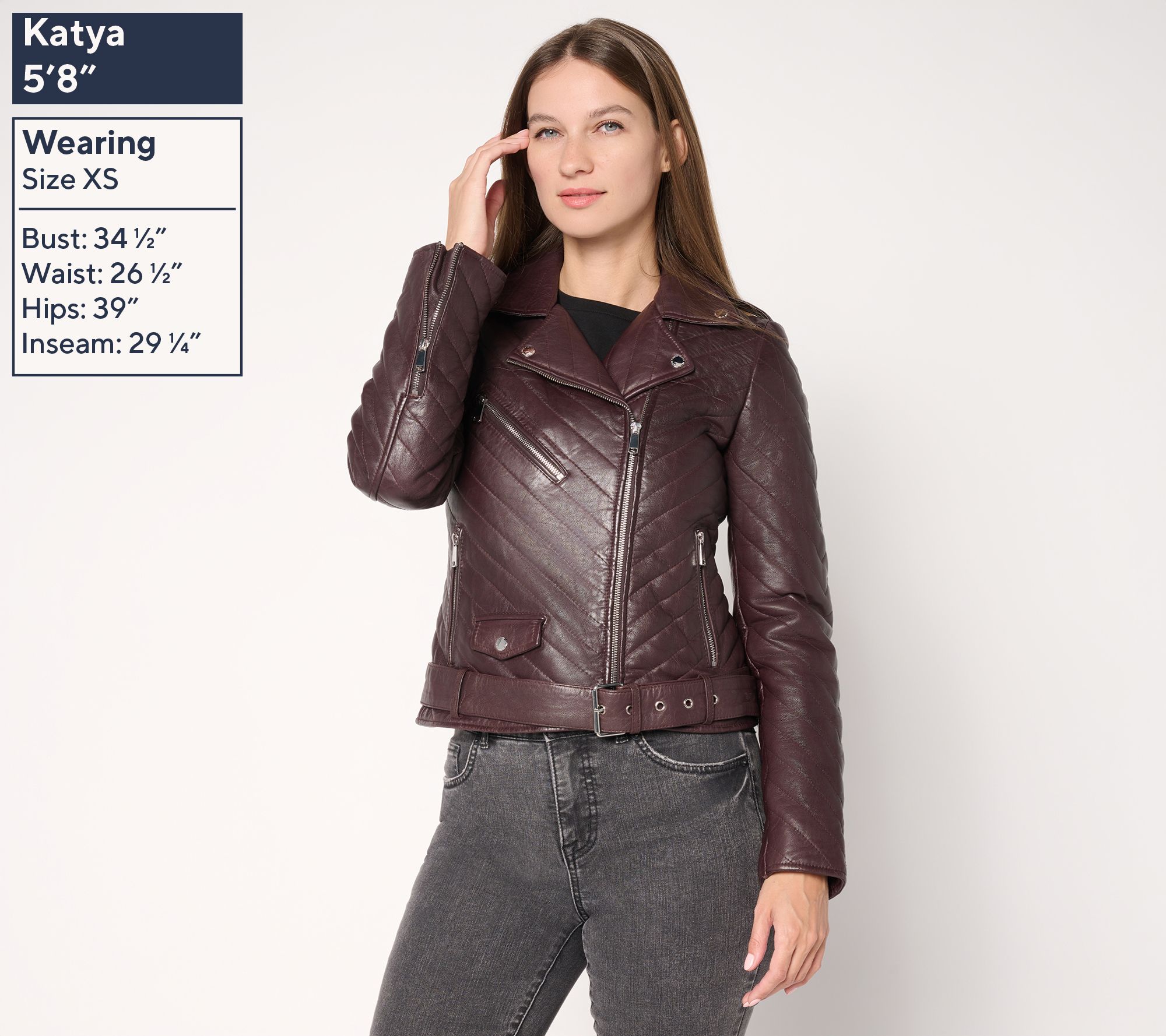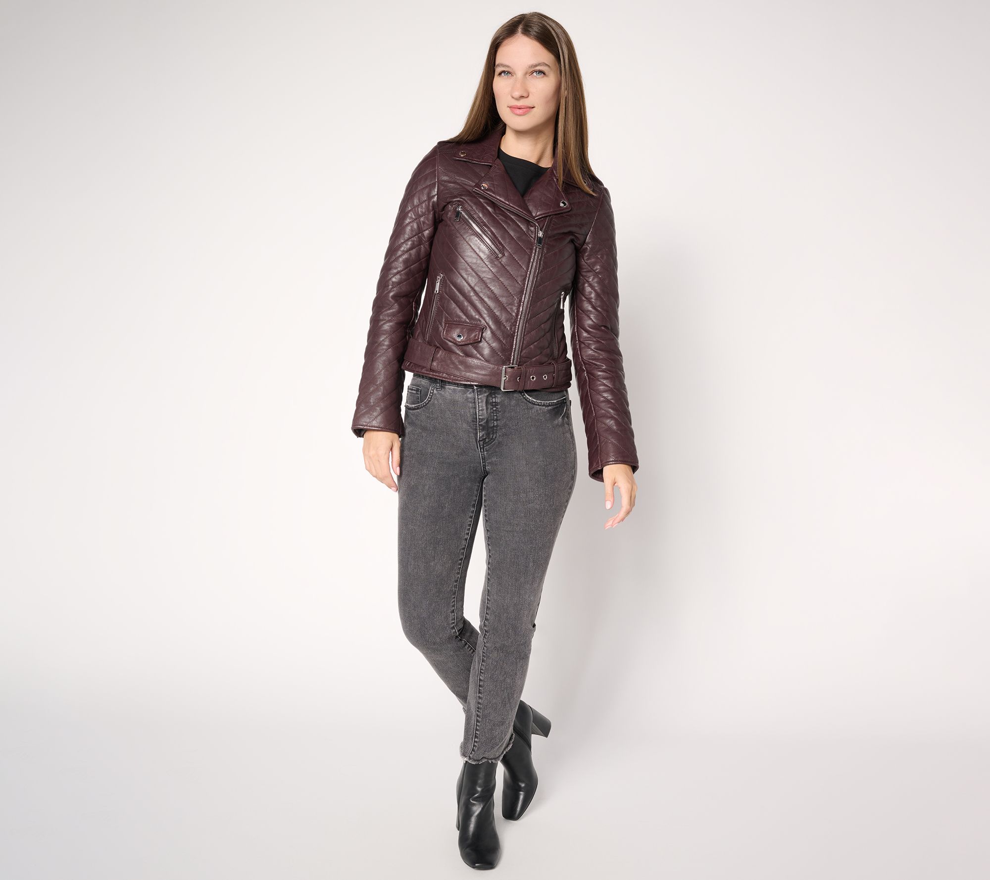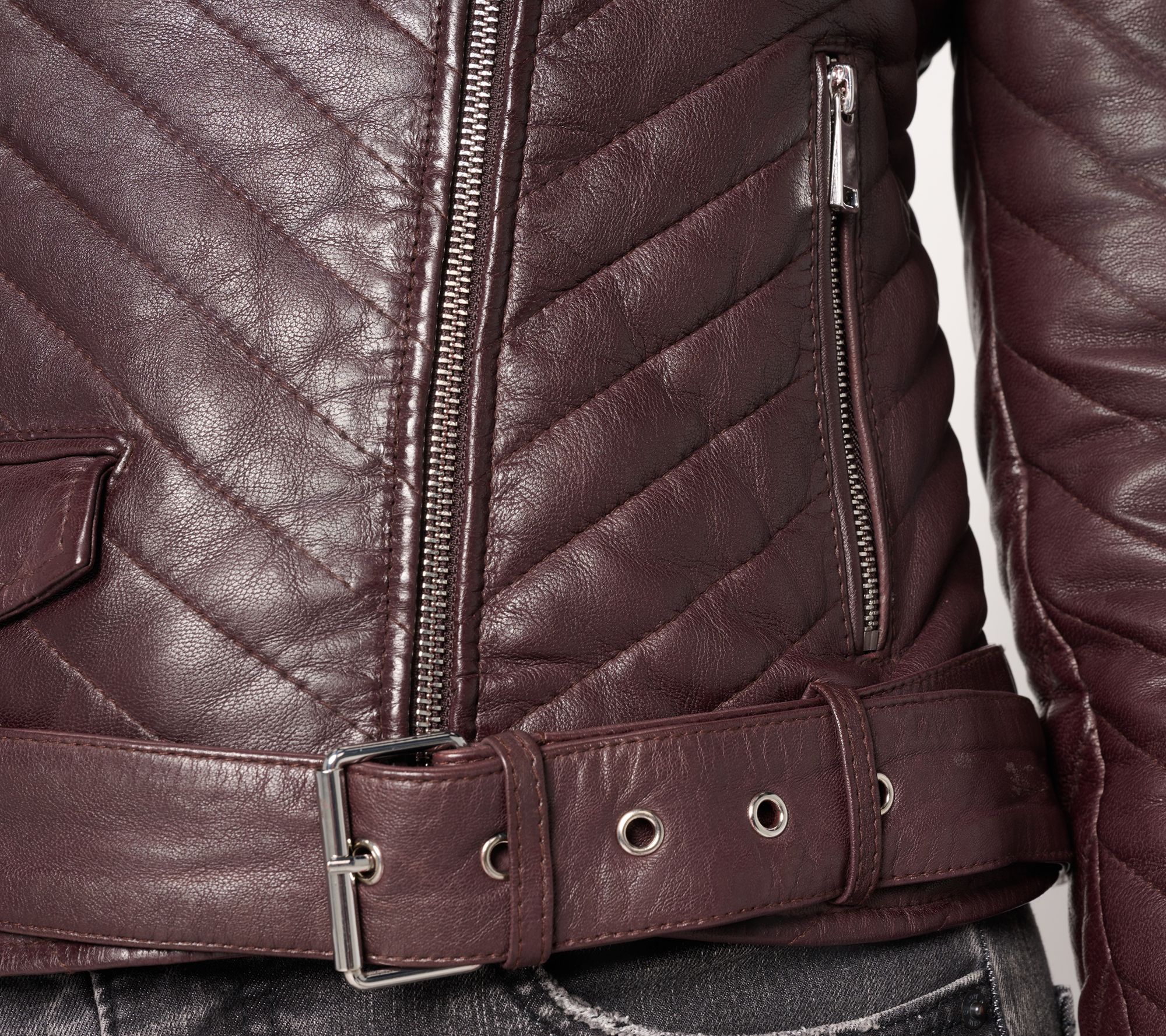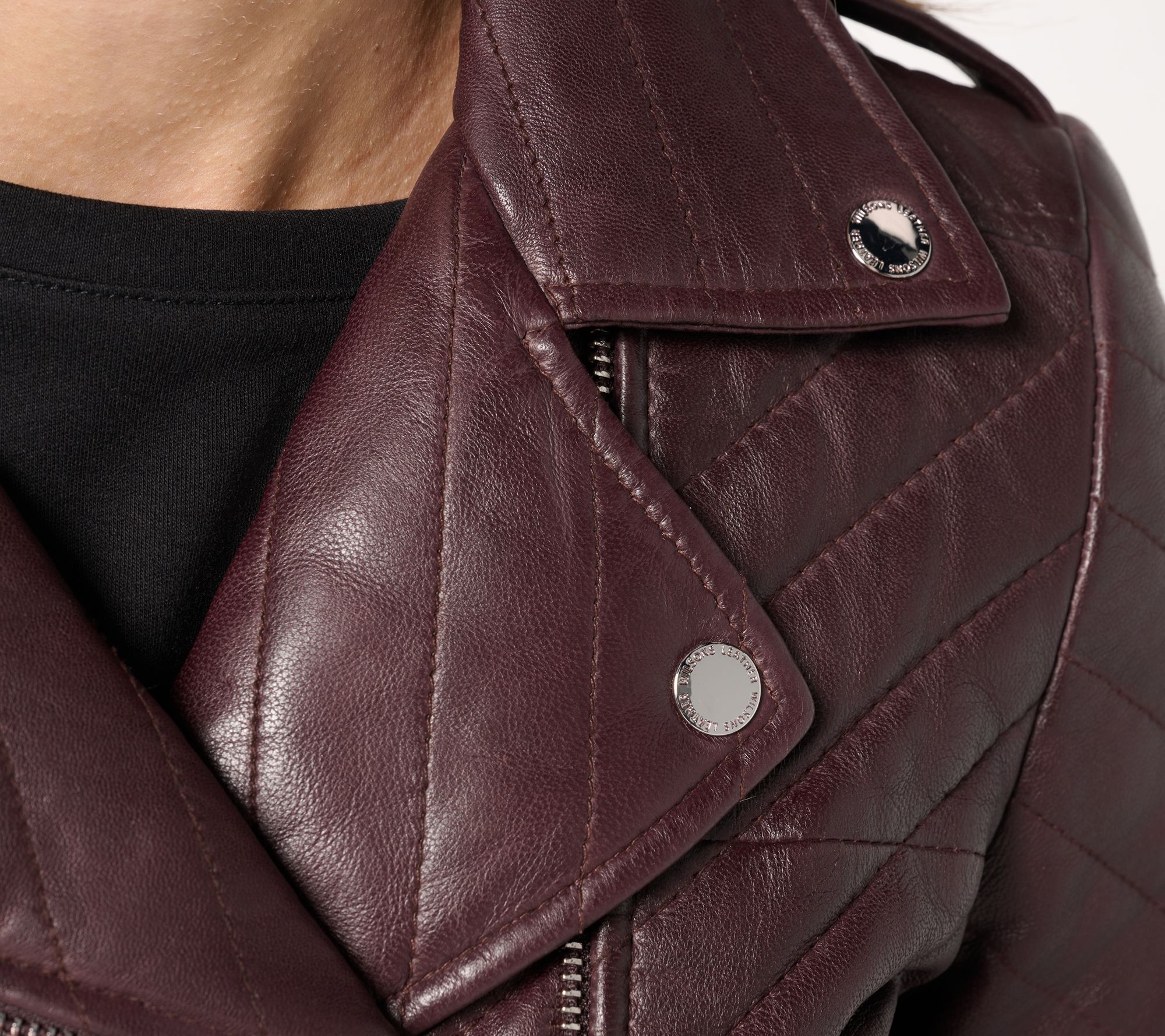 Turn heads on city streets or at evening gatherings in this moto jacket, where chevron quilting and bold hardware bring a modern twist to classic style. The removable lets you customize your look, while zippered details provide an edge. From Wilson's Leather.
