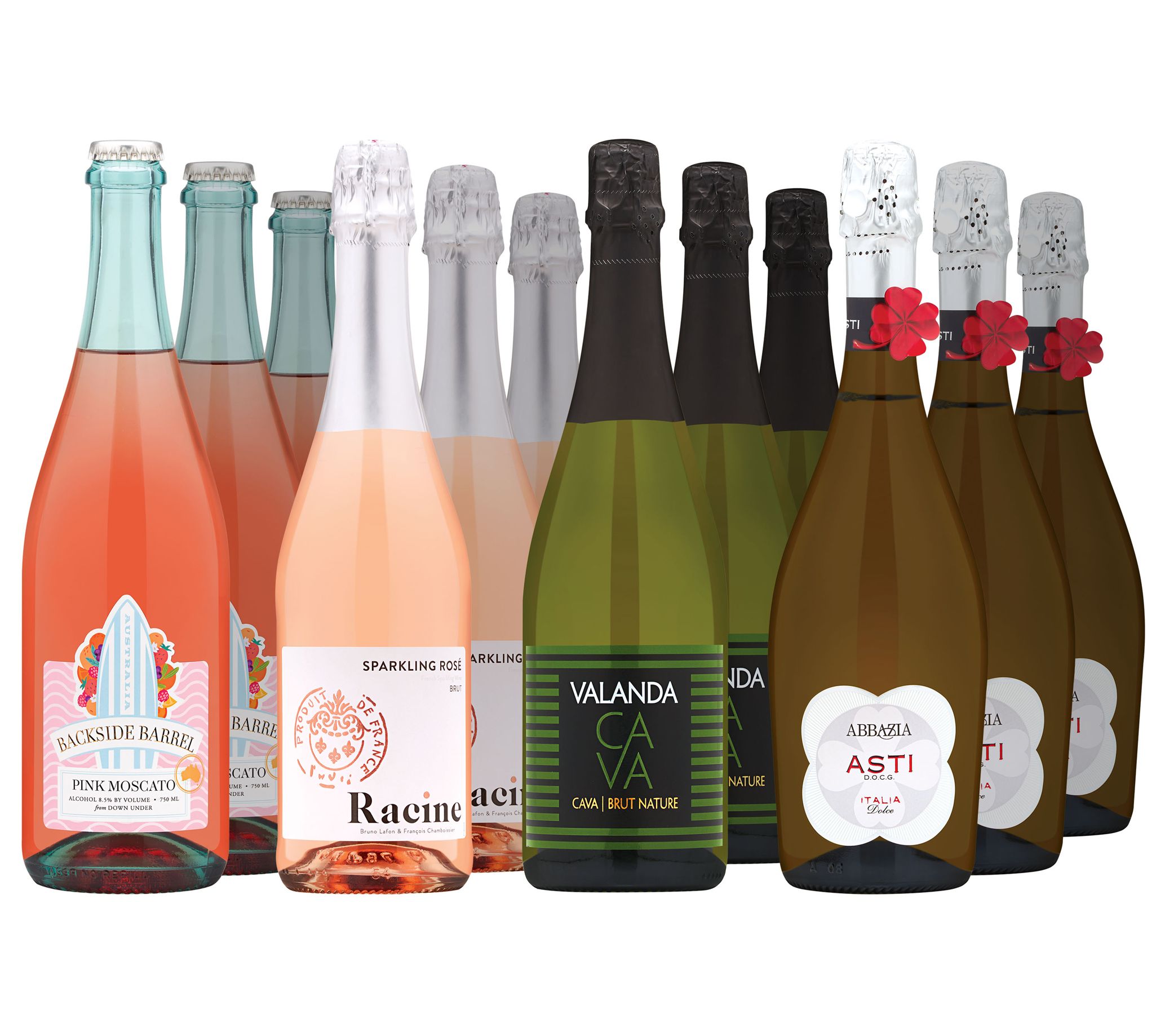 • Includes twelve 750-mL bottles of wine: three bottles each of Backside Barrel Pink Moscato Australia NV, Racine Sparkling Brut Rose France NV, Abbazia Asti Spumante Sparkling D.O.C.G. Italy, and Valanda Cava Brut Nature Spain NV