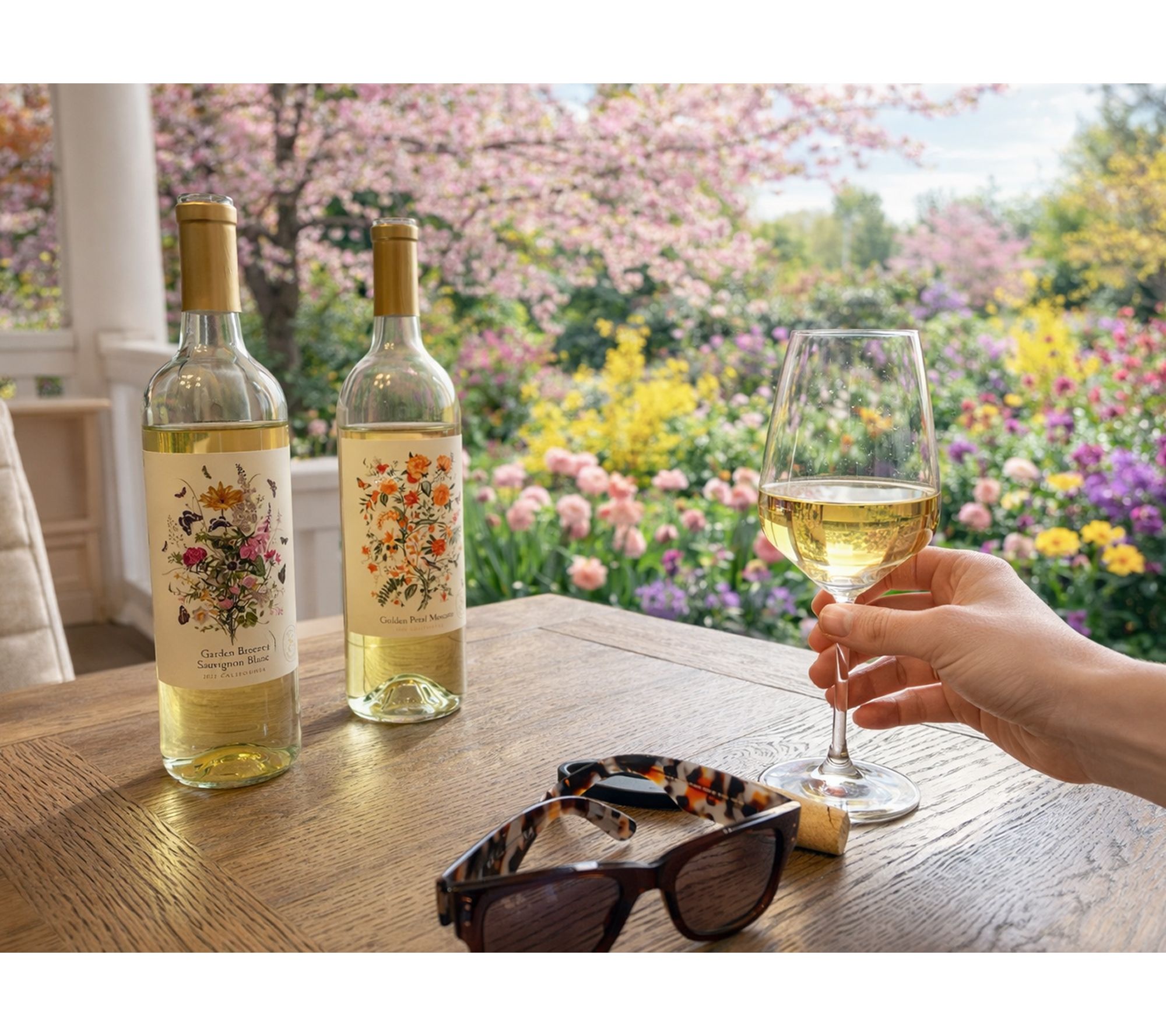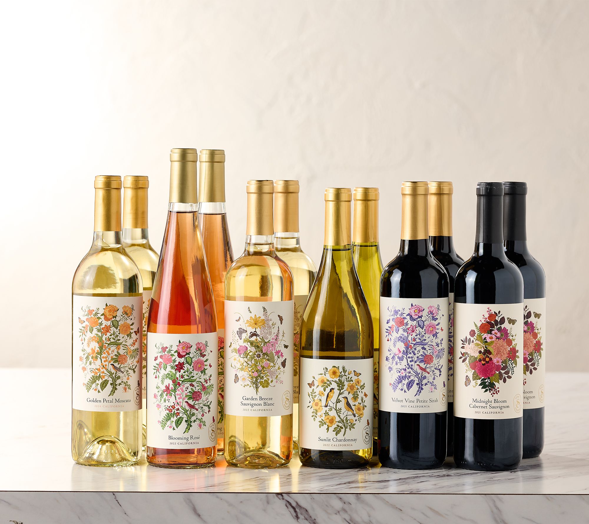 • Mixed: two bottles each of Golden Petal Moscato, Blooming Rose, Garden Breeze Sauvignon Blanc, Sunlit Chardonnay, Velvet Vine Petit Sirah, and Midnight Bloom Cabernet Sauvignon