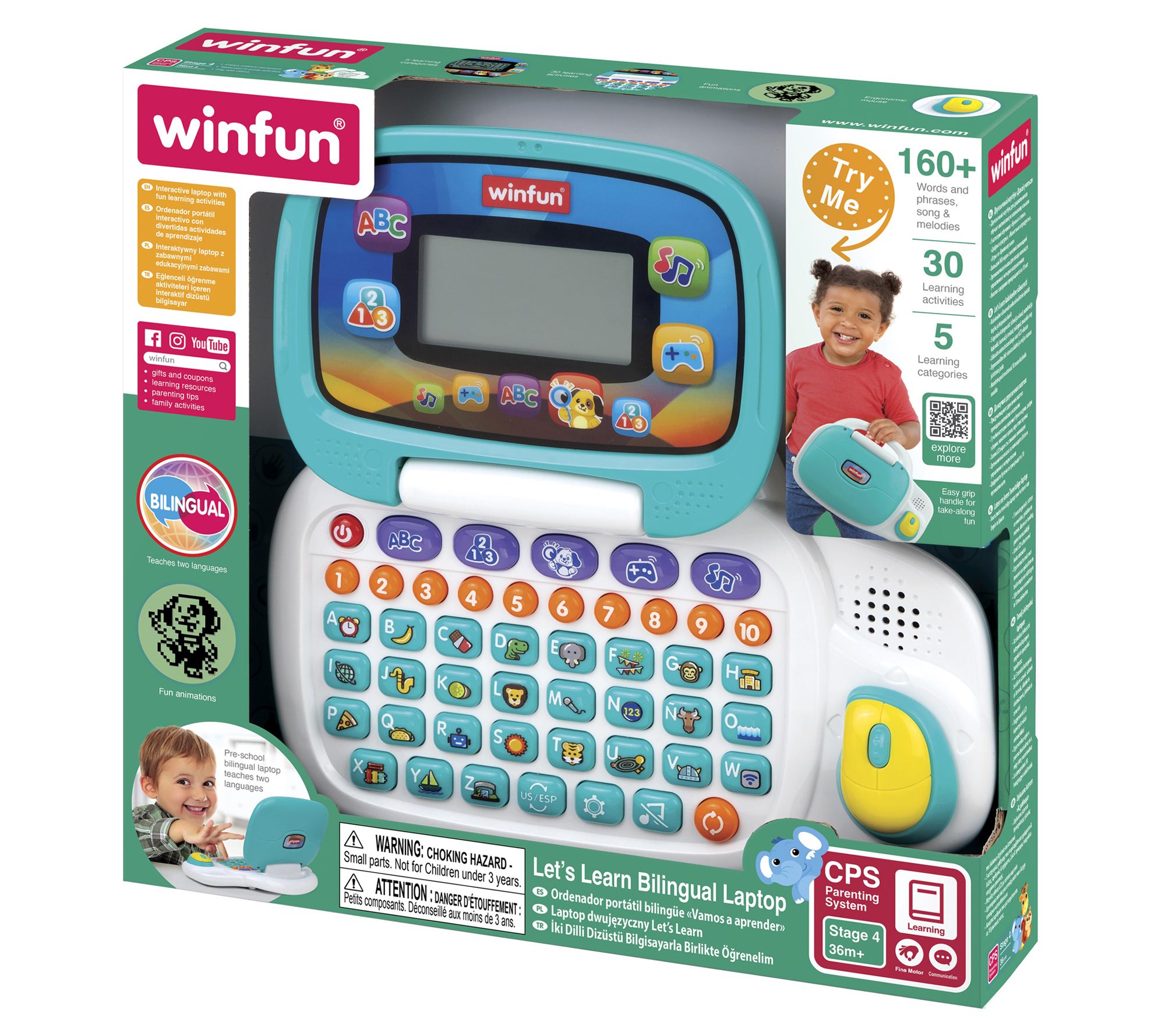 Introduce your little one to the world of learning with the Winfun Portable Bilingual Learning Laptop! This interactive laptop offers educational fun with simple concepts and engaging games across five categories, including Letters & Words and Numbers & Shapes. With a large LCD screen, captivating animations, and bilingual functionality in English and Spanish, this laptop is designed for toddlers aged three and up. From Winfun.