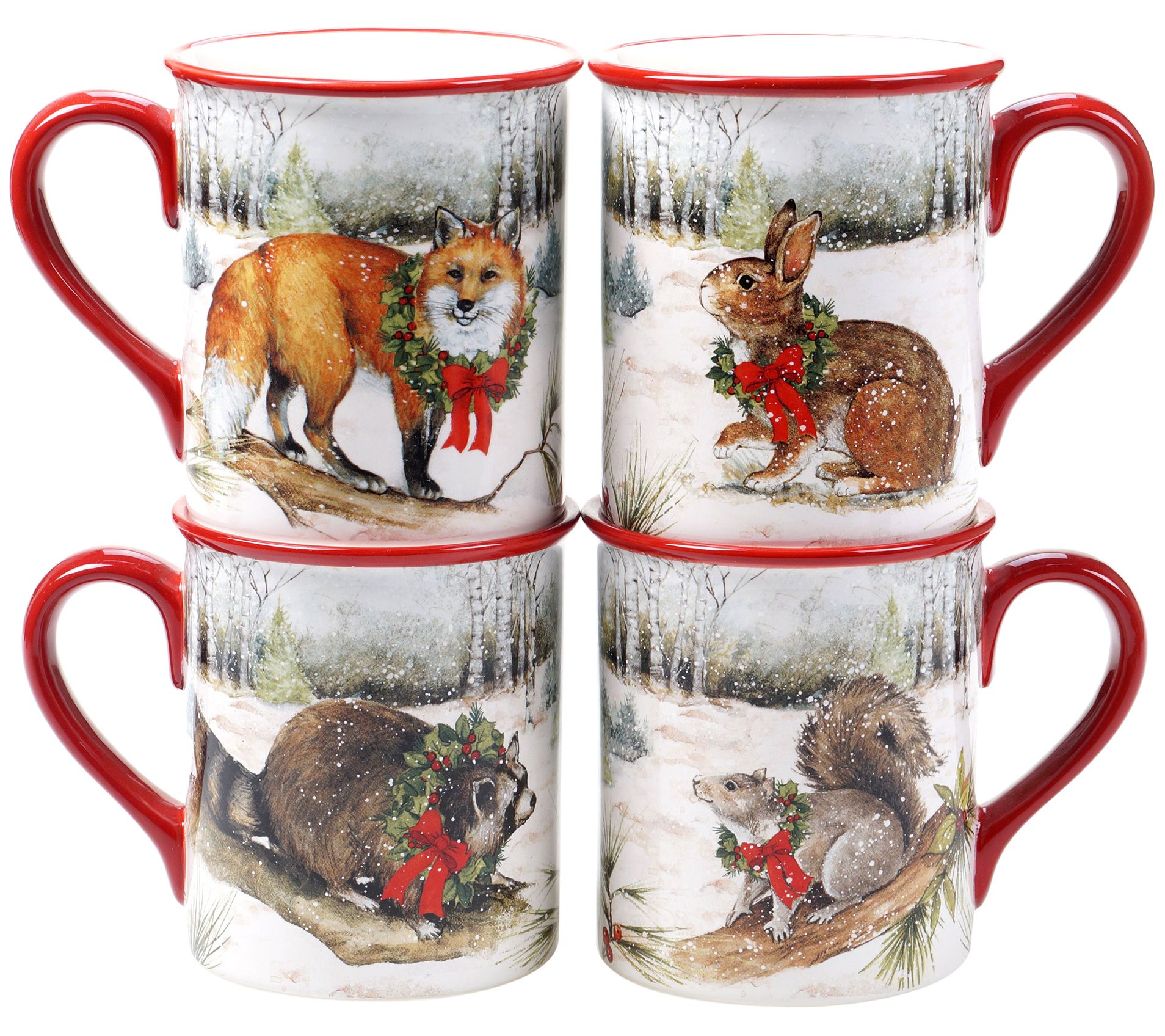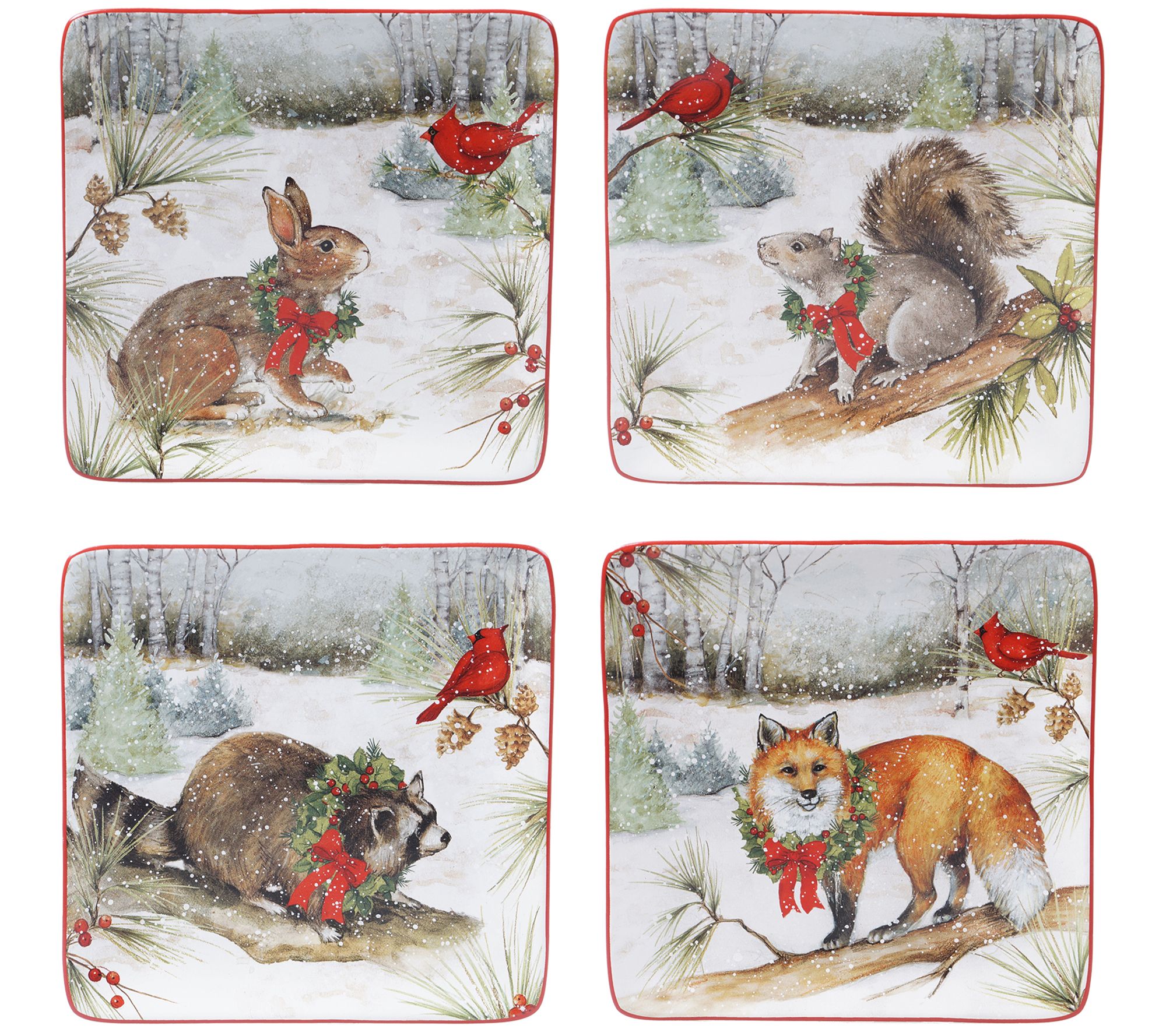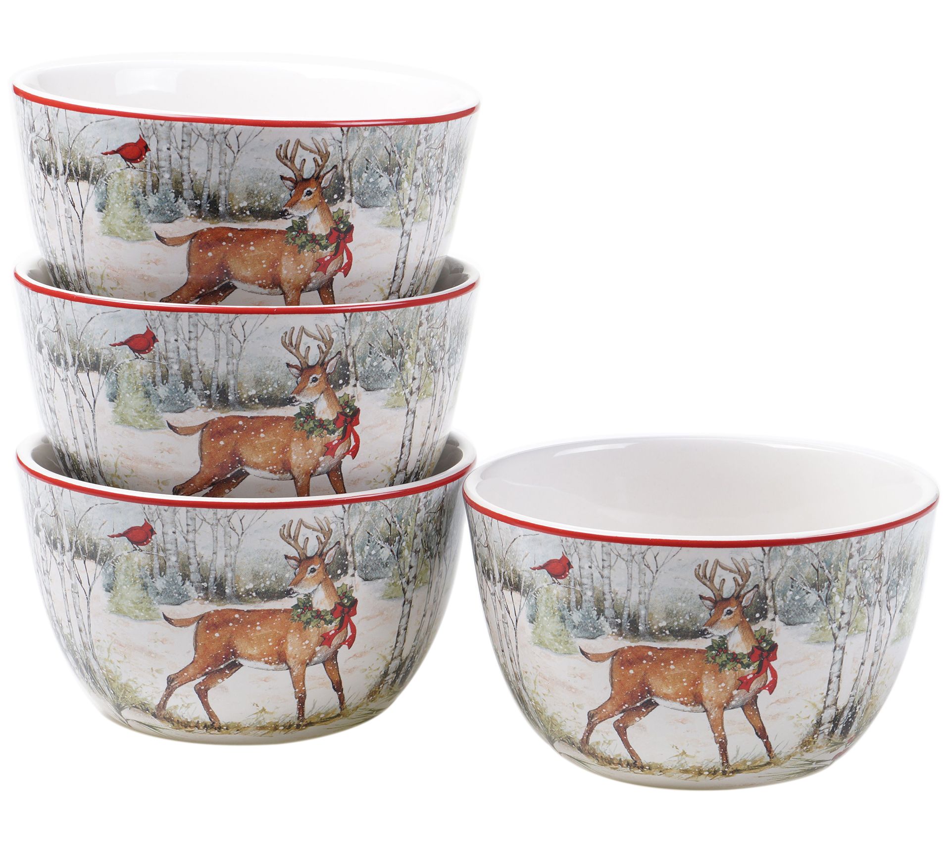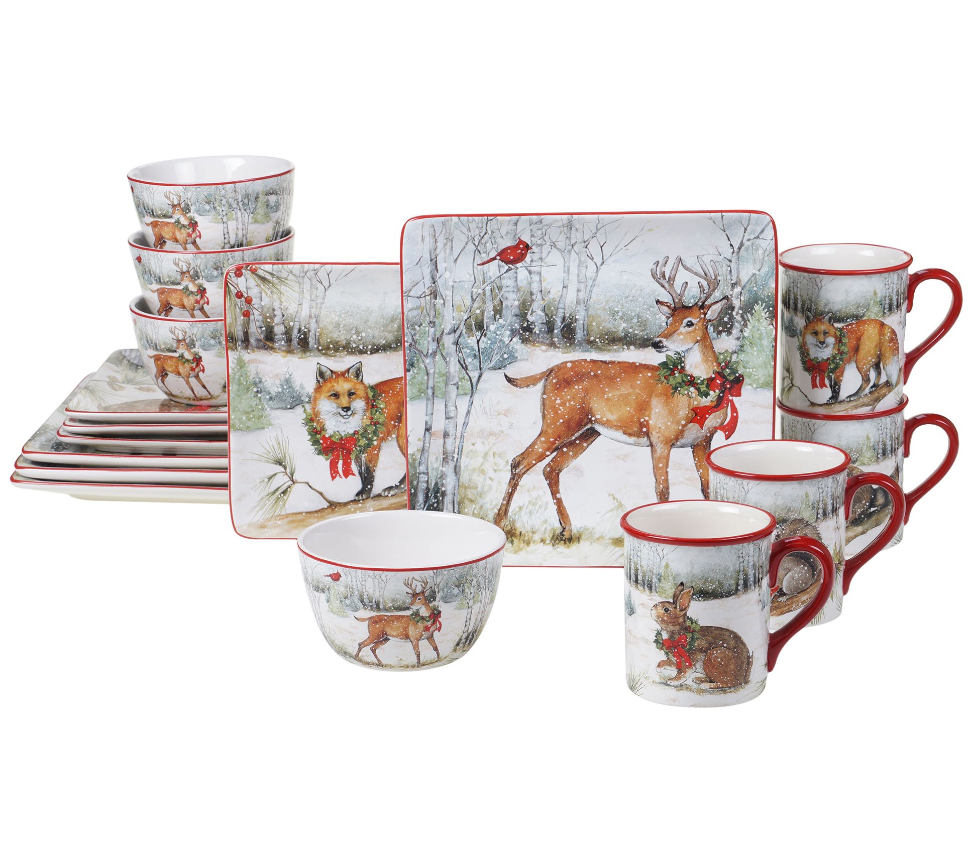 Includes four 10.5" dinner plates, four 8.5" salad plates, four 16 oz mugs, and four 22 oz ice cream bowls