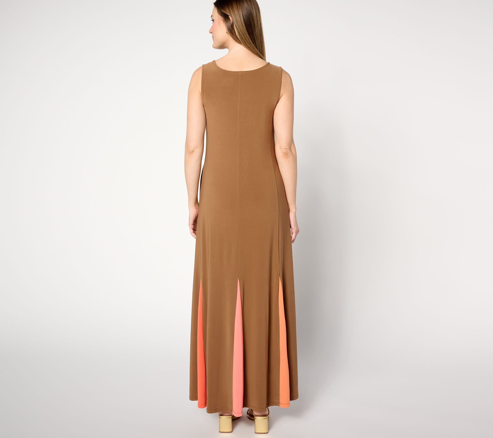 • Features: scoop neckline, sleeveless, A-line flare with godet, solid color, rainbow godet color, maxi length
