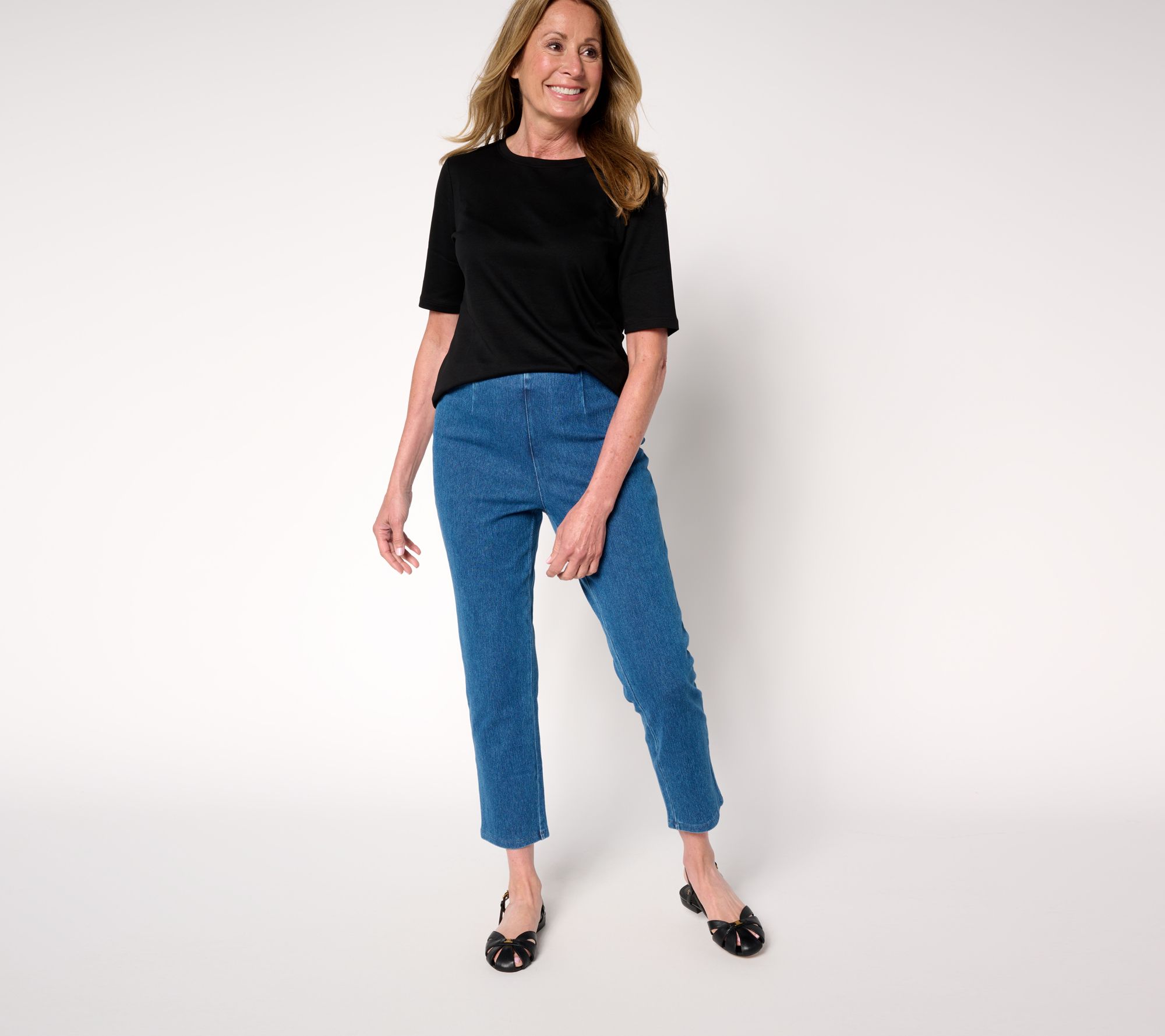 Easy-going mornings and afternoons get a stylish boost with these slim-leg crop pants, crafted with Prime Stretch Denim. The Hollywood waistband provides gentle support, while Tummy Control holds you in for a sleek silhouette. From Women with Control®.