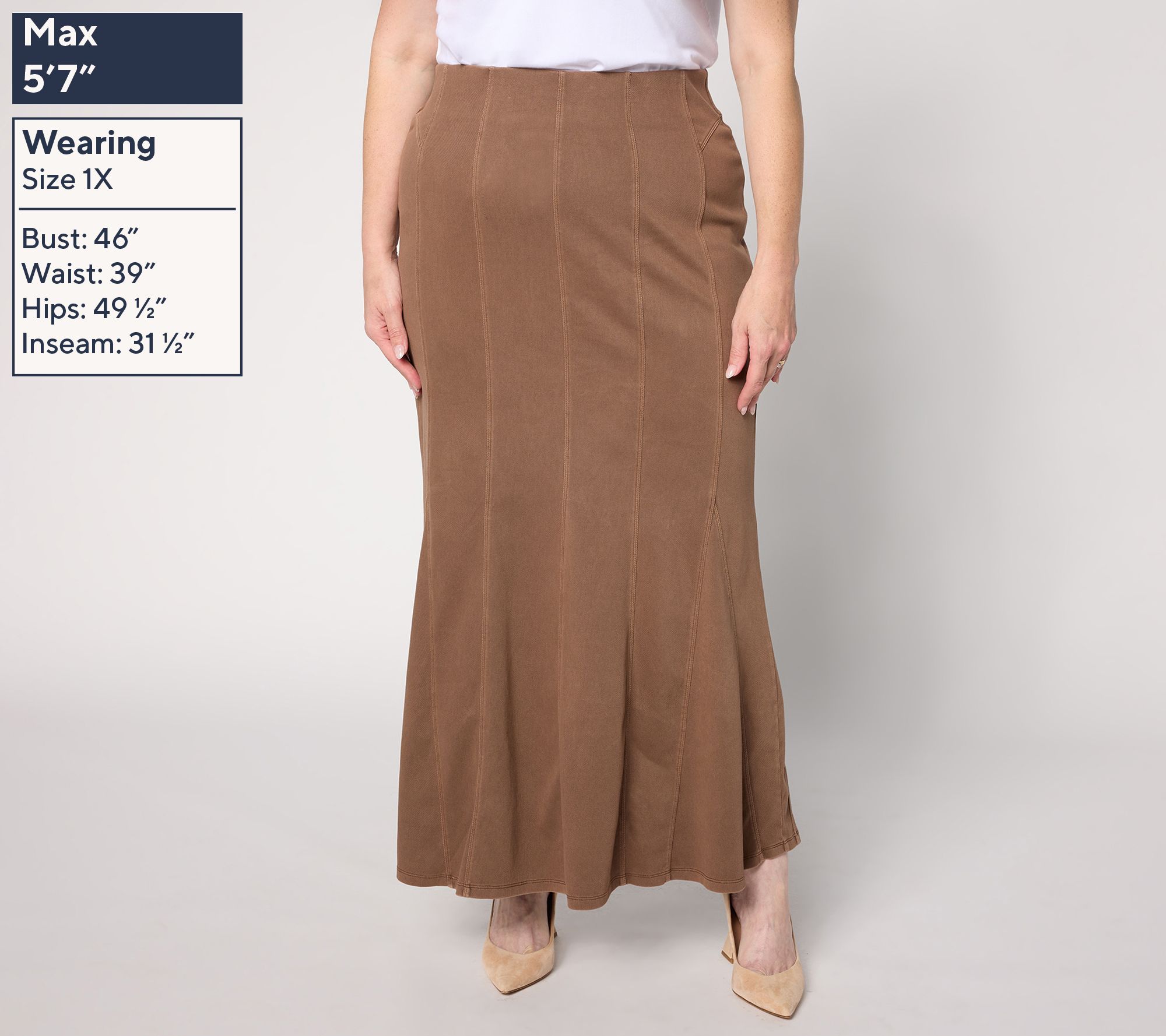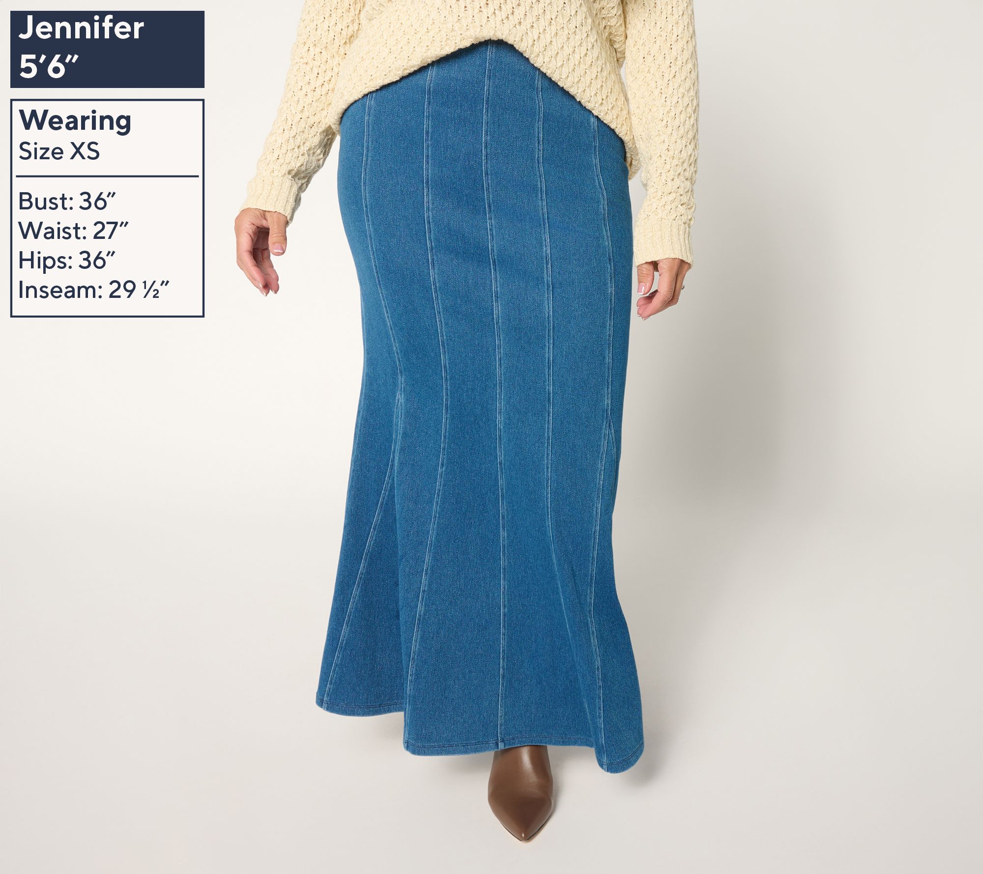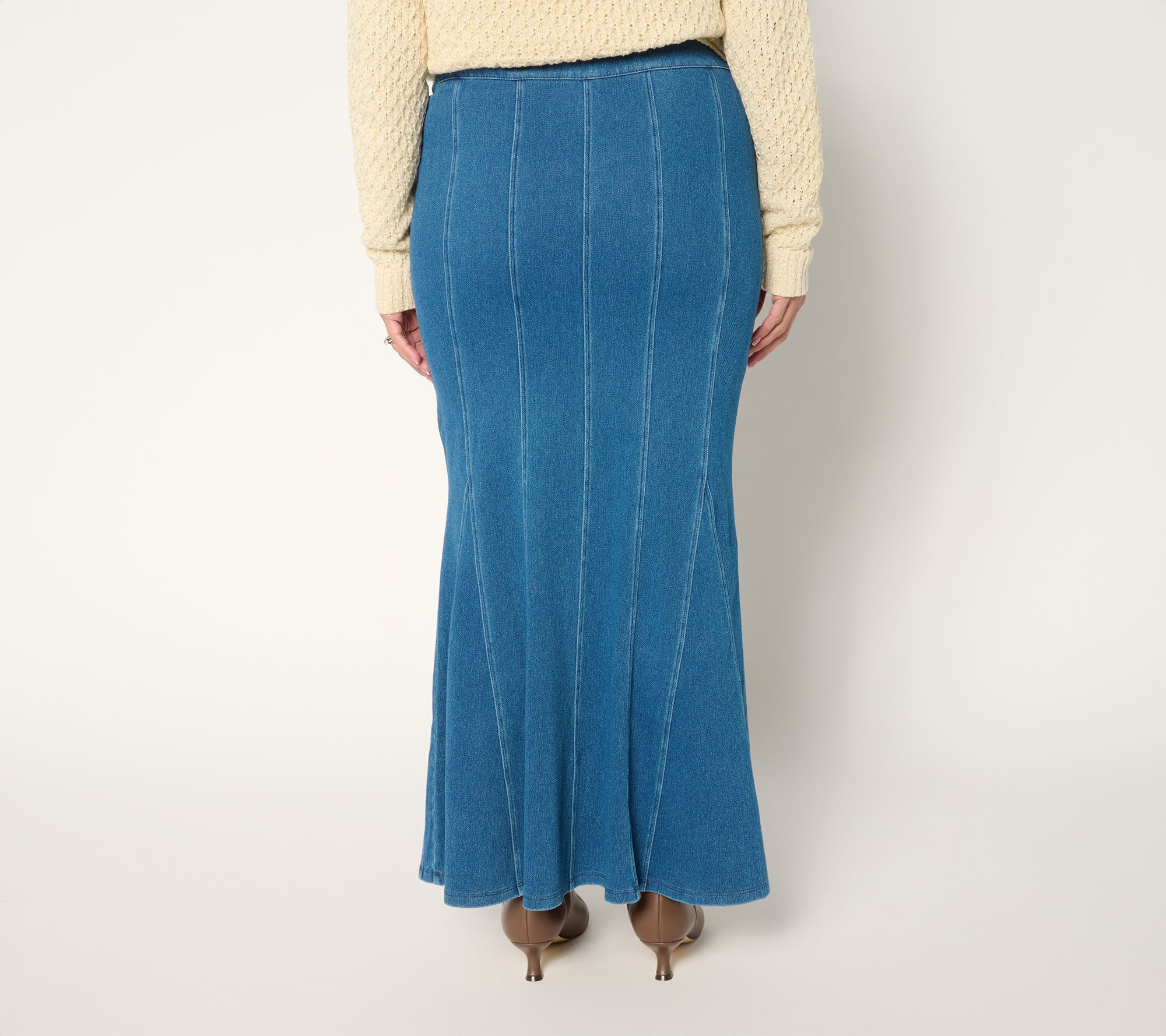 Days packed with meetings or chic weekend gatherings pair effortlessly with this godet skirt in Prime Stretch DenimTM 2, featuring an attractive close fit at the waist and hip. We love how the breezy bottom opening beautifully frames all our favorite trending boots -- ankle, cowboy, and block-heel -- and lets us work the room without feeling restricted! From Women with Control®.