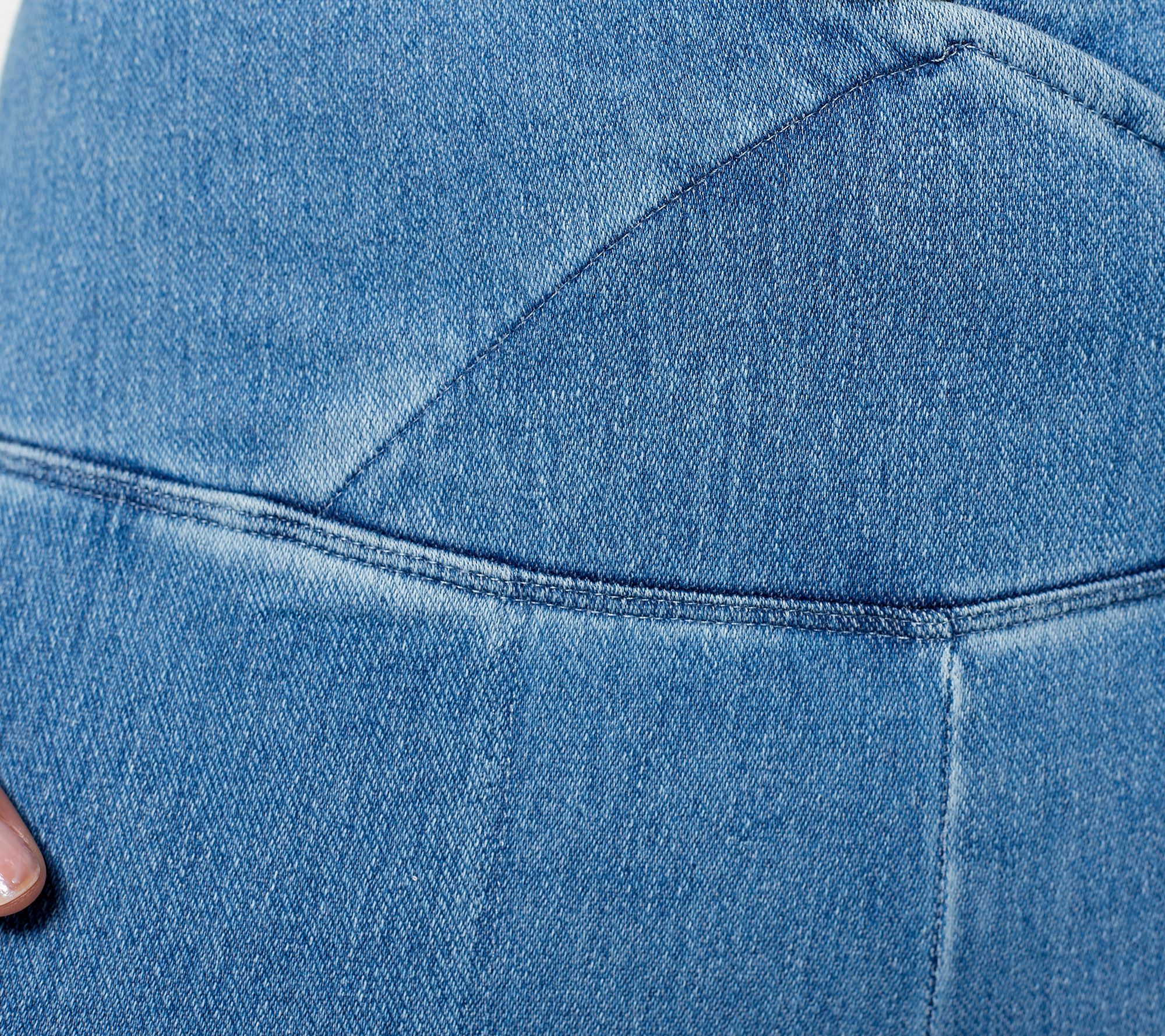 Fabrication: Prime StretchTM: indigo yarn dyed and knit with a twill construction for the look of denim and the comfortable feel of a knit