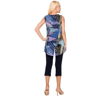I spy a woman with style. Wear this Women in Control printed top and capri pants set on your next mission. The sleeveless printed top conceals curves with a sheer overlay detail for added style, while the capri pants have an elastic waistband for comfortable wear. From Women with Control.