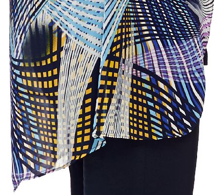 Top Features: sleeveless, printed, woven sheer overlay detail, scoop neckline