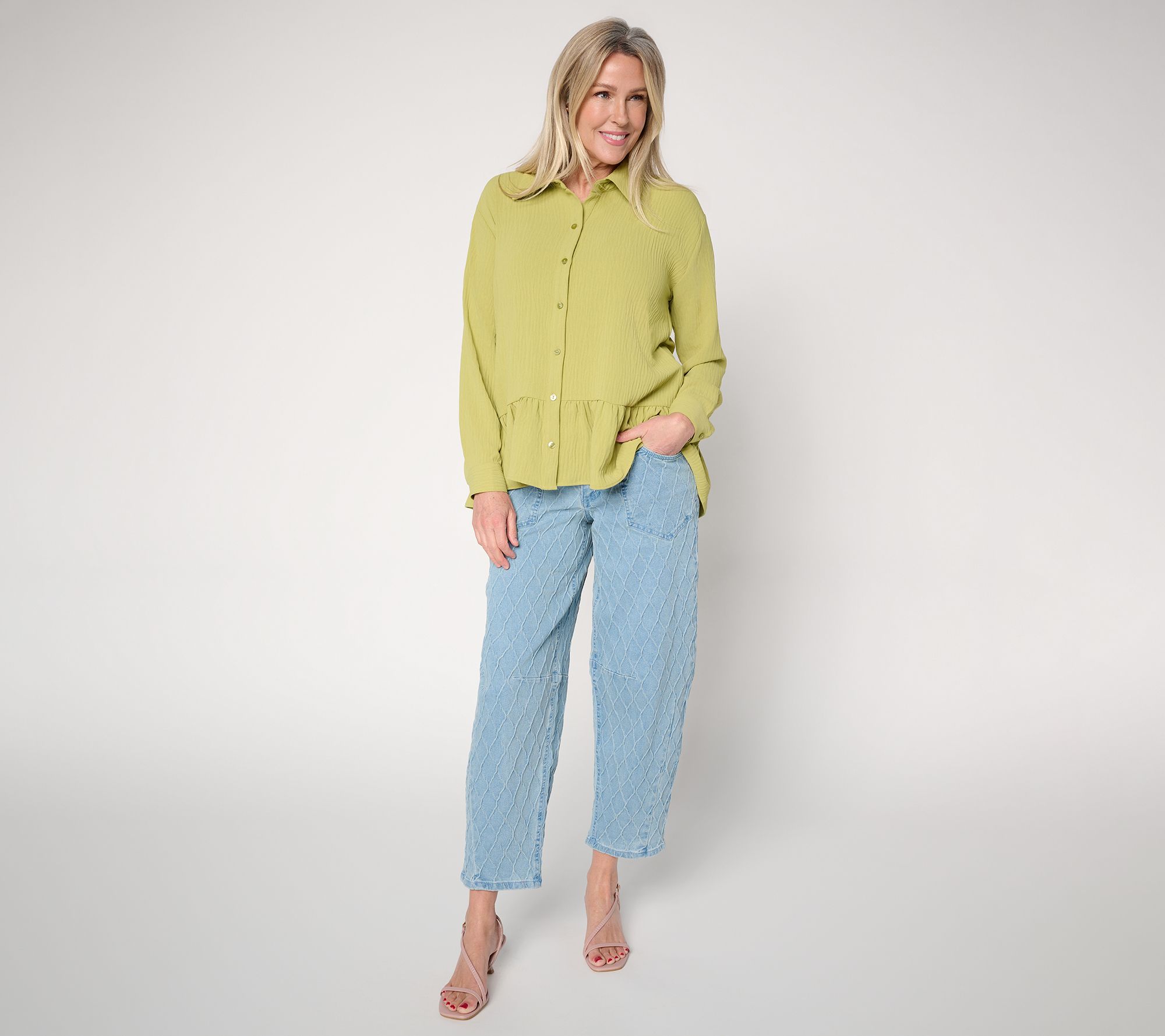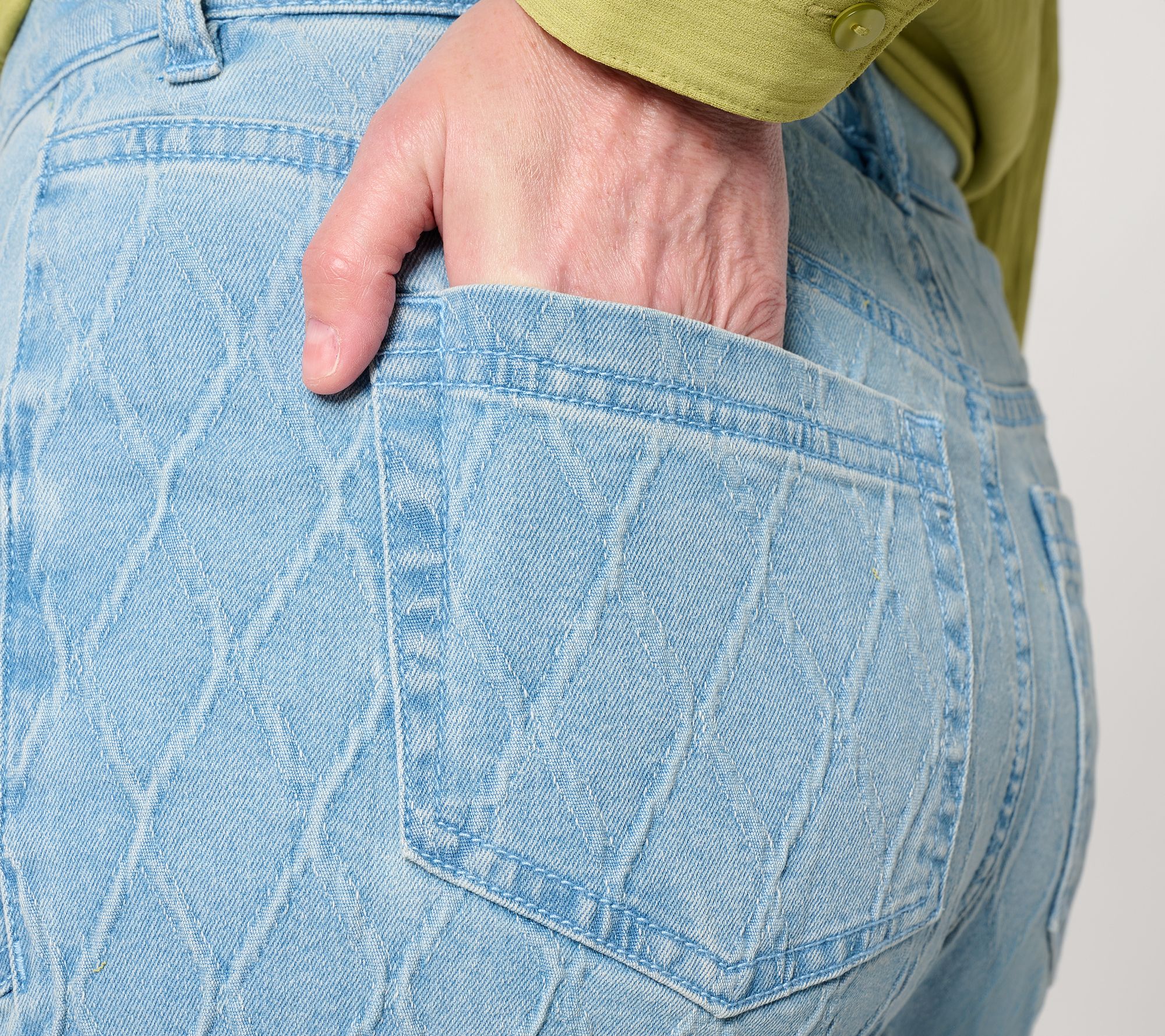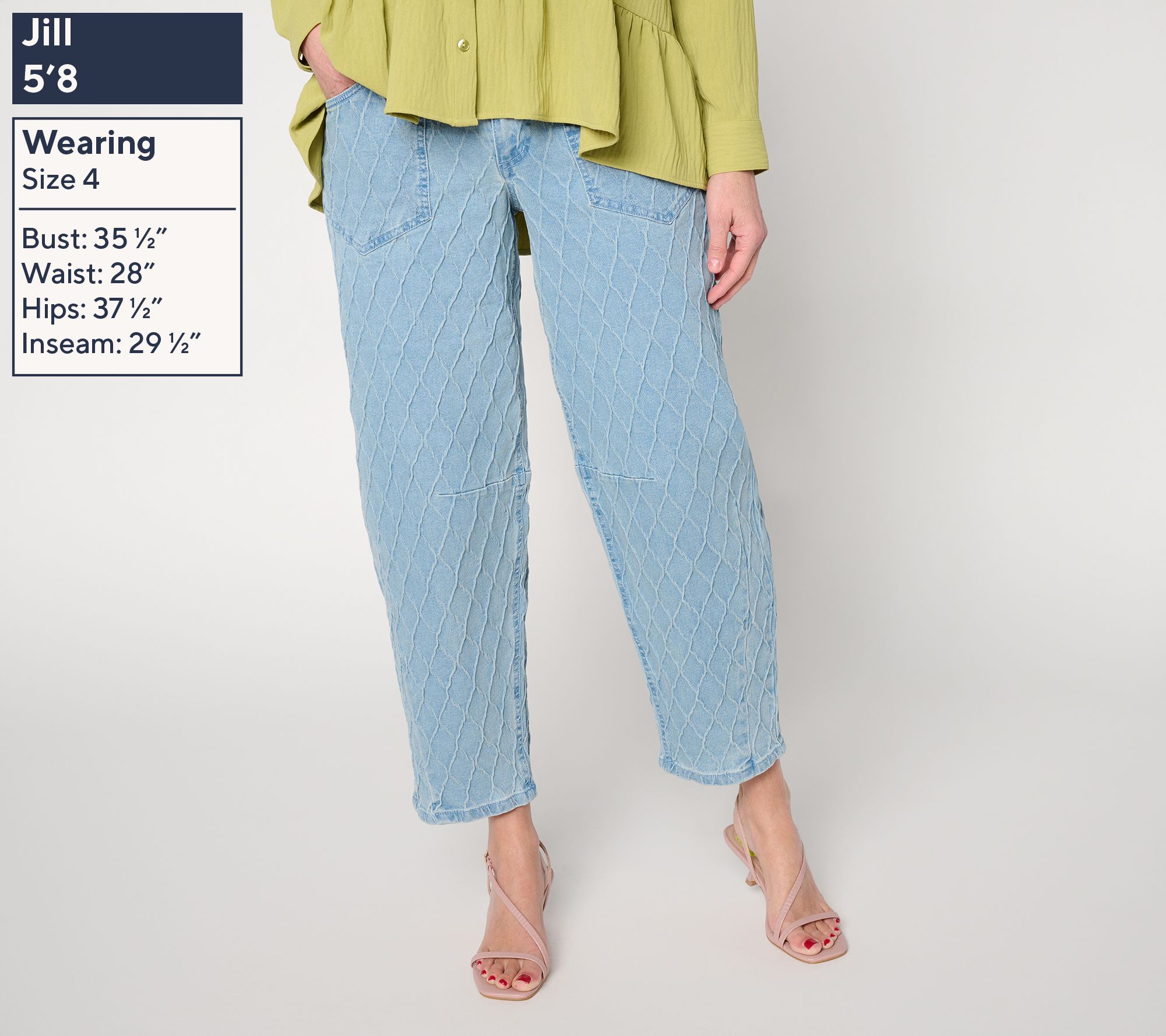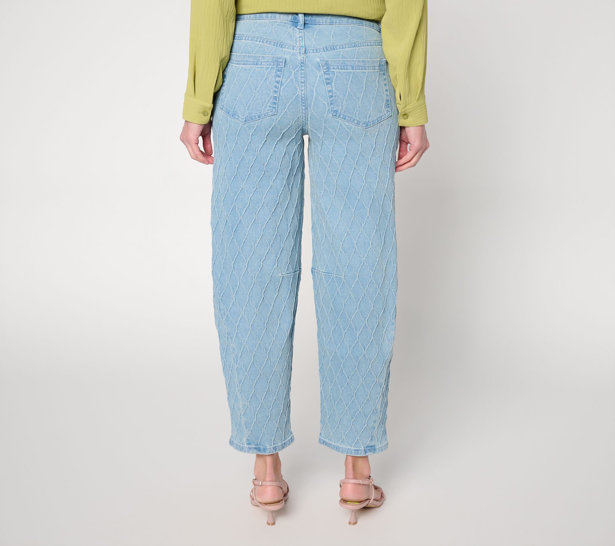When comfort meets standout style, these jacquard denim barrel-leg pants easily transition from meeting-filled mornings to spontaneous evenings out. The curved outseam flatters your silhouette, while a Bella pocket opening adds a touch of modern flair to elevate your casual looks. From Women with Control®.