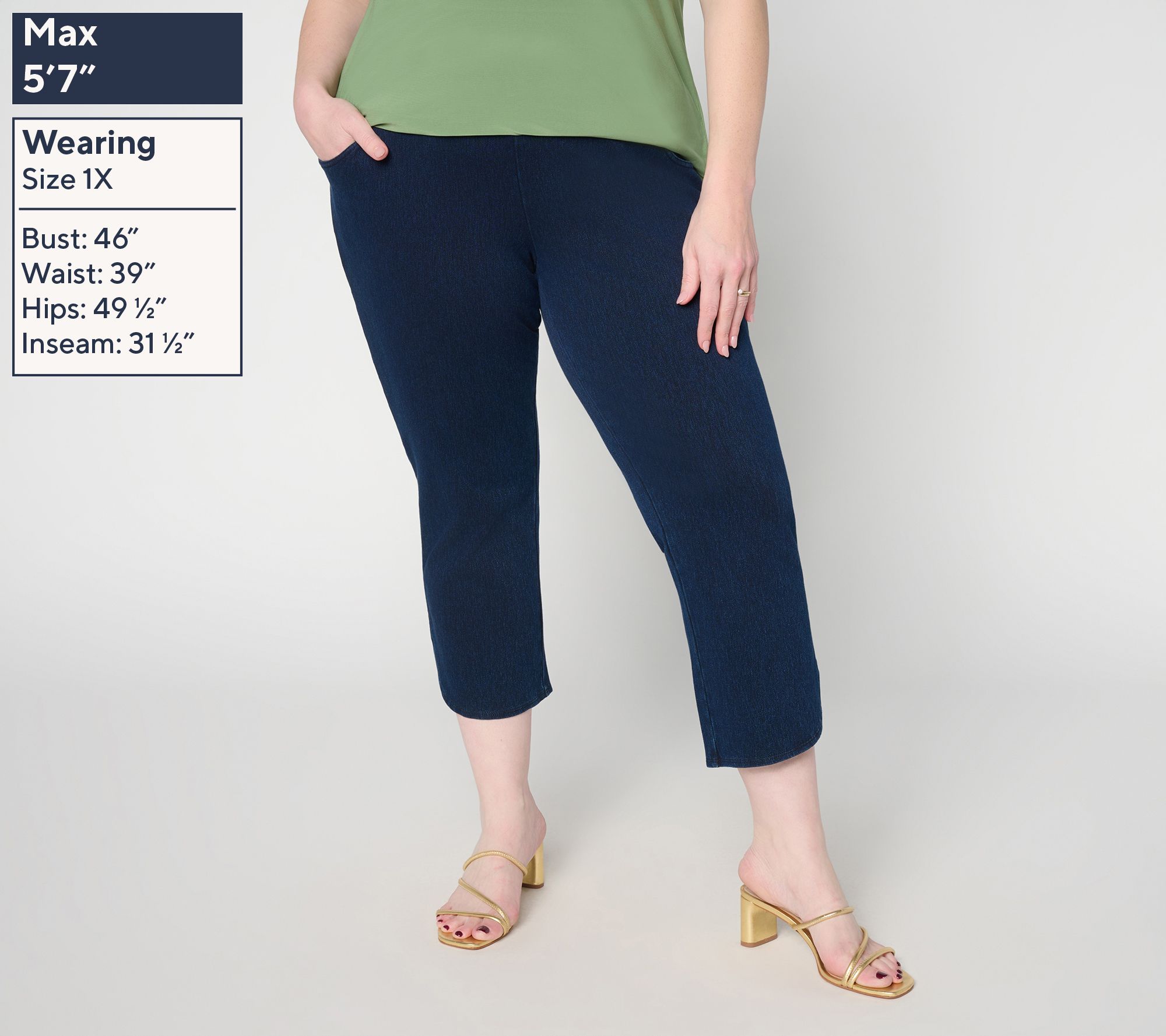 Get in on the secret. These looks-like-jeans-but-fits-like-a-knit crop pants are your go-to choice for a day of exploring or celebrating at a backyard party. The tulip hem feels so fresh, while the Tummy Control waistband offers support when you're on the move. From Women with Control®.