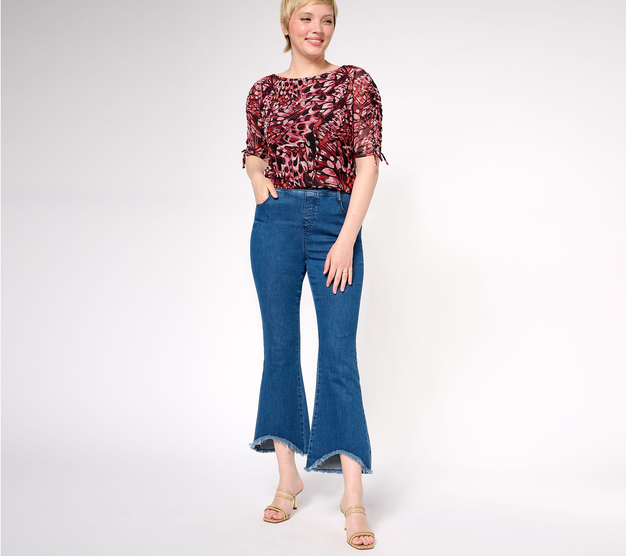 Kick it all season long in soft, supple denim with a lived-in feel (like you've owned them for years!). Scored a pair of designer sandals on sale? These frayed, kick-flare shaped jeans make a point of showing off your fave footwear while they famously flatter your figure. From Women with Control®.