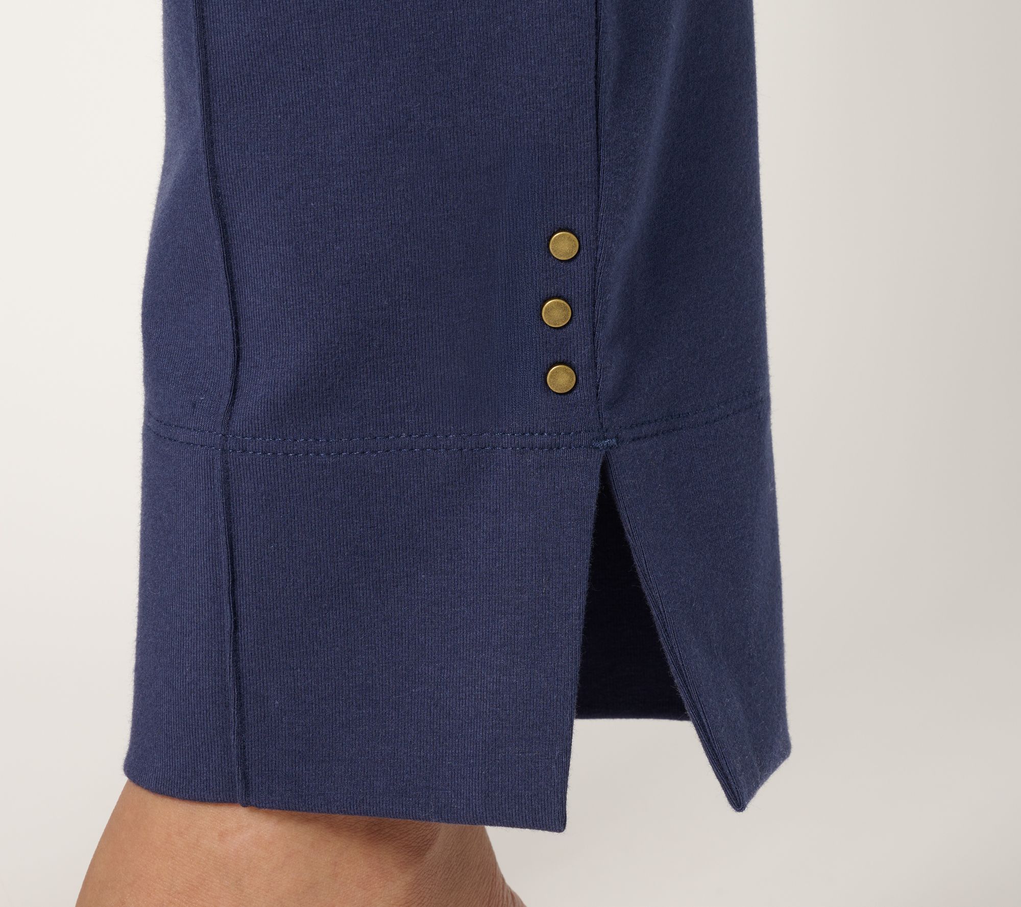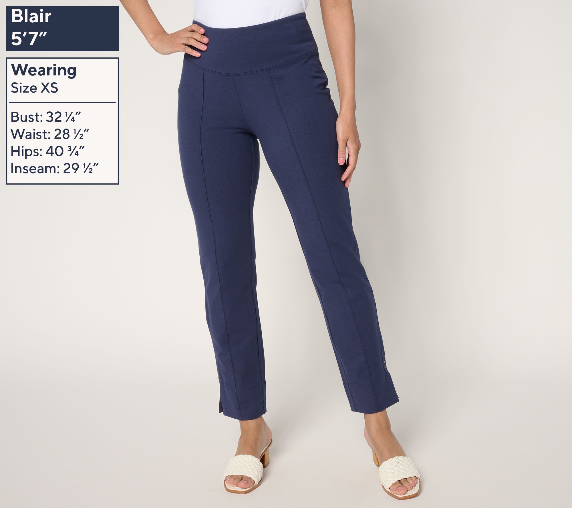 Features: Tummy Control waistband, pintucks, clean finish side slits with three metal rivets