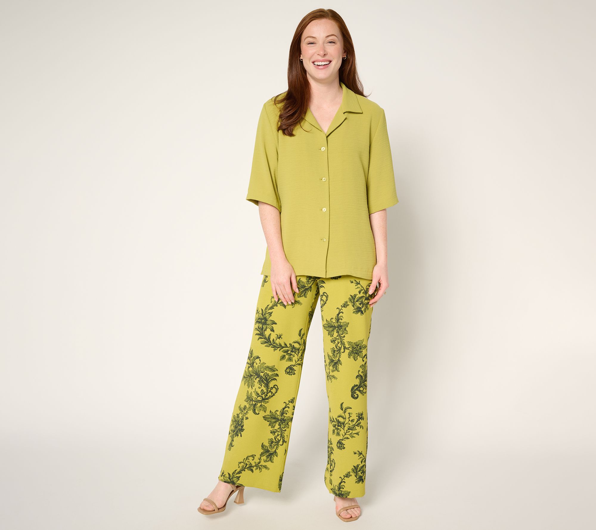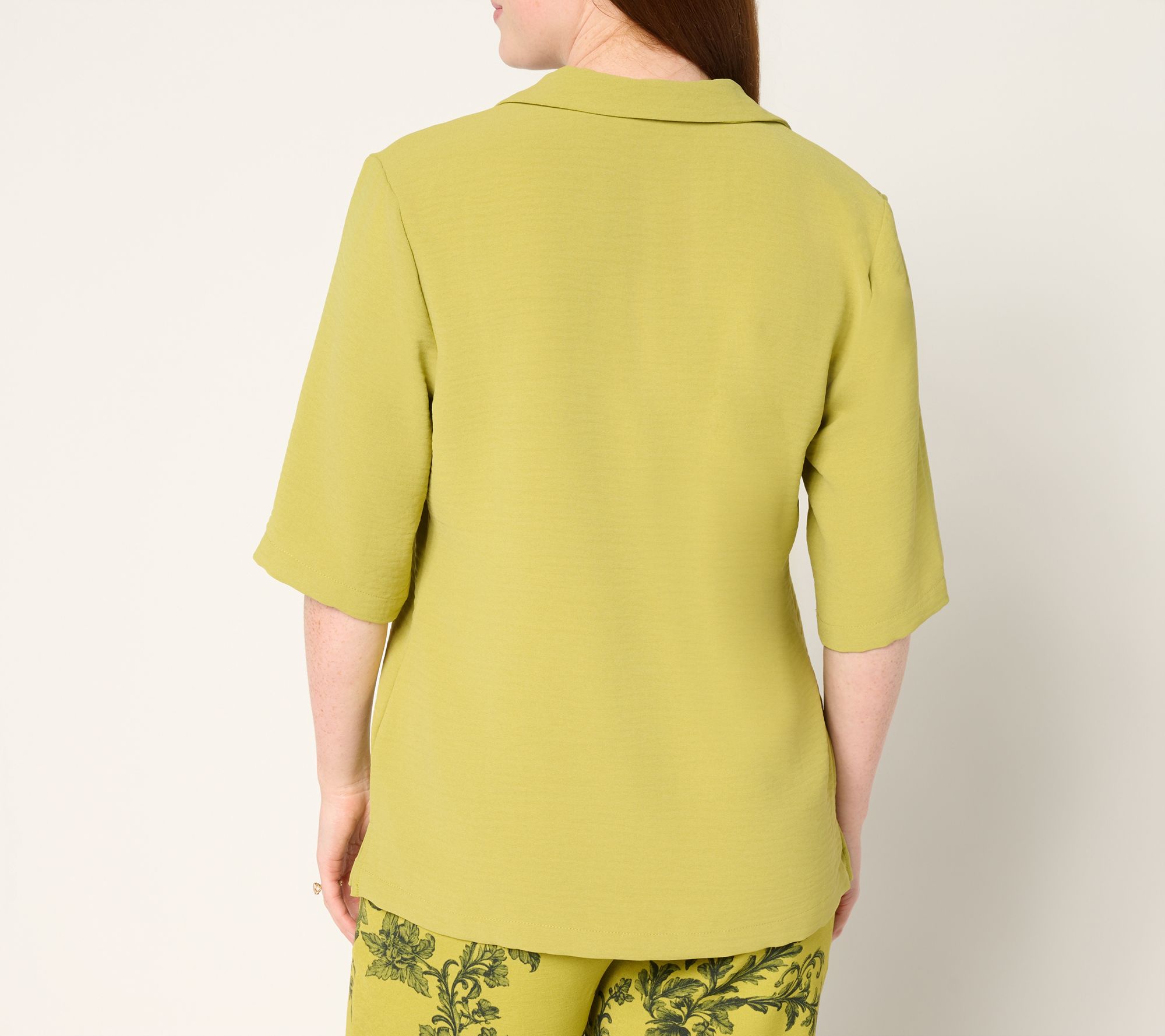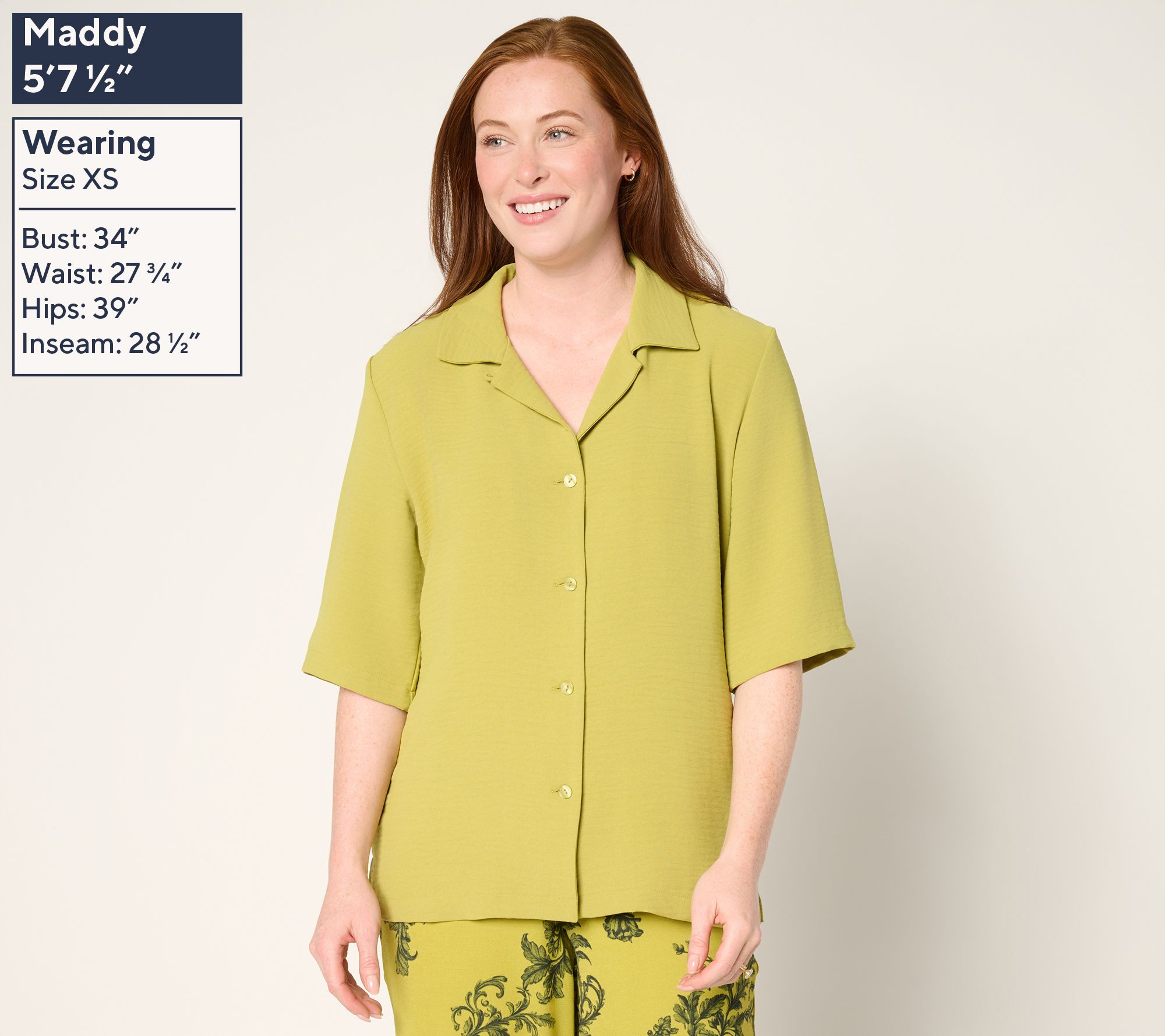 Breezy days, patio lunches, or a quick stroll by the water -- this button-front cabana shirt brings effortless polish to your every plan. Lightweight woven fabric, a faux shell button closure, and sleek collar details easily transition from laid-back to dressed up. Try it layered over a tank with your favorite shorts for a casual-chic look. From Women with Control®.