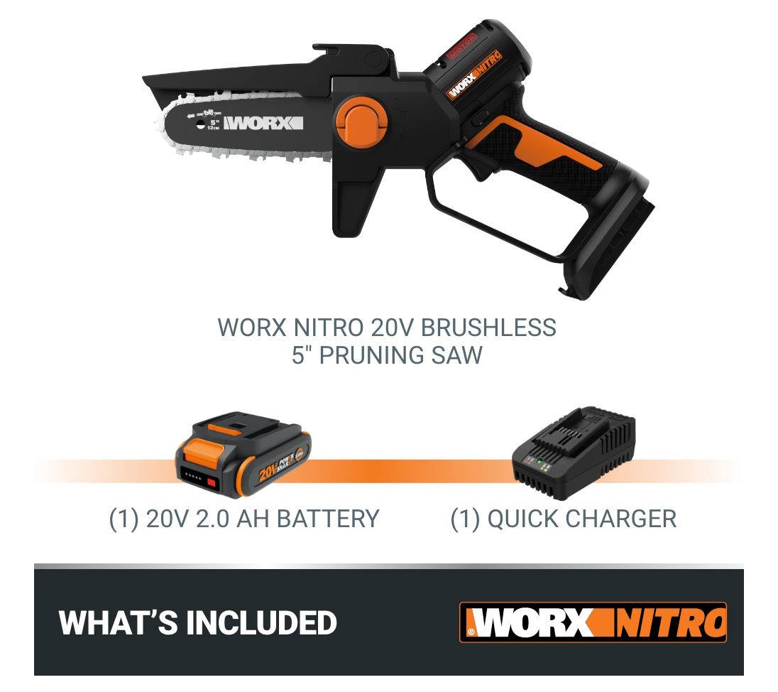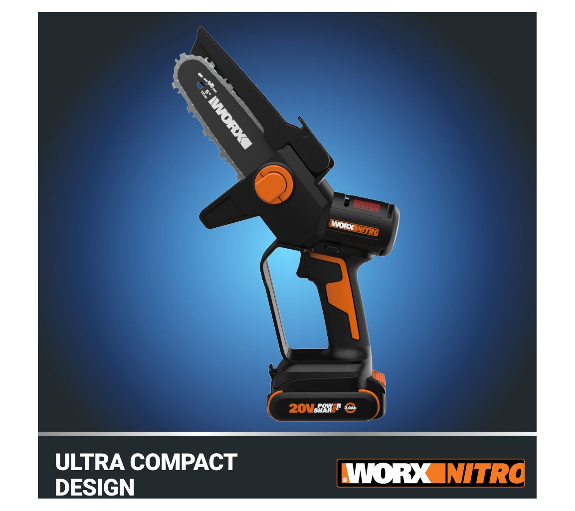 High-powered cutting is never a chore with the Worx Nitro 20V brushless 5" cordless pruning saw. Its ultra-compact design and lightweight body make it easy to maneuver, even in tight spaces. Enjoy the convenience of cordless capability for truly on-the-go cutting. From Worx.