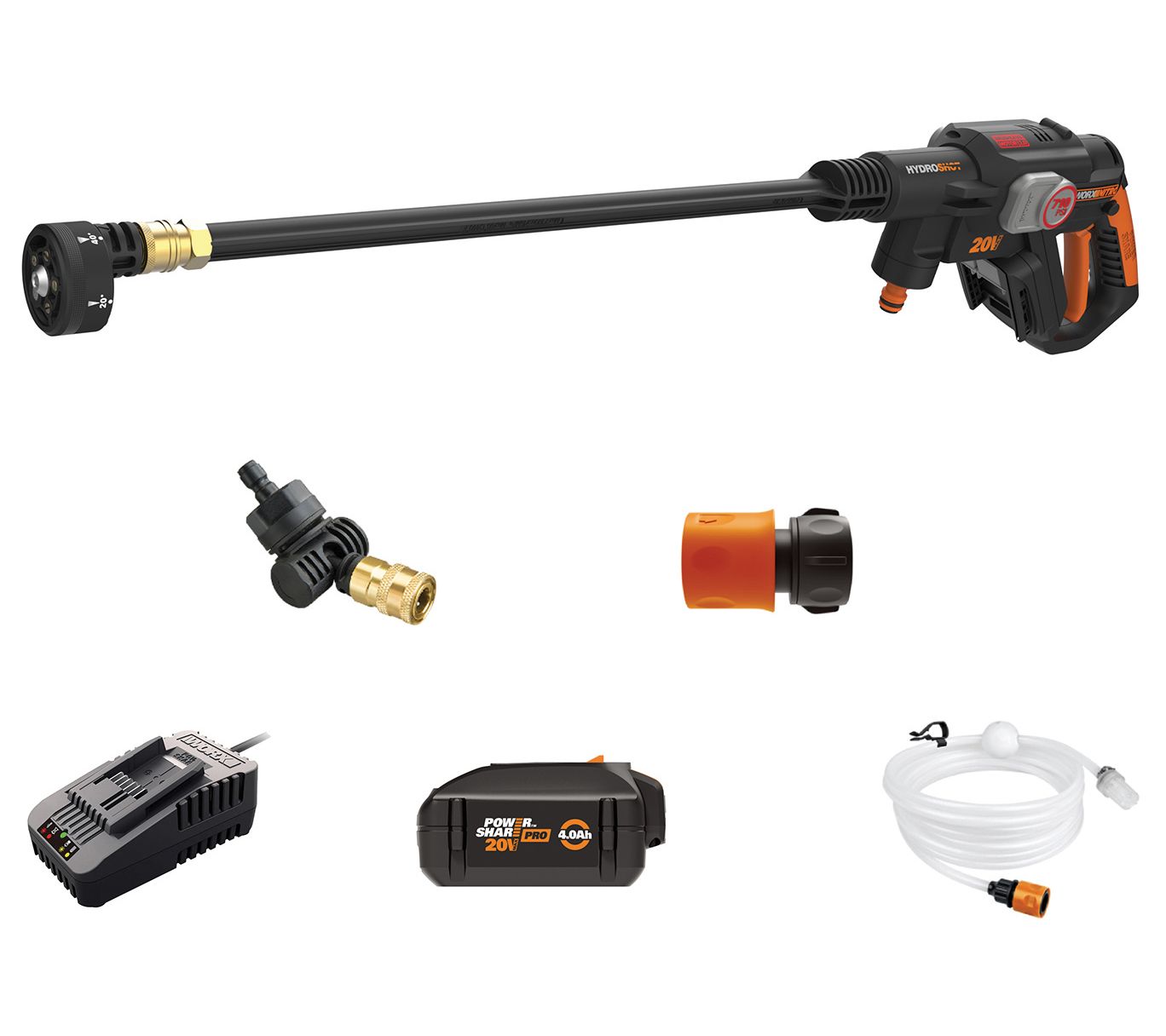 Includes 20V 710 MAX PSI Hydroshot, 20' drawing hose, cleaning lance, 5-in-1 nozzle, bottle connector (WA4038), turbo nozzle adapter, 4.0Ah battery, and quick charger