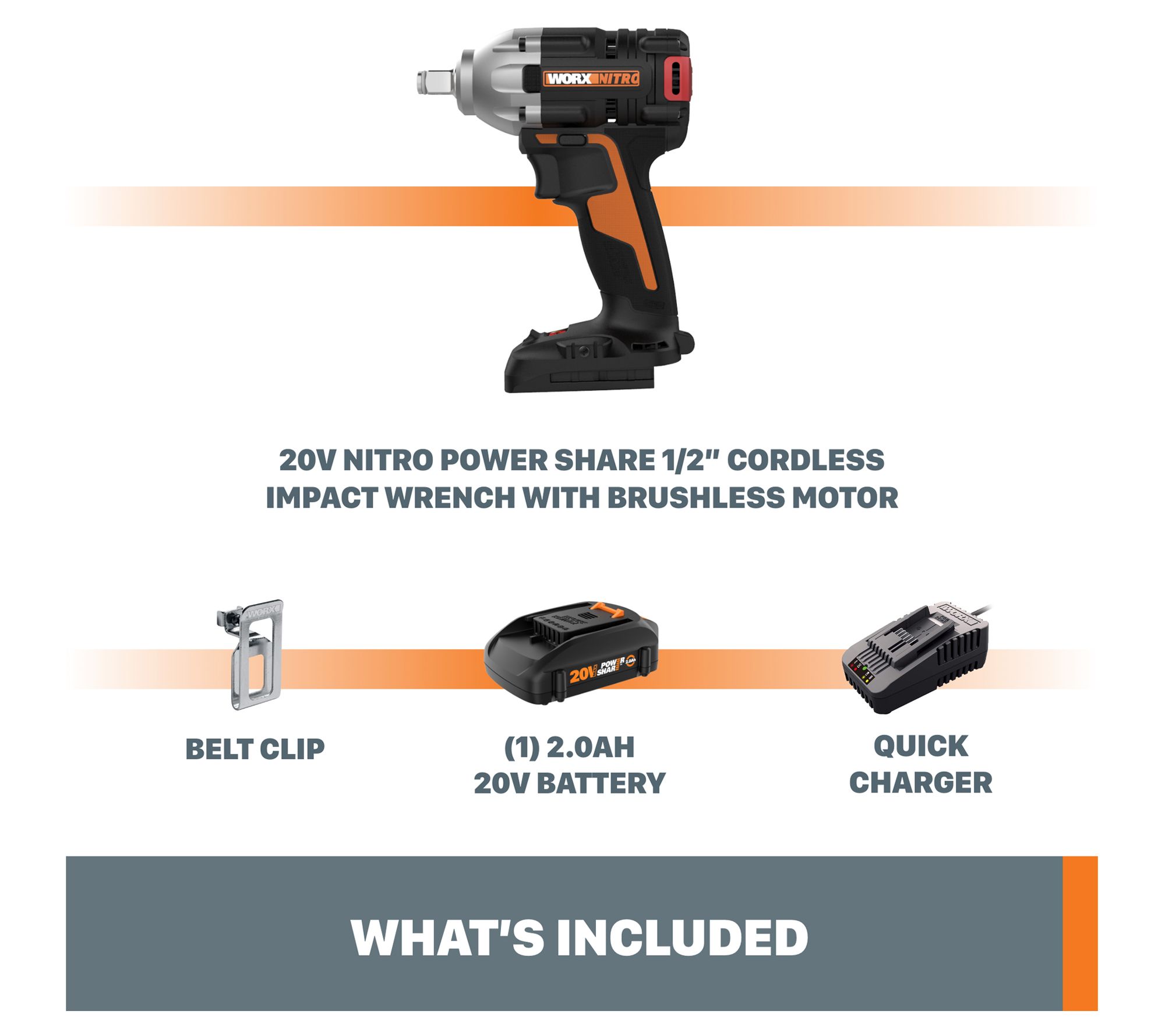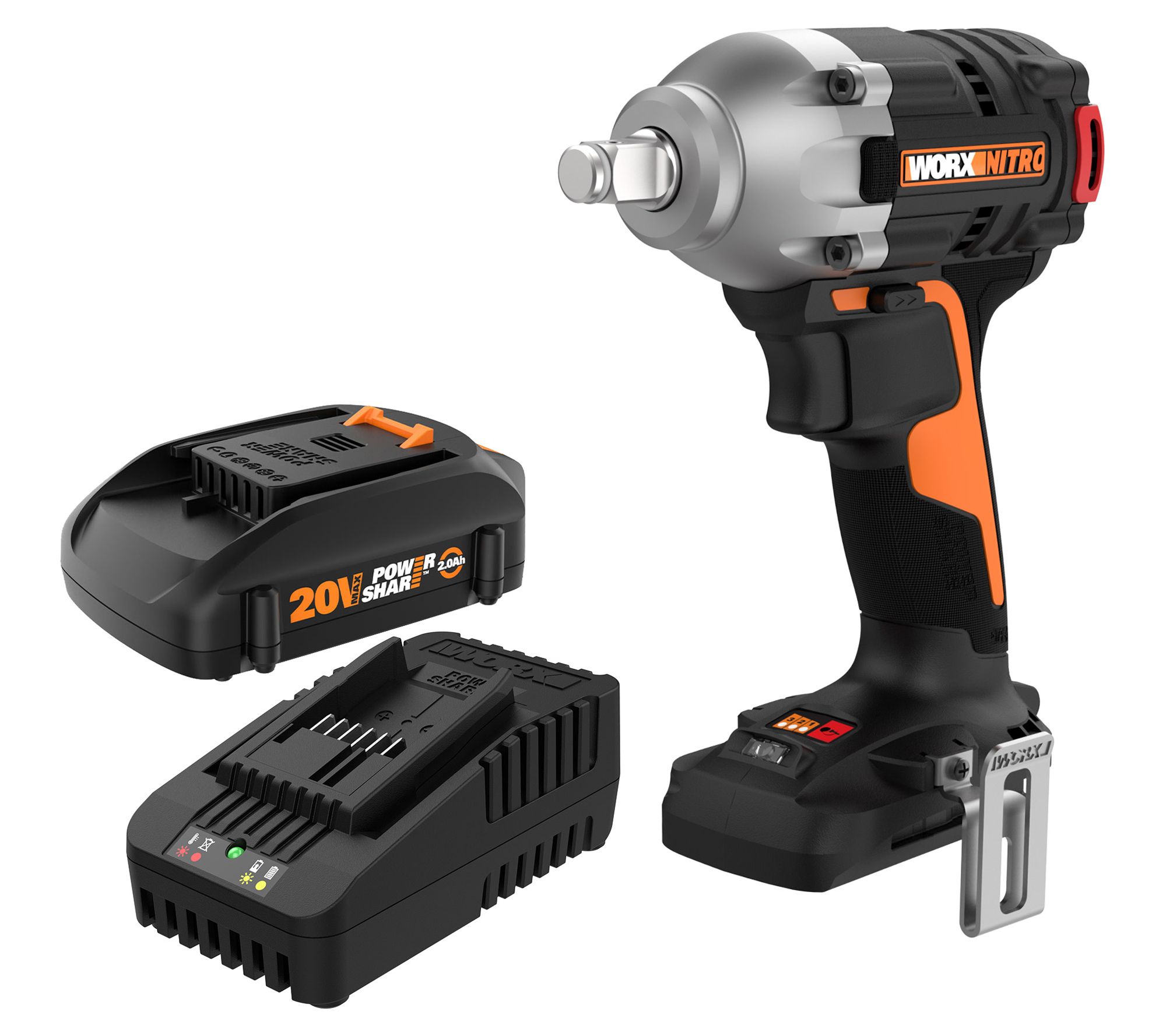 Includes Nitro 20V cordless impact wrench, belt clip, 2.0Ah battery, and 2A charger (WA3881)