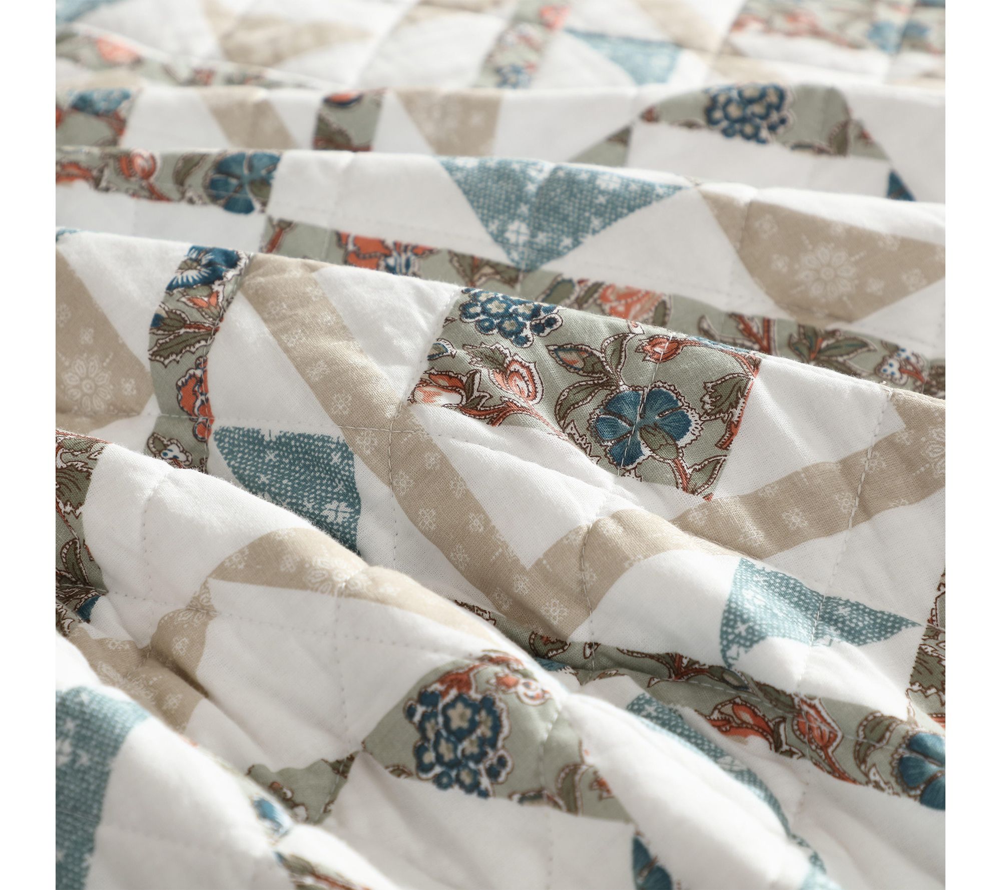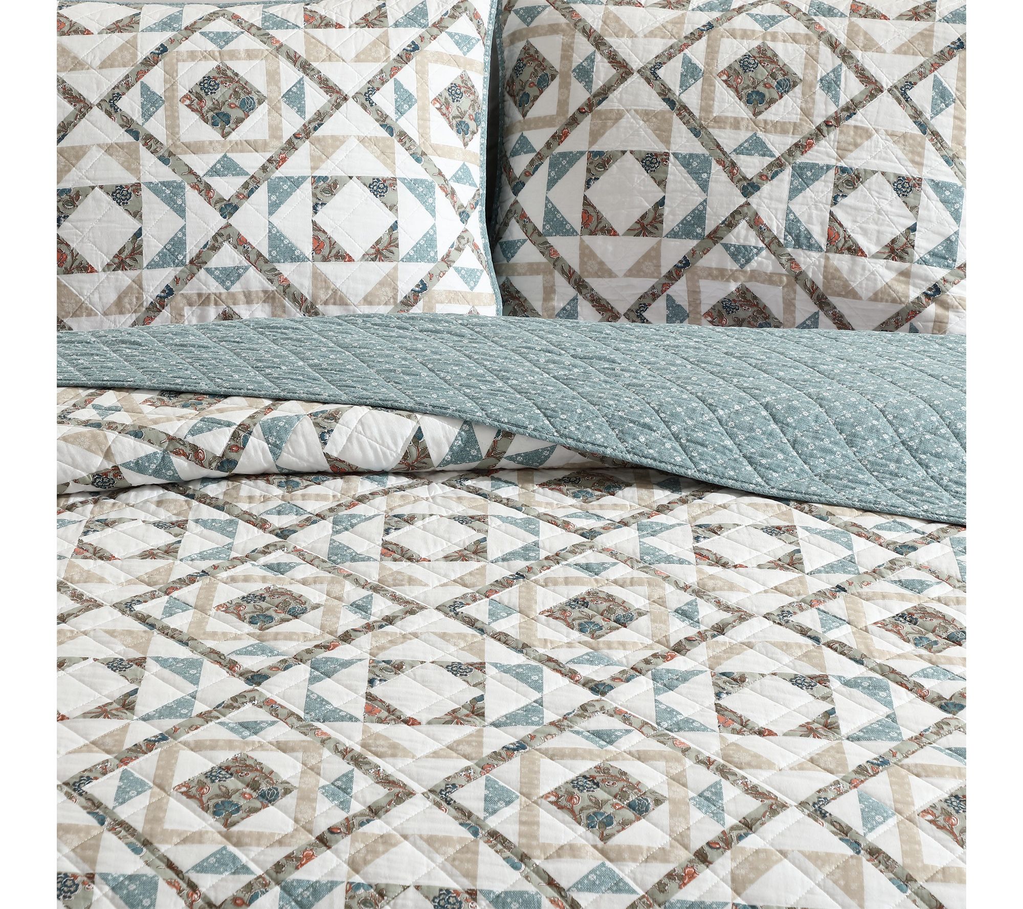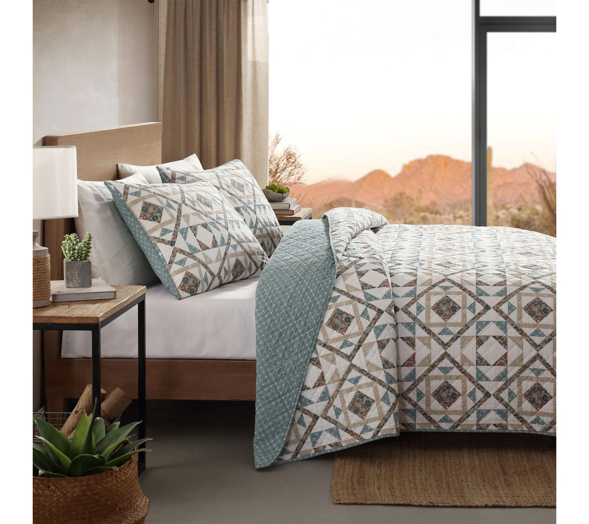 Whether you're refreshing a guest room or transforming your own, this cotton quilt set brings inviting color and a cozy feel to your bedding. Soft hues of blue, beige, and green create a calming geometric pattern, while the lightweight warmth makes bedtime extra relaxing all year round. From Wrangler.