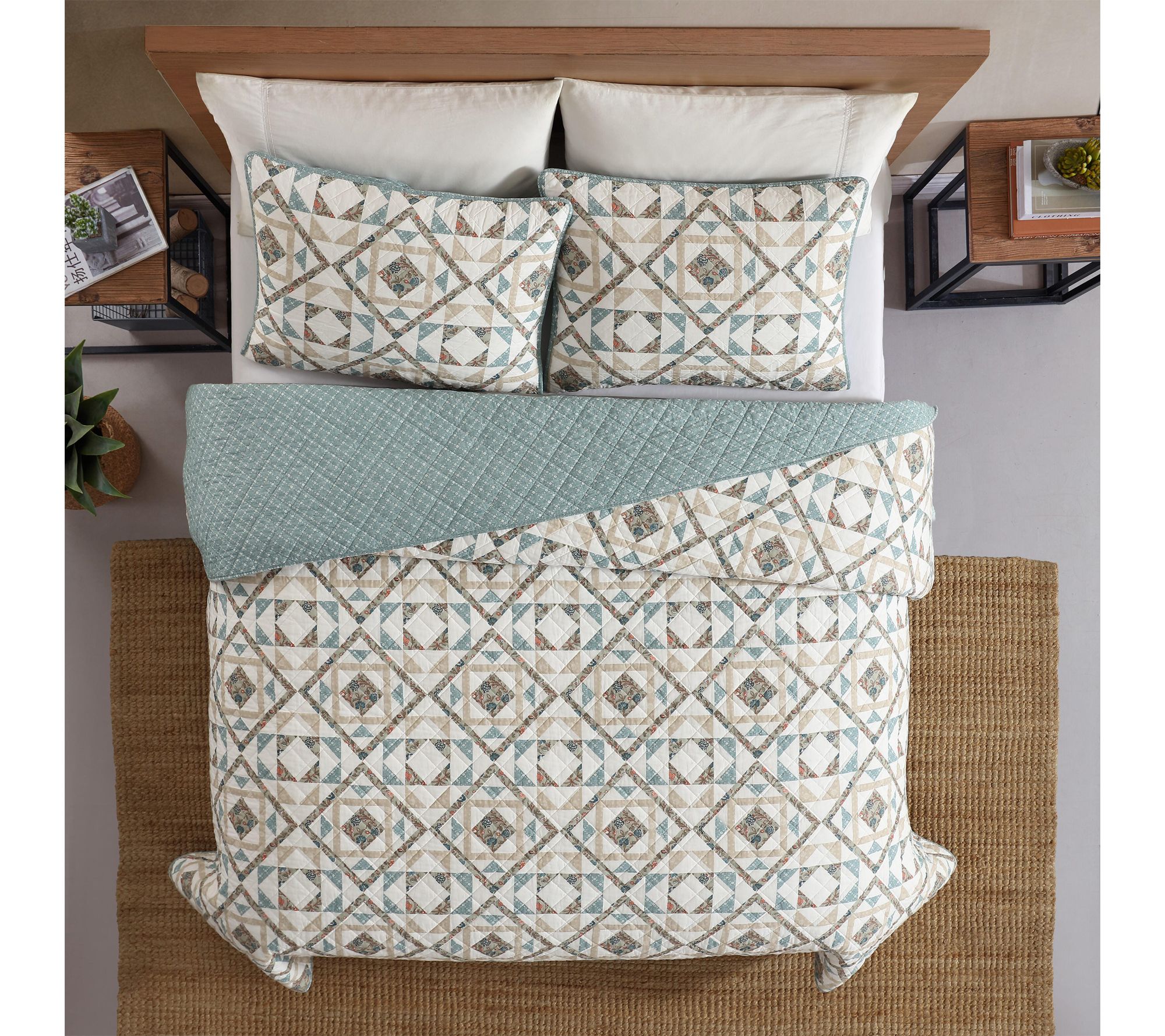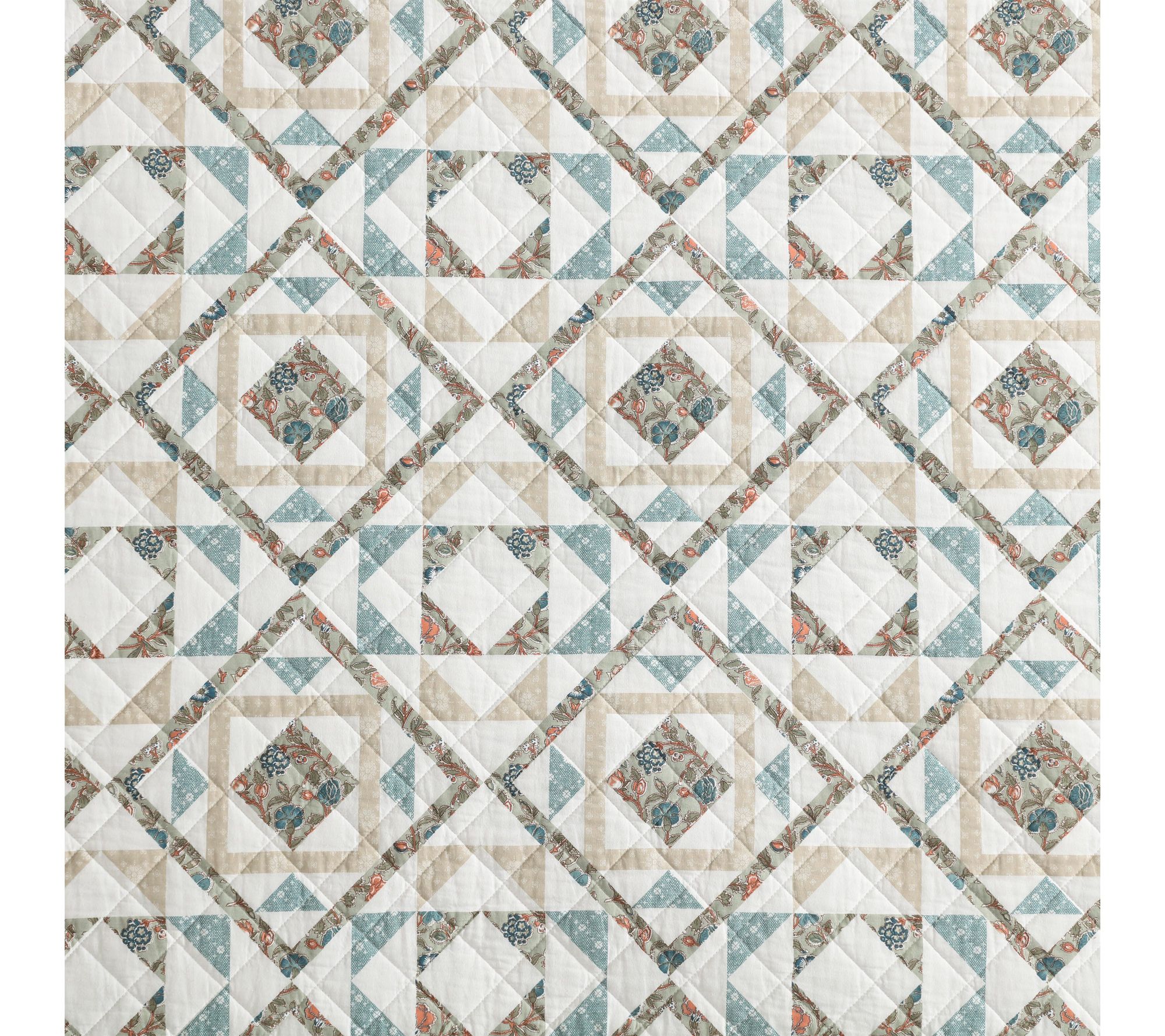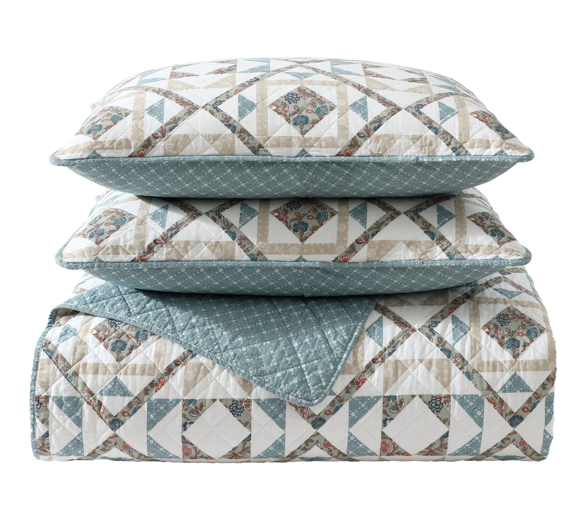 Whether you're refreshing a guest room or transforming your own, this cotton quilt set brings inviting color and a cozy feel to your bedding. Soft hues of blue, beige, and green create a calming geometric pattern, while the lightweight warmth makes bedtime extra relaxing all year round. From Wrangler.
