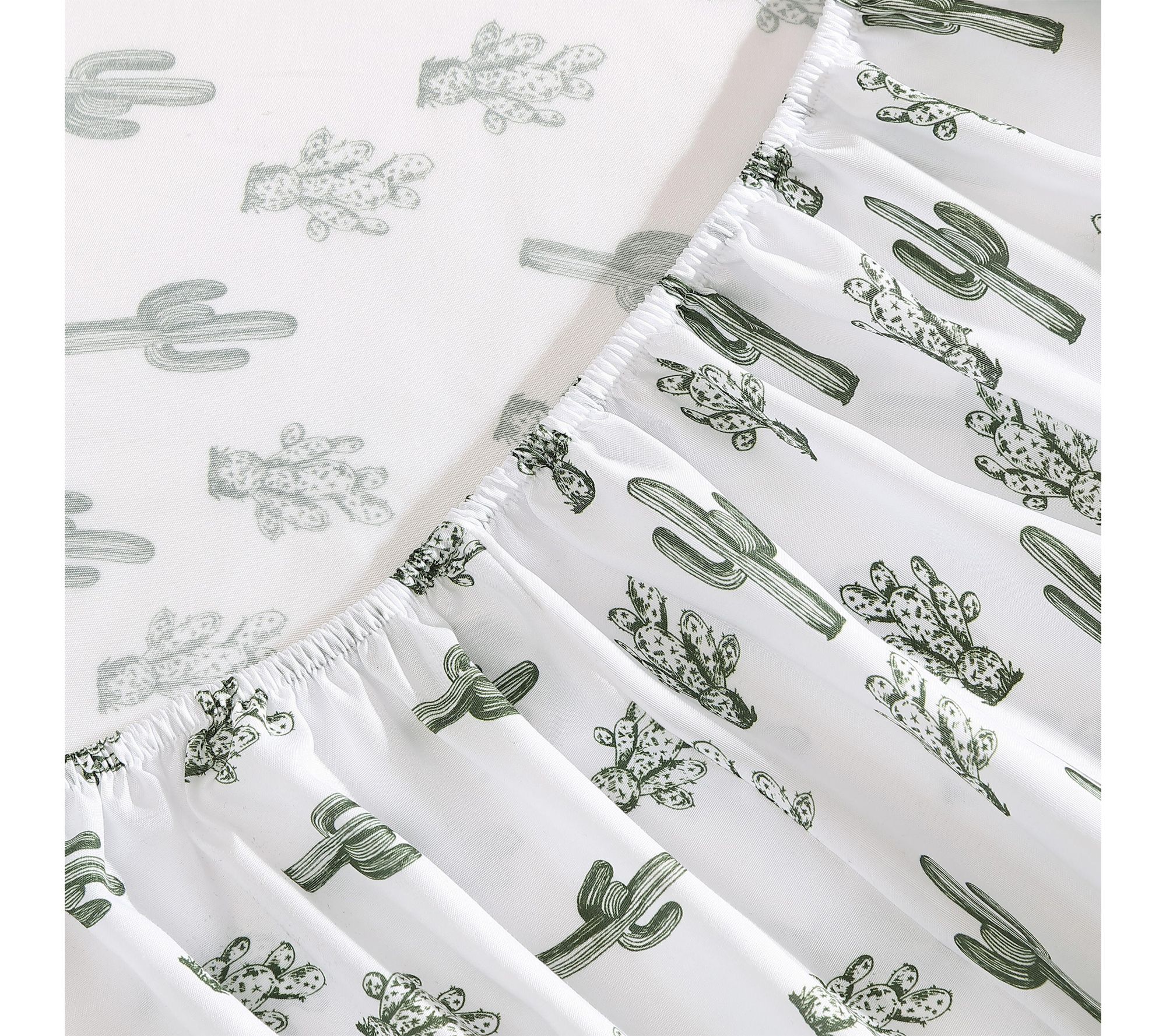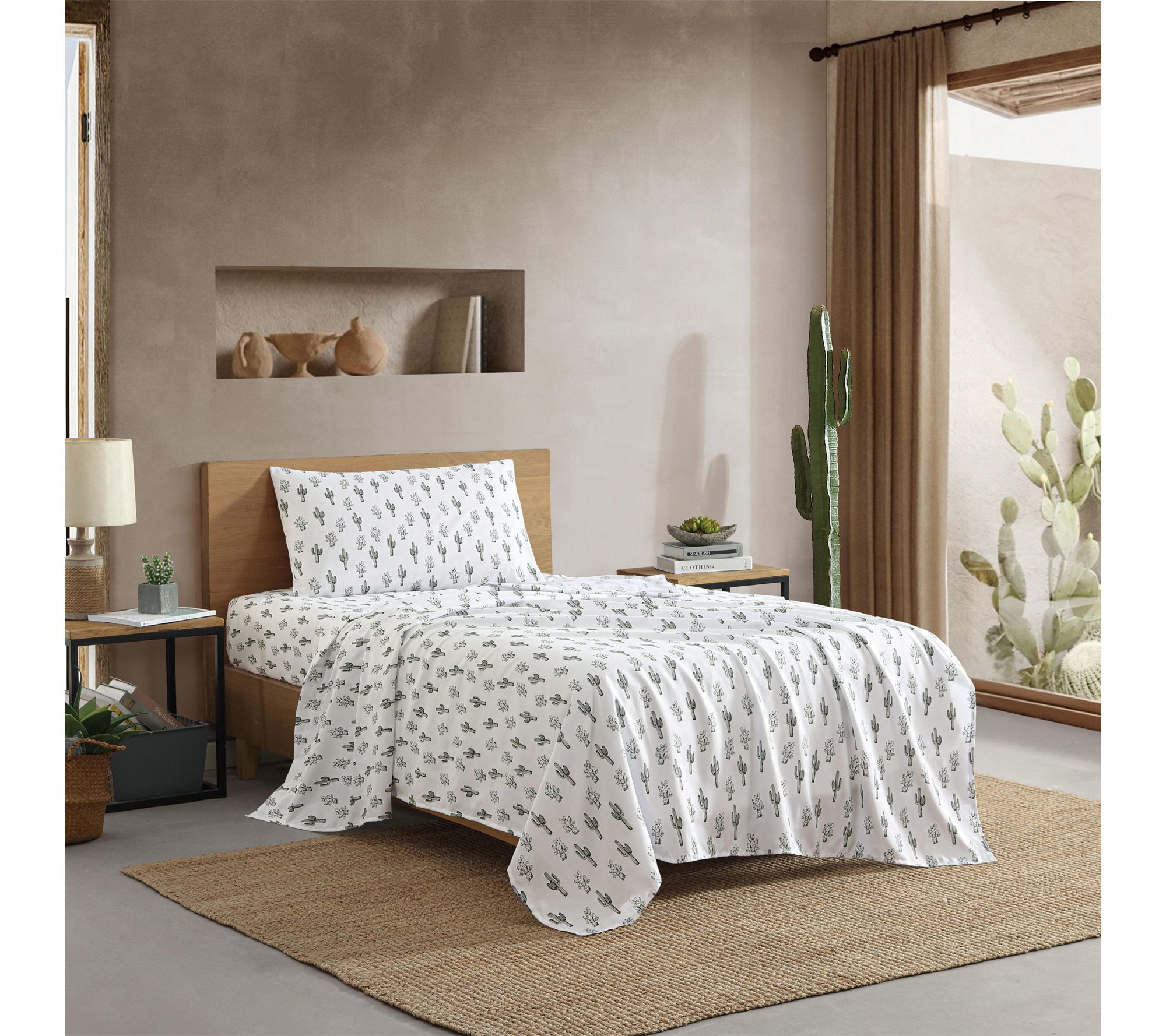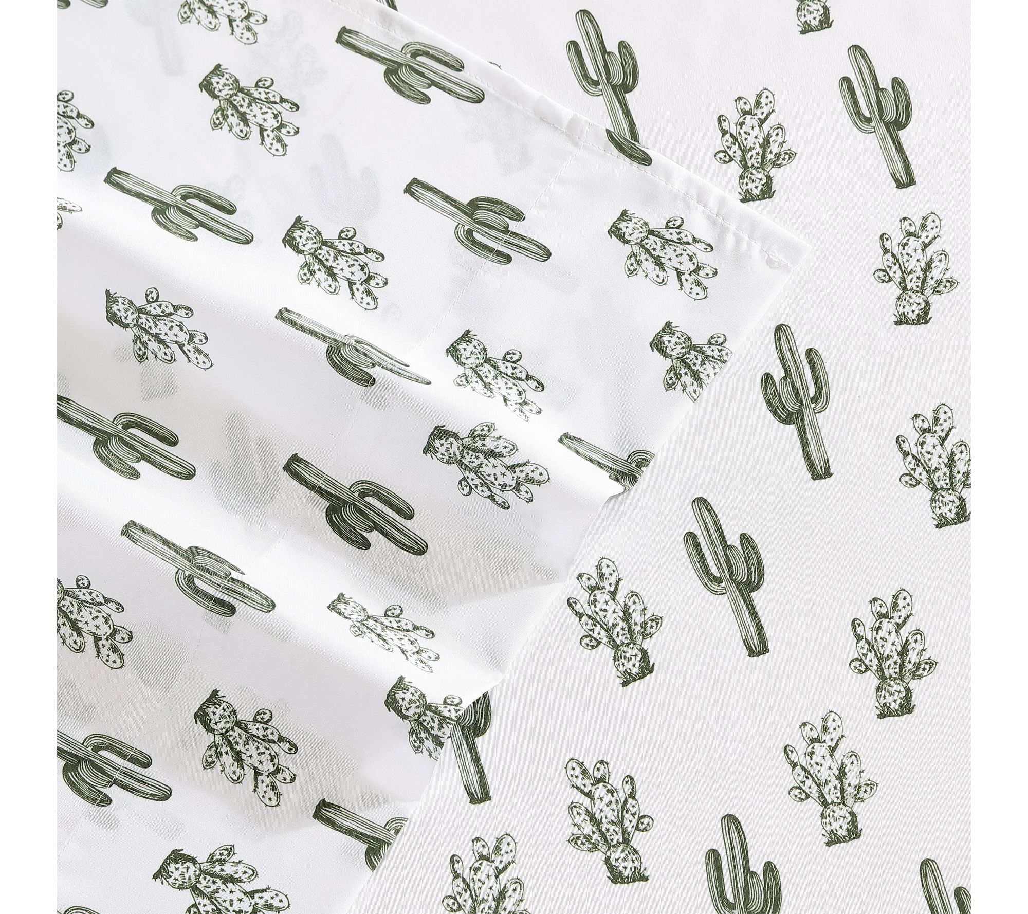 Refreshing western flair mixes with everyday comfort in this sheet set, featuring playful green cactus motifs across a soft, durable microfiber fabric. Whether brightening up a farmhouse-style bedroom or bringing a pop of personality to modern decor, the smooth touch and versatile design invite cozy sleep and easy layering with your favorite quilts or comforters. From Wrangler.