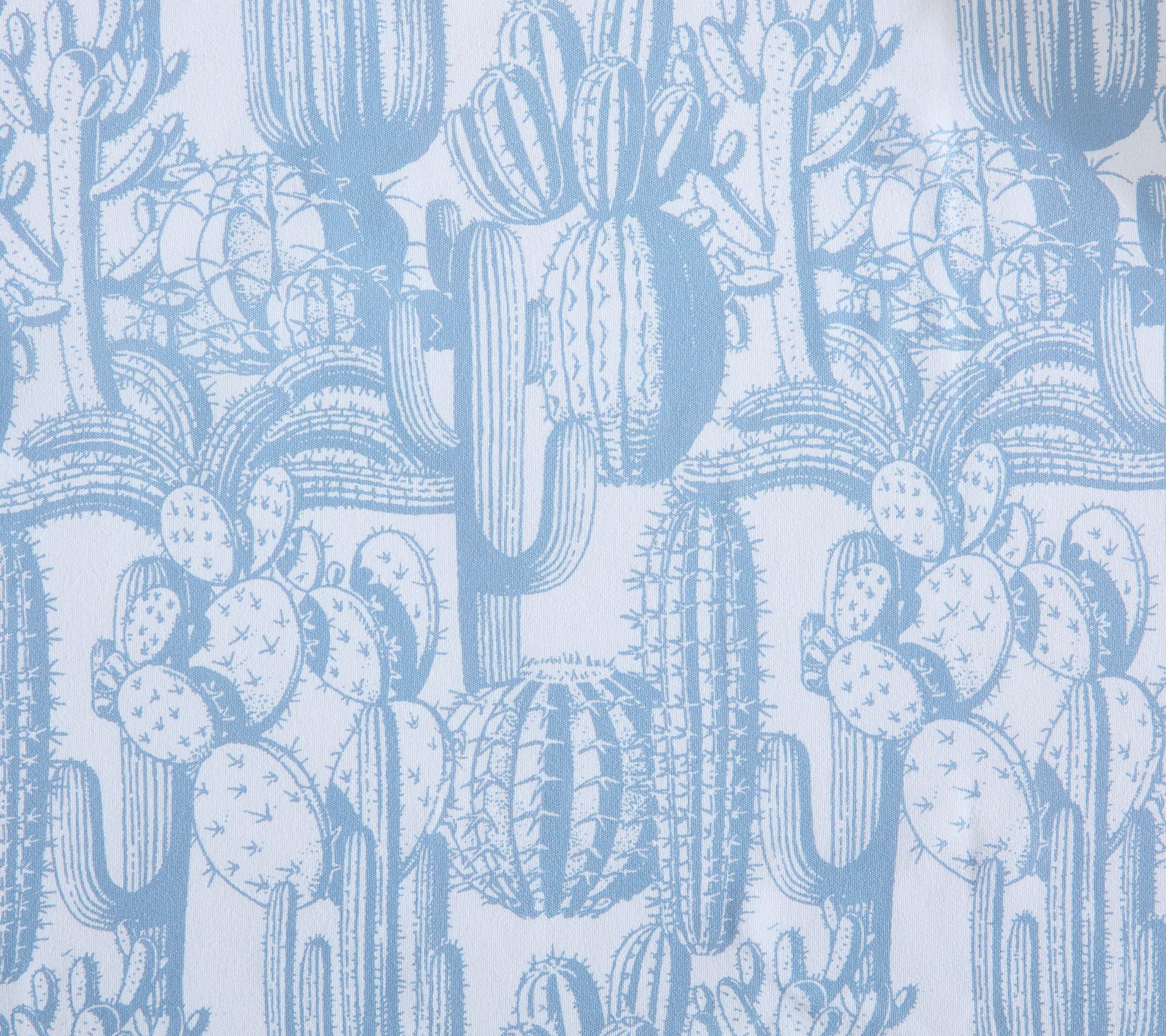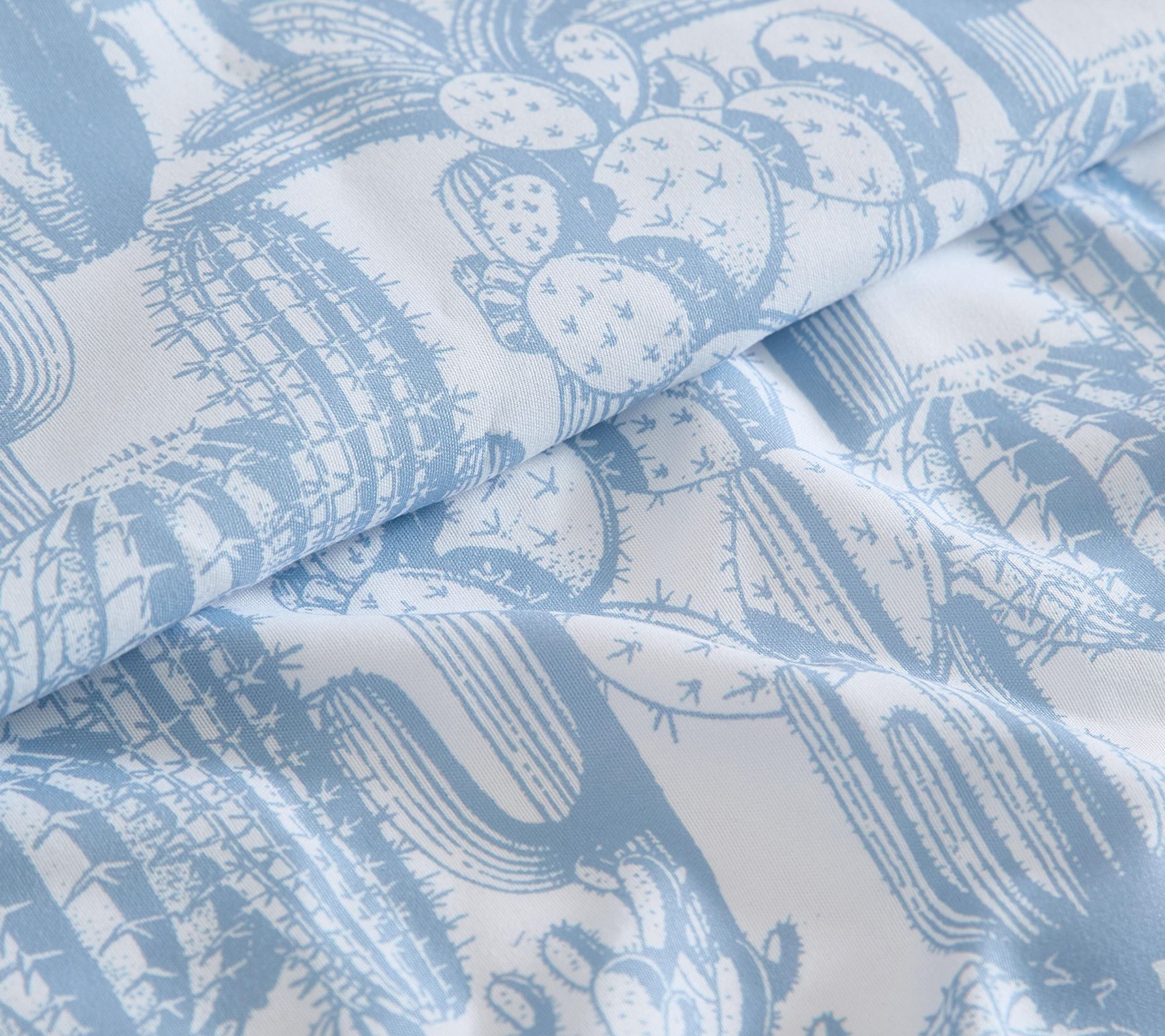 Desert-inspired toile print with sketched cactus motifs in soft blue on crisp white