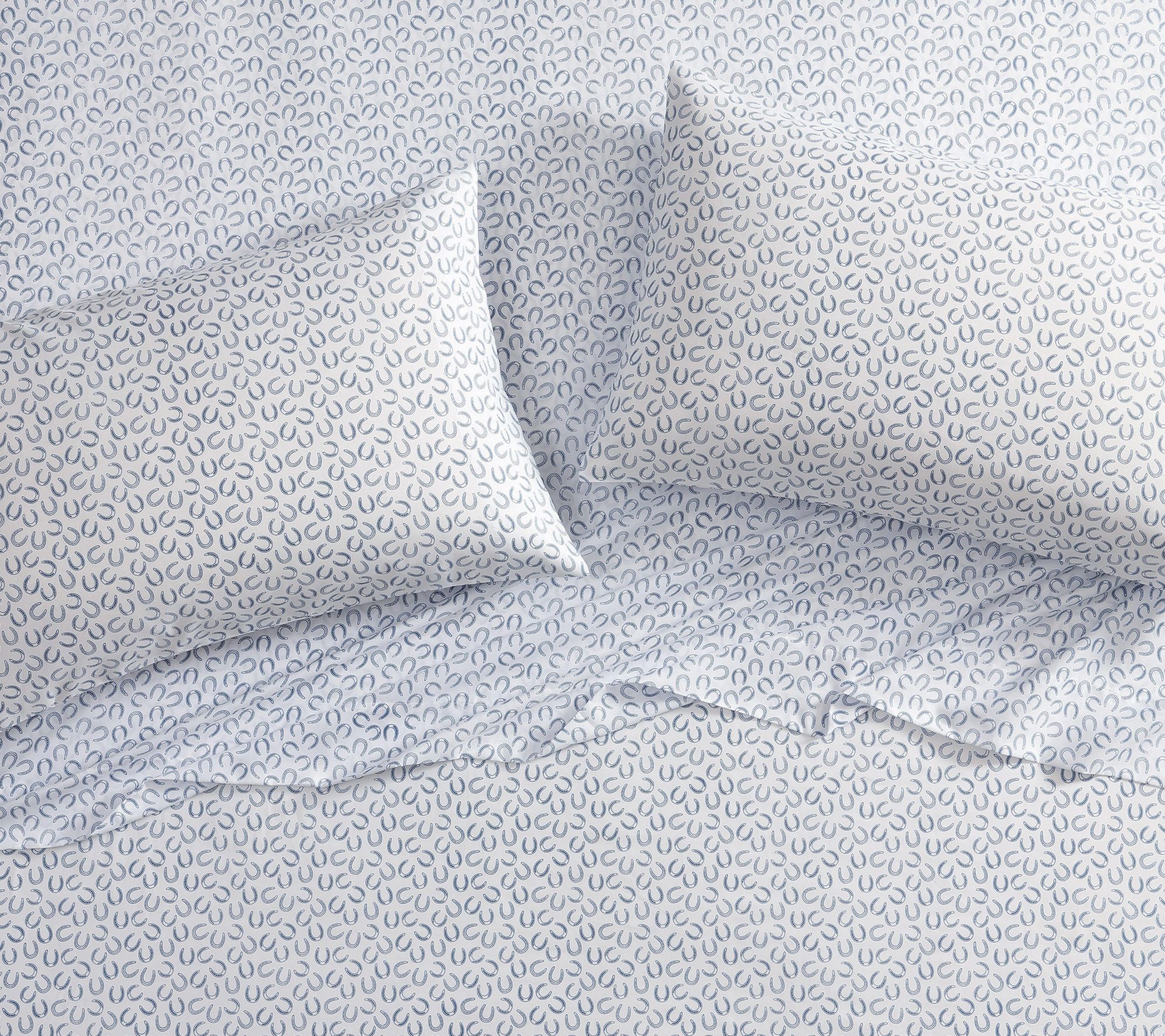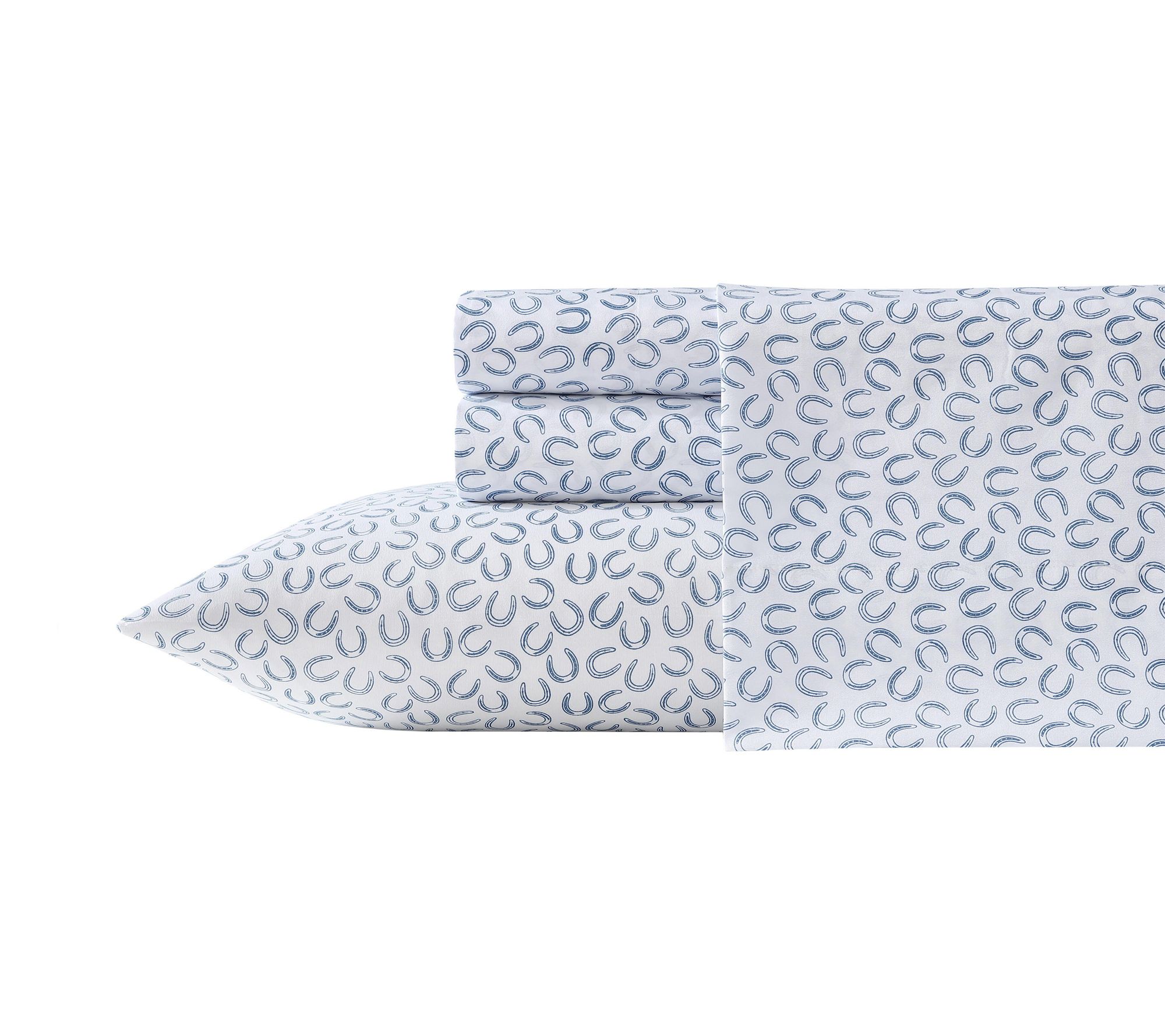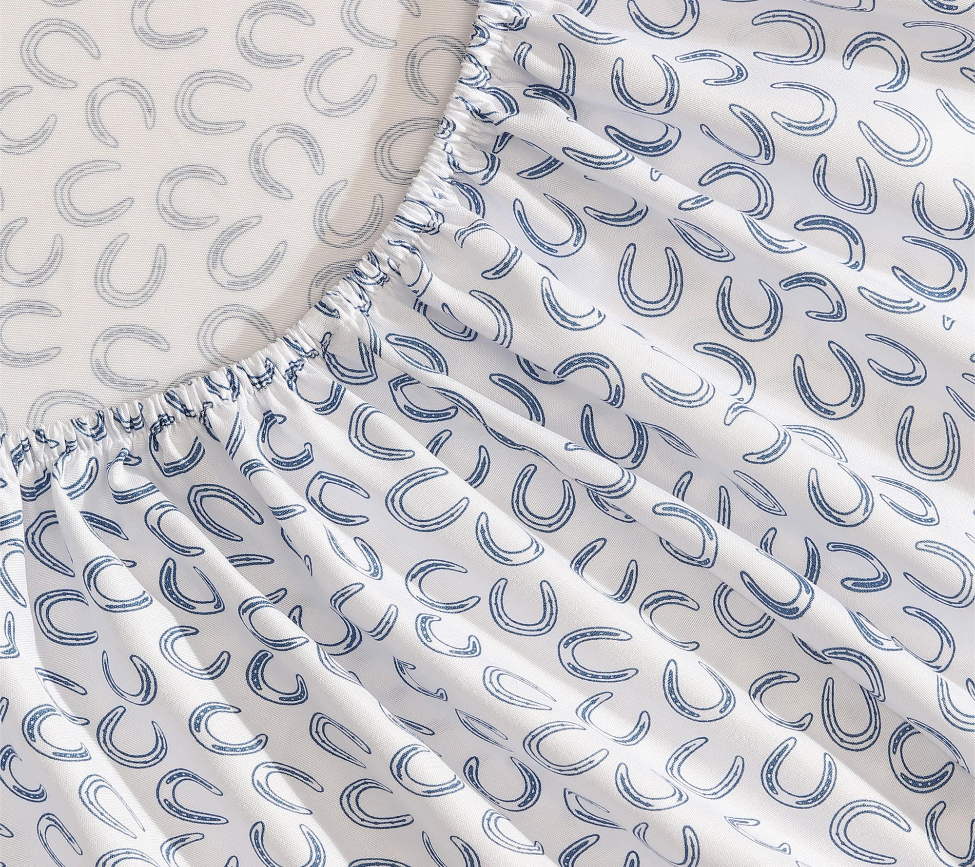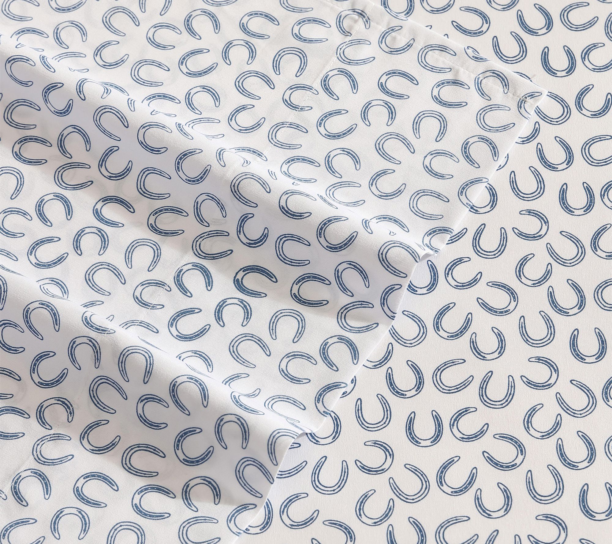 Give your bedroom a dash of western charm with this sheet set, styled in a crisp white and playful blue horseshoe pattern inspired by Wrangler's heritage. Soft microfiber makes every night feel cozy and fresh, while the versatile design brightens up farmhouse-inspired spaces and modern interiors alike -- ideal for layering or outfitting your guest room, primary suite, or even a dorm. From Wrangler.