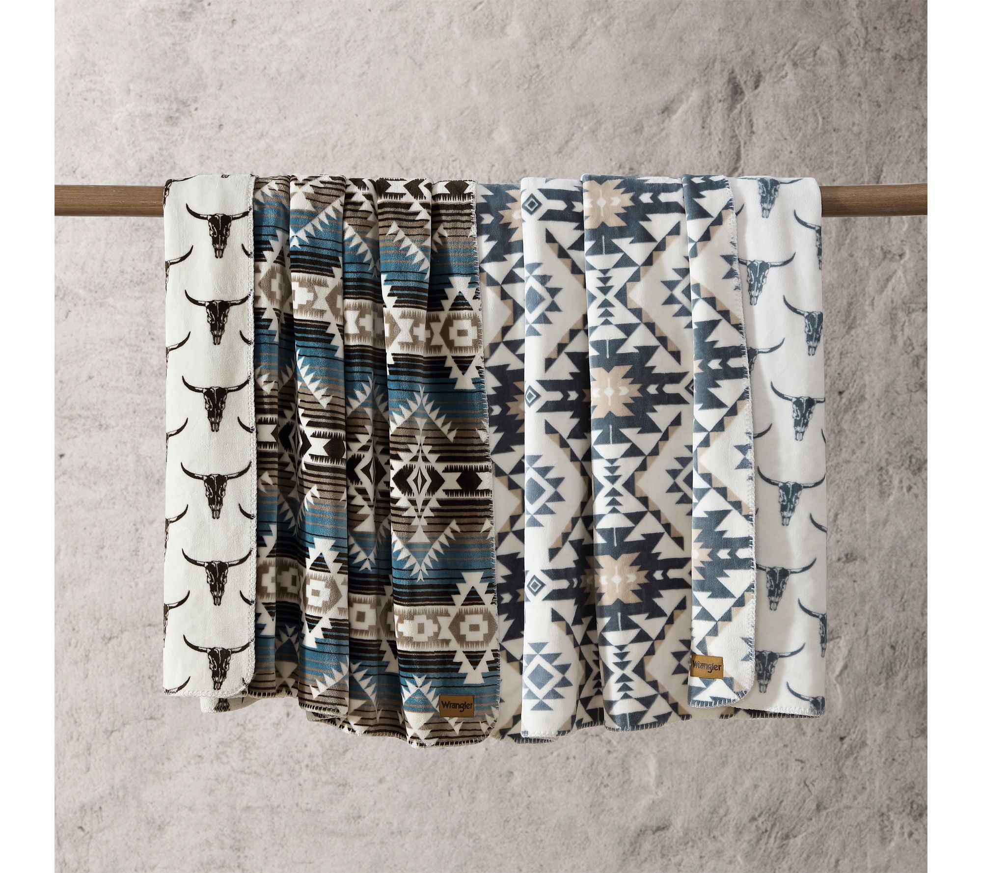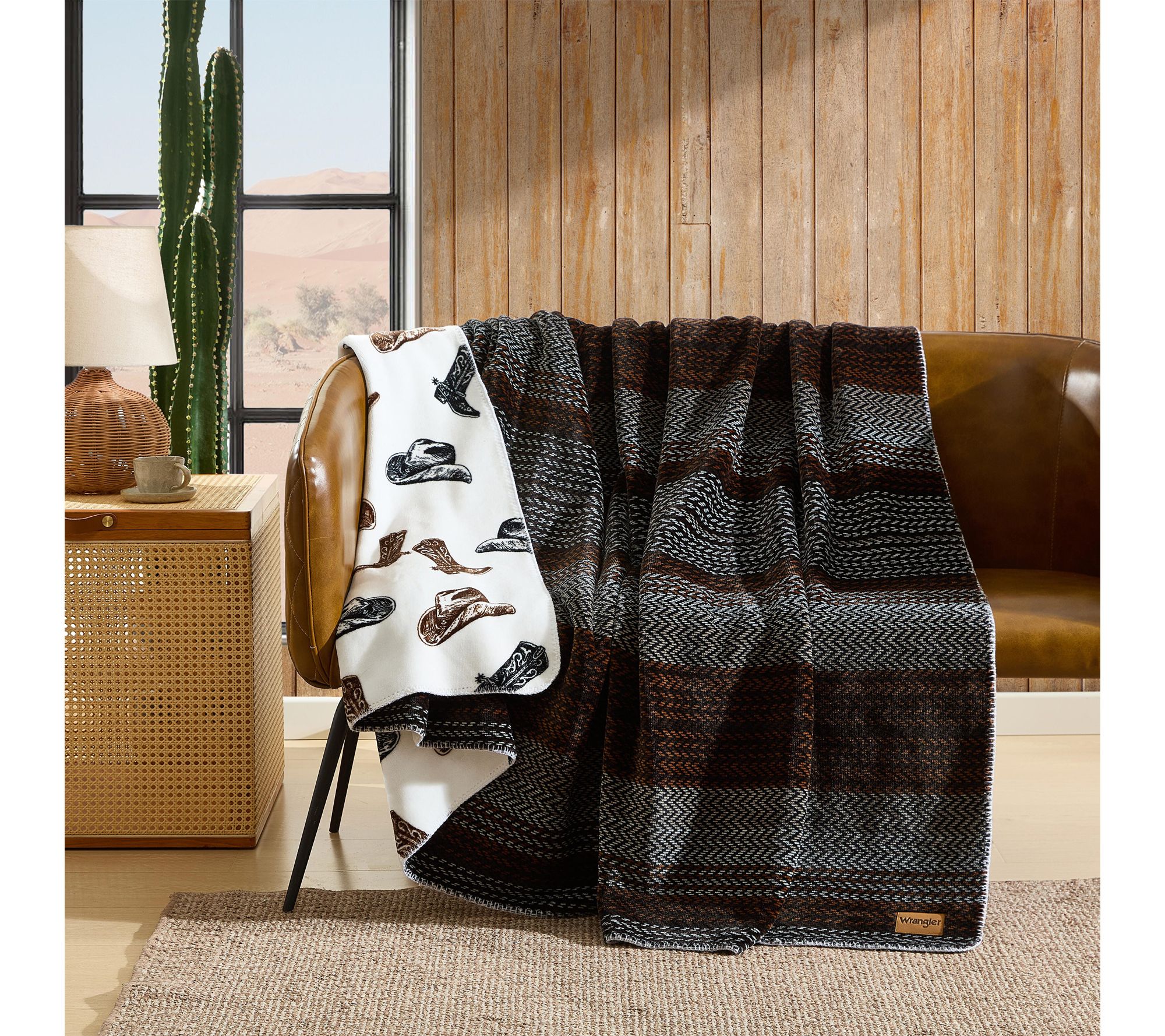 Cozy nights get a western twist with this reversible blanket, designed to showcase bold southwestern stripes on one side and dynamic longhorn skulls on the reverse. The soft texture and generous size invite you to unwind in style -- whether it's on the bed, sofa, or during a fireside gathering. From Wrangler.