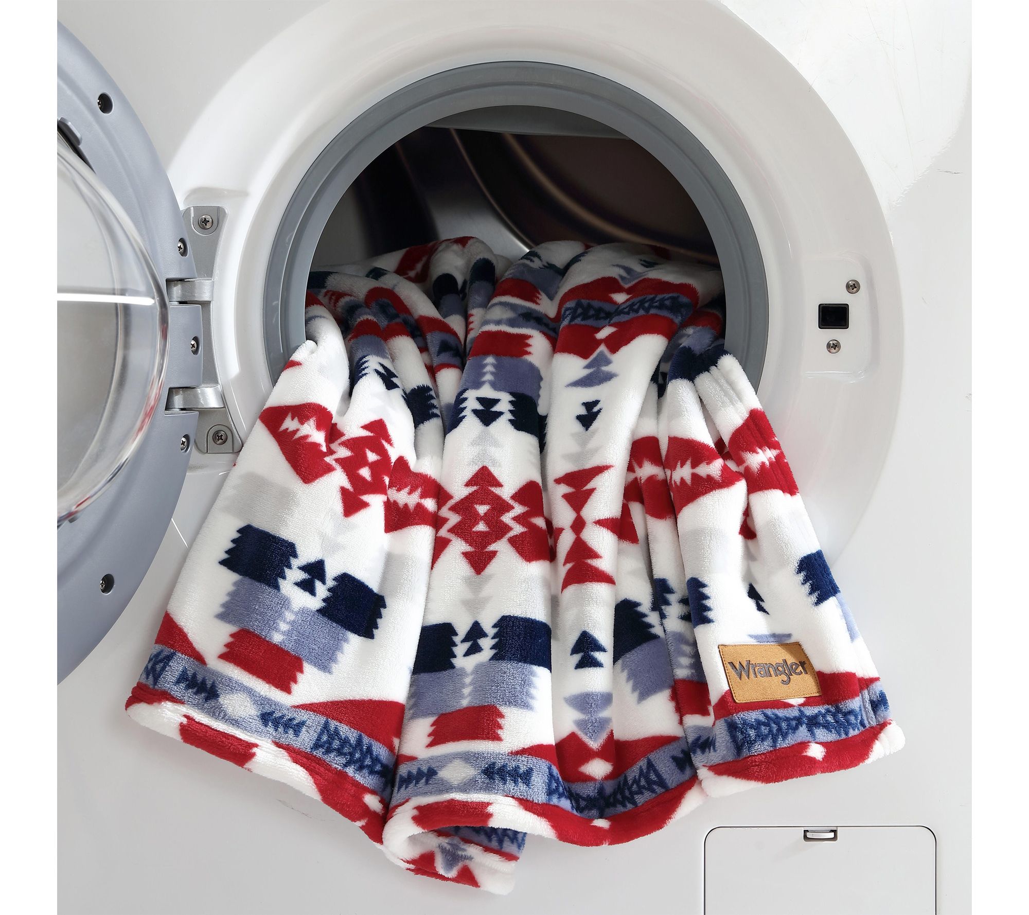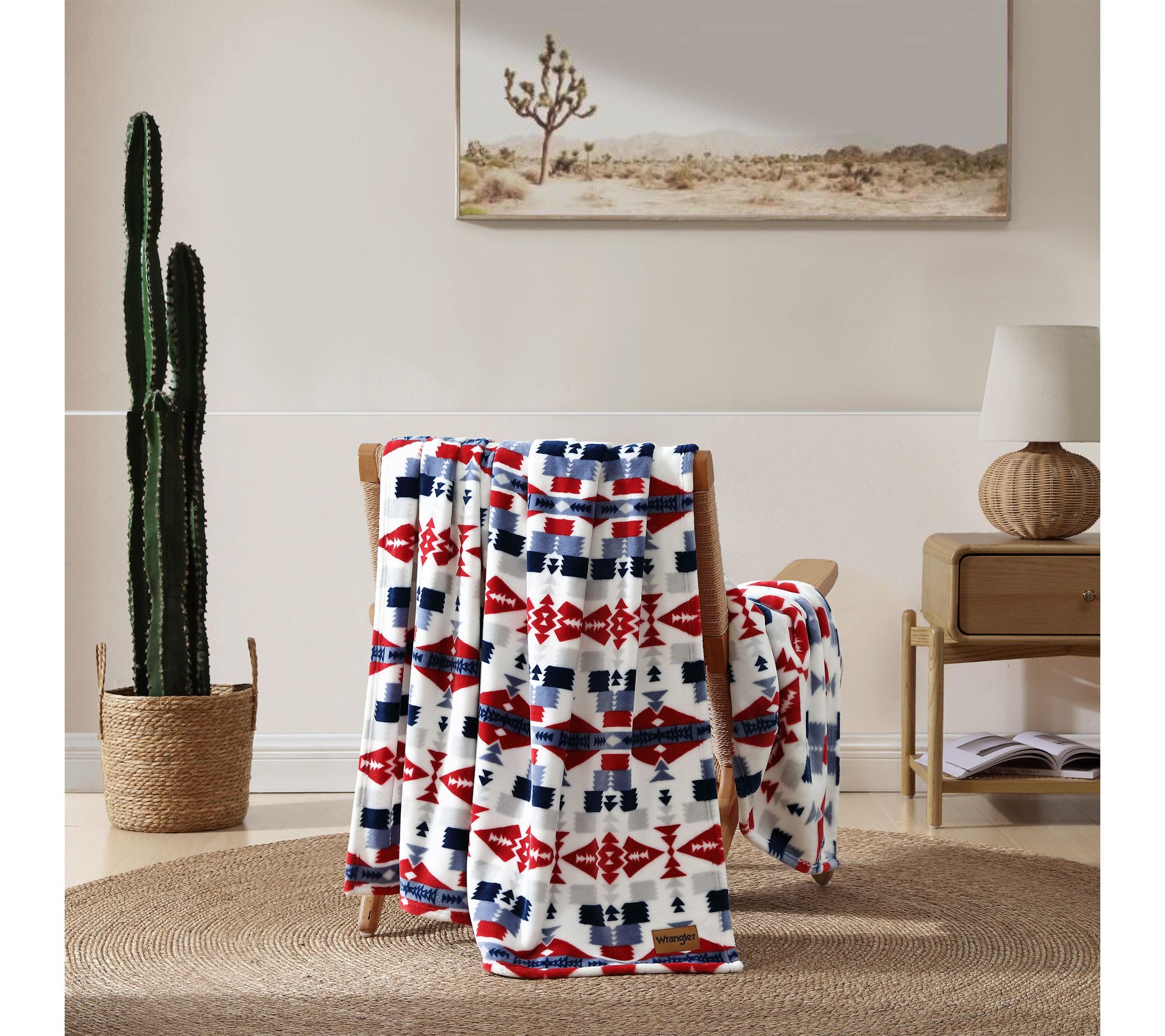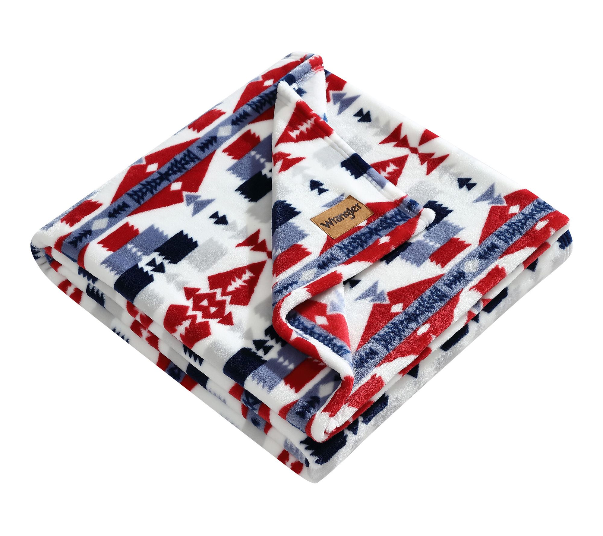 Bring warmth and style to quiet evenings or lively gatherings with this ultra plush fleece throw, featuring a bold southwestern-inspired design. The striking geometric patterns and rich blue and red hues offer a rustic touch that complements any decor, while the luxurious softness adds comfort whether you're relaxing on the sofa or heading out on a weekend adventure. From Wrangler.