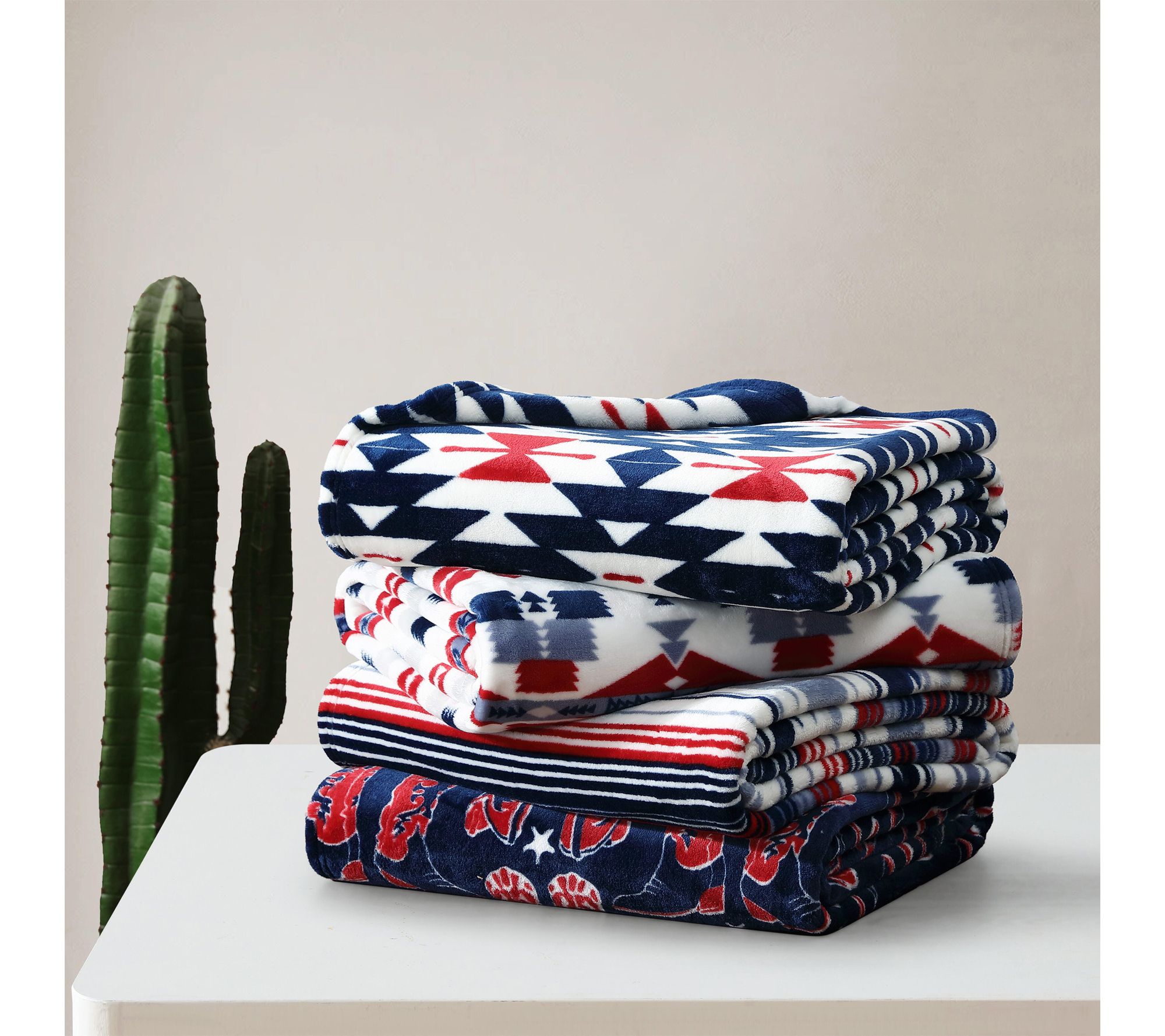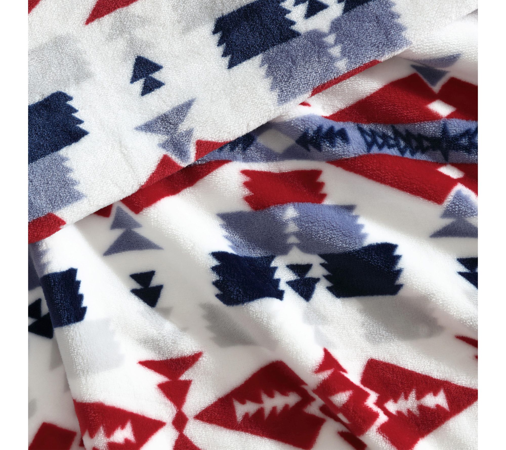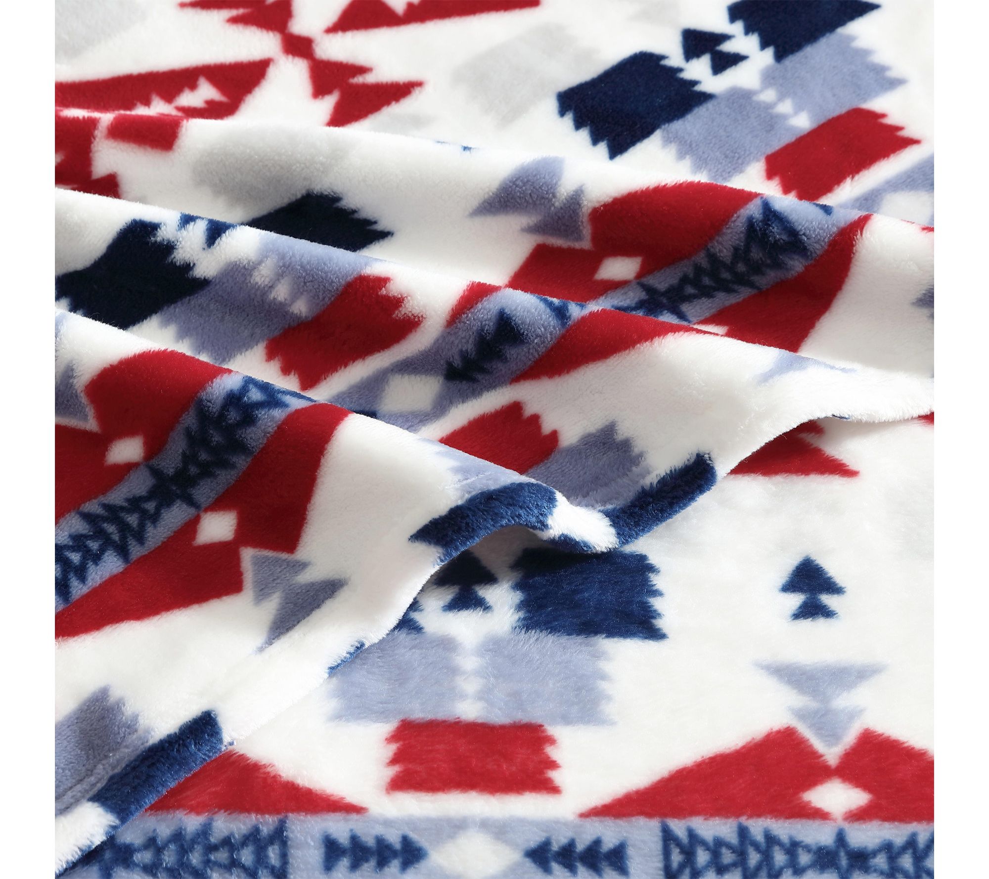 Bring warmth and style to quiet evenings or lively gatherings with this ultra plush fleece throw, featuring a bold southwestern-inspired design. The striking geometric patterns and rich blue and red hues offer a rustic touch that complements any decor, while the luxurious softness adds comfort whether you're relaxing on the sofa or heading out on a weekend adventure. From Wrangler.