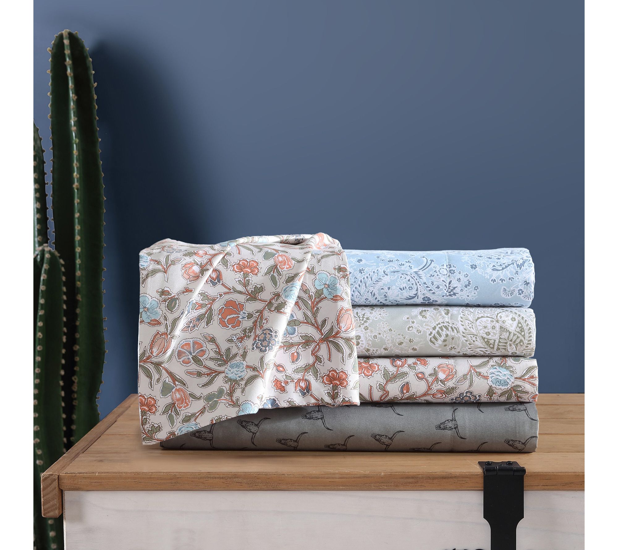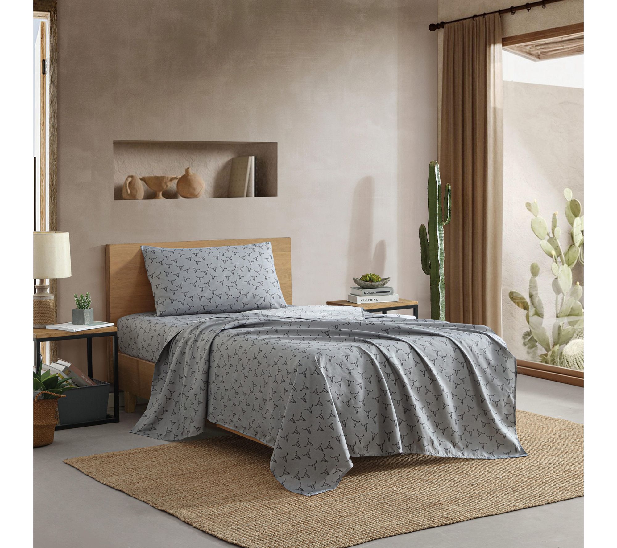 Channel a touch of Western spirit into your bedroom with this sheet set, where bold steer skulls meet the softness of lightweight microfiber. Whether dressing up a dorm or sprucing up your farmhouse style, these ruggedly charming sheets wrap your space in character and comfort, growing even cozier after each wash. From Wrangler.