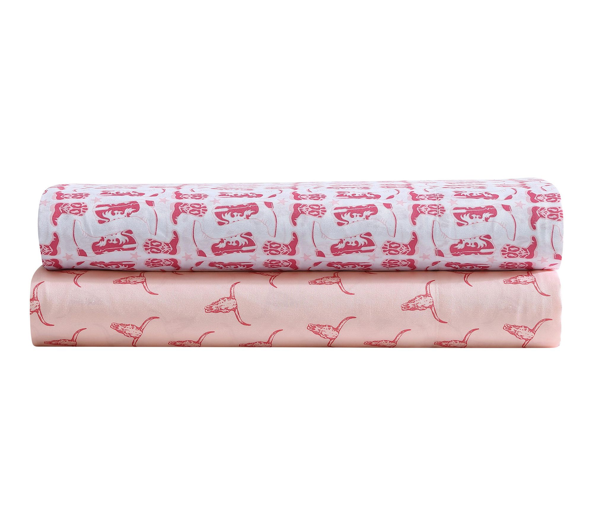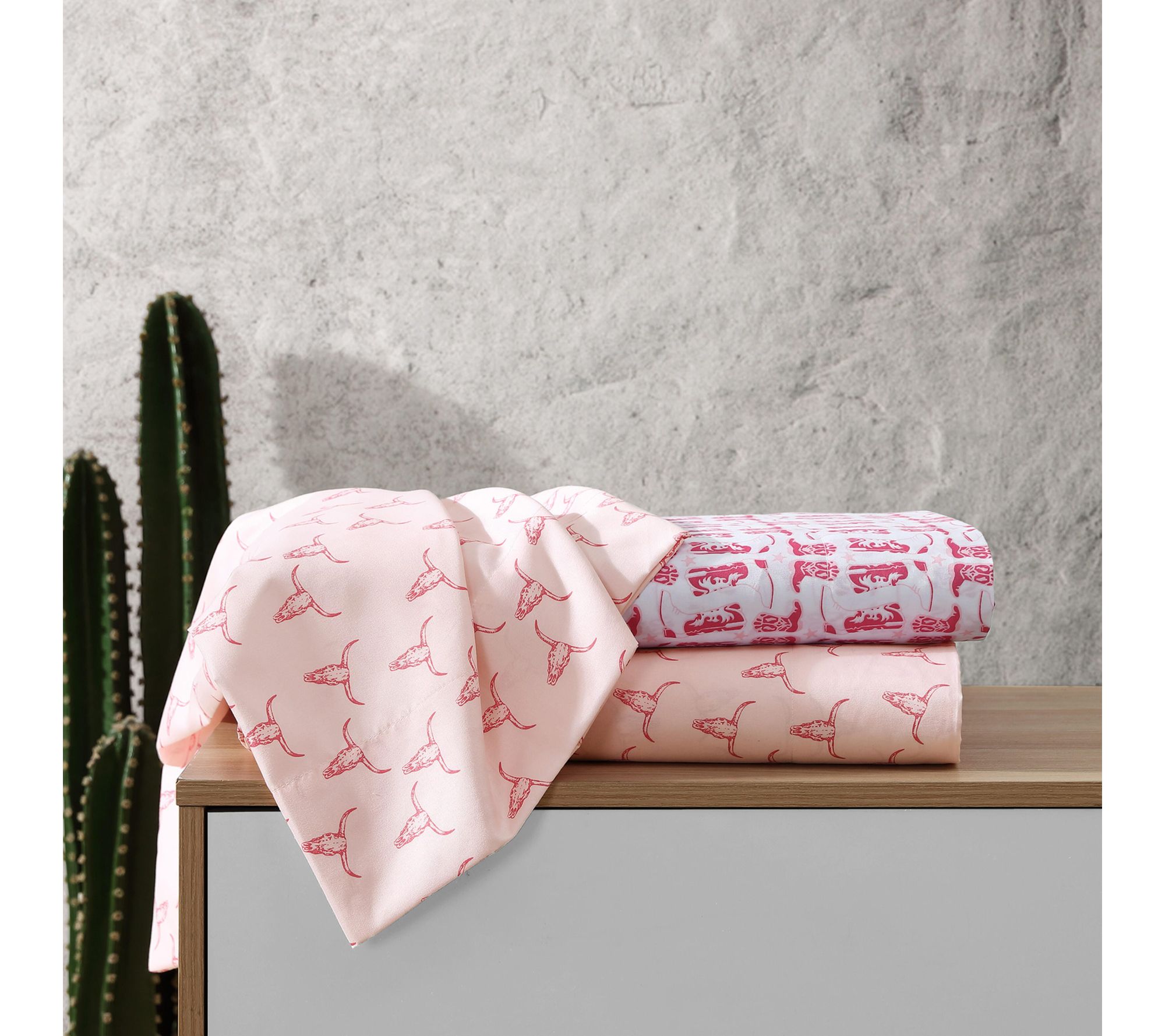 Add a touch of rugged western charm to your bedroom with this sheet set, featuring bold pink steer skulls and southwestern-inspired design. Crafted from soft microfiber, these sheets feel gentle against your skin and get even cozier wash after wash, making them ideal for relaxing after a long day. Perfect for farmhouse, modern, or eclectic spaces, they pair well with your favorite quilts and comforters. From Wrangler.