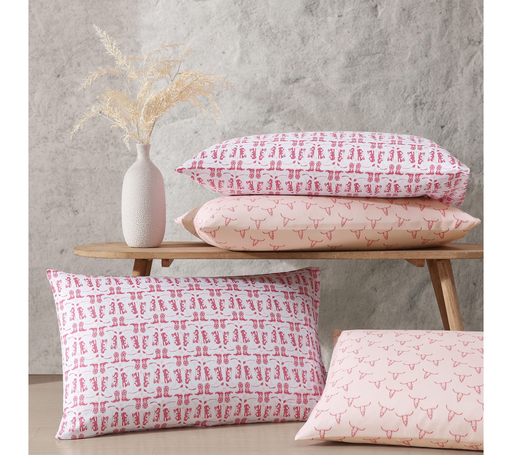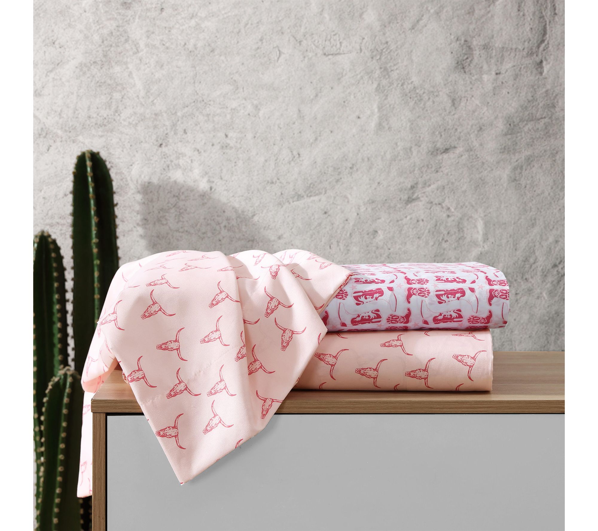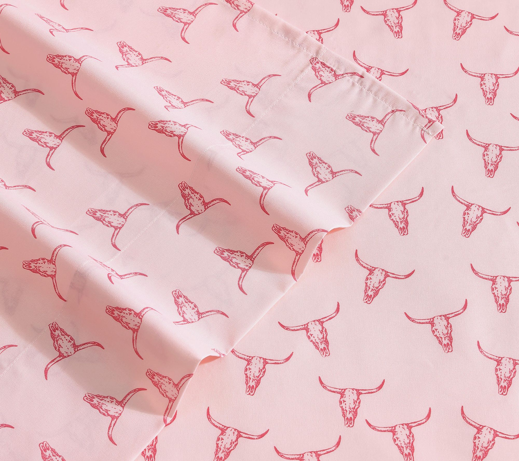 Transform your sleep space with this Twin sheet set inspired by the spirit of the Frontier -- vivid steer skulls in bold pink bring a dose of western energy and personality to your bedding. Soft microfiber sheets offer lasting comfort, growing cozier with every wash, while a secure fitted sheet and smooth pillowcase make for effortless nights. From Wrangler.