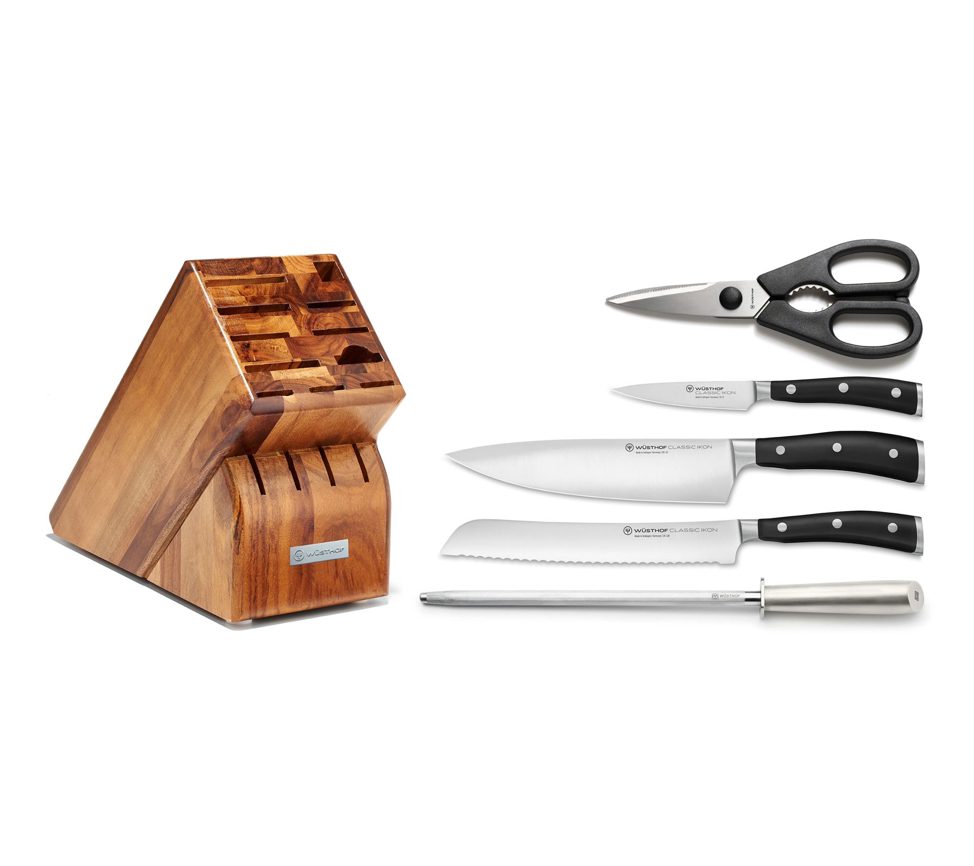 WUSTHOF Classic Ikon combines exquisite design with thoughtful features to bring you exceptional performance - and delicious results. The series offers fully-forged blades that are incredibly sharp thanks to aunique sharpening process. Each blade features a striking double-bolster design, and the ergonomic handle rests perfectly in your hand for optimal performance and comfort. Classic Ikon 3 " Paring Knife ClassicIkon 8" Bread Knife Classic Ikon 8" Chef's Knife 9" Honing Steel, Brushed Stainless Come-Apart Kitchen Shear, Black 15-Slot Acacia Block;Cl;Classic Ikon 6pc Knife Block Set Instructions