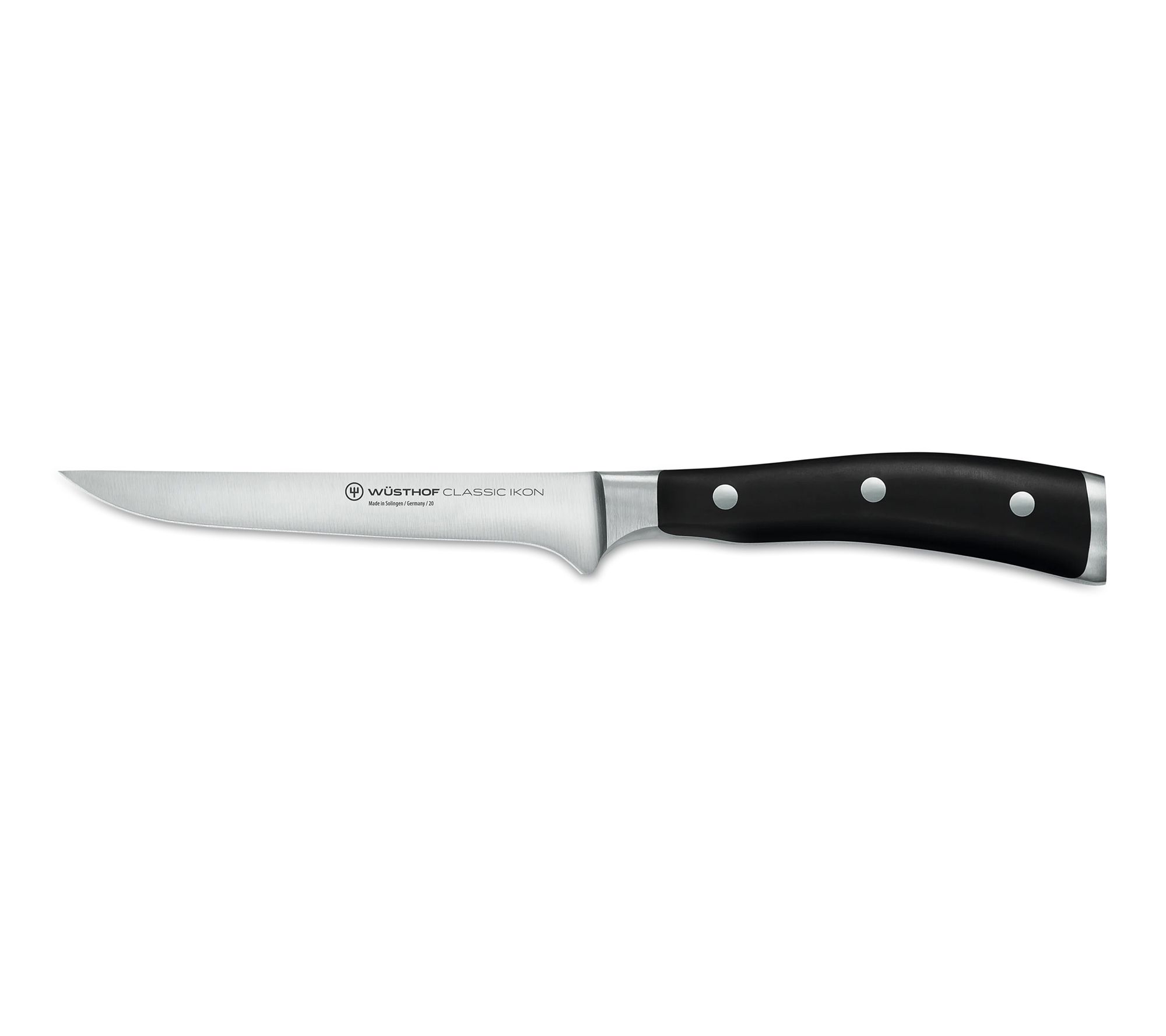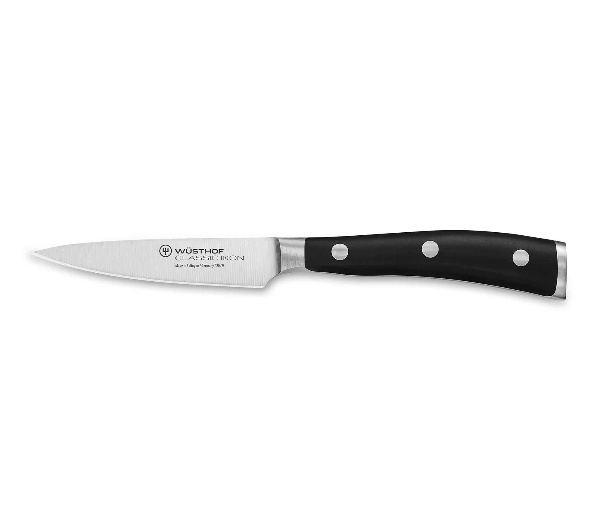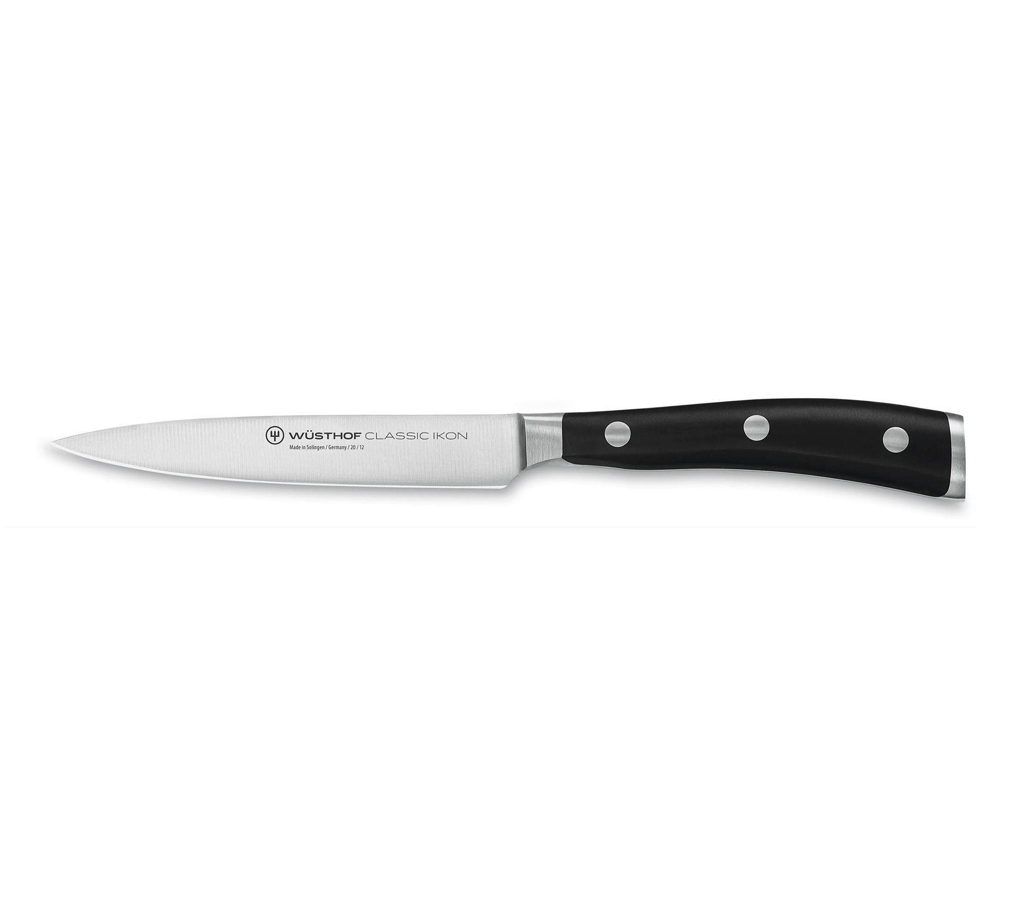 WUSTHOF Classic Ikon combines exquisite design with thoughtful features to bring you exceptional performance - and delicious results. The series offers fully-forged blades that are incredibly sharp thanks to aunique sharpening process. Each blade features a striking double-bolster design, and the ergonomic handle rests perfectly in your hand for optimal performance and comfort. 3" Flat Cut Paring Knife 3 " Paring Knife 4 " Utility Knife 5" Santoku 5" Serrated Utility Knife 5" Boning Knife 8" Bread Knife 8" Chef's Knife 9" Brushed Stainless Honing Steel;3" Flat Cut Paring Knife 3 " Paring Knife 4 " Utility Knife 5" Santoku 5" Serrated Utility Knife 5" Boning Knife 8" Bread Knife 8" Chef's Knife 9" Brushed Stainless Honing Steel Come-Apart Kitchen Shears 15-Slot Acacia Knife Block