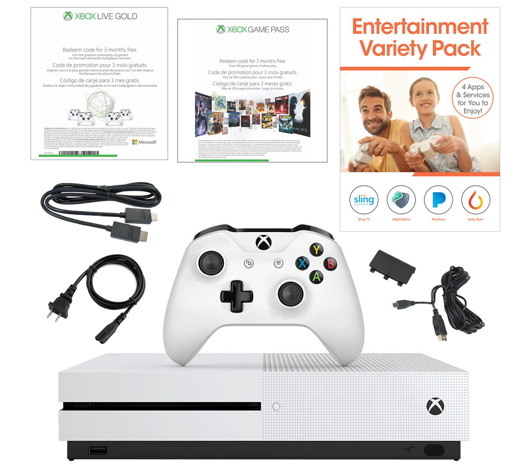 Includes Xbox One S console with Xbox wireless controller, HDMI cable, 14-day Xbox Live subscription, AC adapter; three-month Xbox Game Pass subscription, three-month Xbox Live Gold subscription, and Entertainment Variety Pack voucher