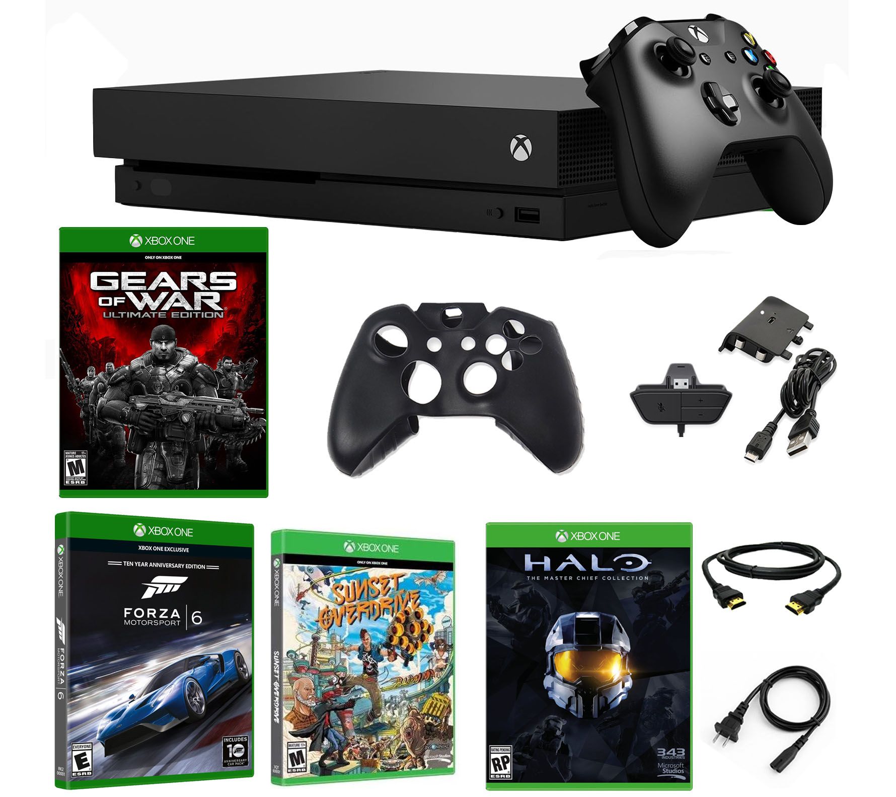 Includes Xbox One X console with Xbox wireless controller, 14-day Xbox Live Gold subscription, one-month Xbox Game Pass subscription, AC adapter; Halo: The Master Chief Collection, Sunset Overdrive, Gears of War: Ultimate Edition, Forza Motorsport 6, silicone controller sleeve, and charging kit
