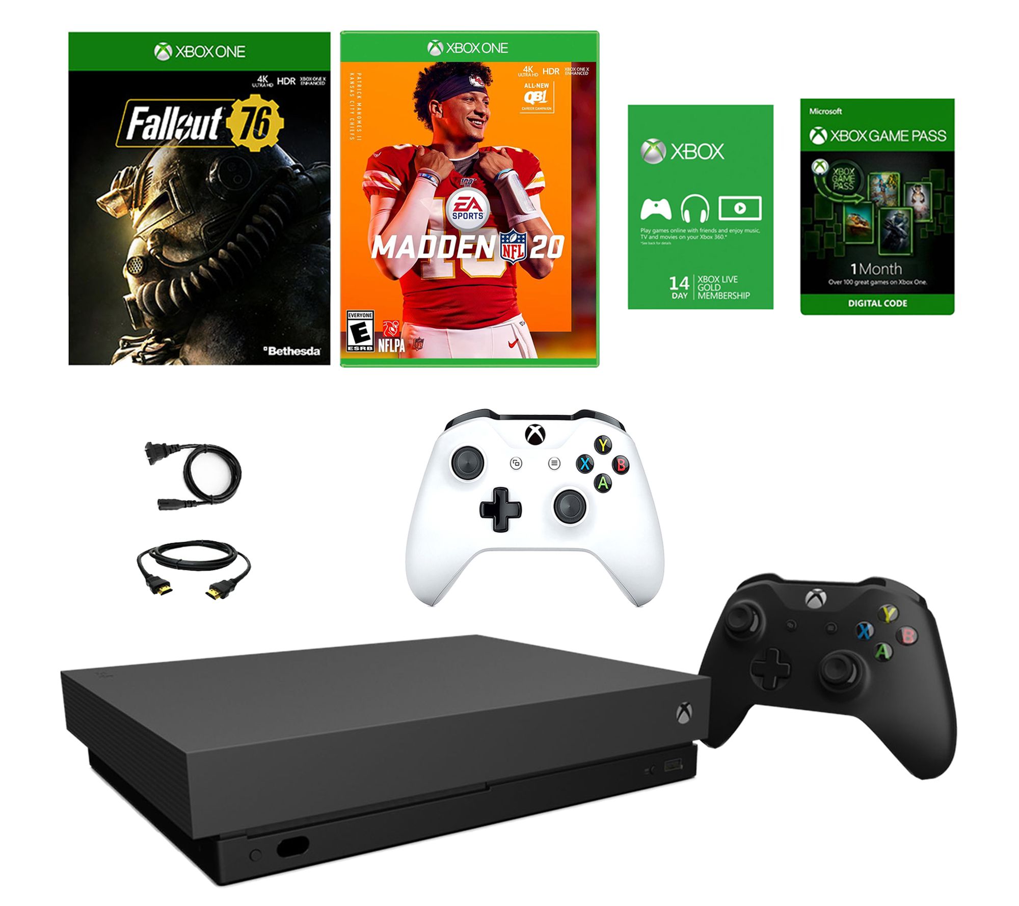 Includes Xbox One X console with black Xbox wireless controller, white Xbox wireless controller, 4 AA batteries, HDMI cable, 14-day Xbox Live subscription, one-month Xbox Game Pass subscription, AC adapter; Madden NFL 20 and Fallout 76