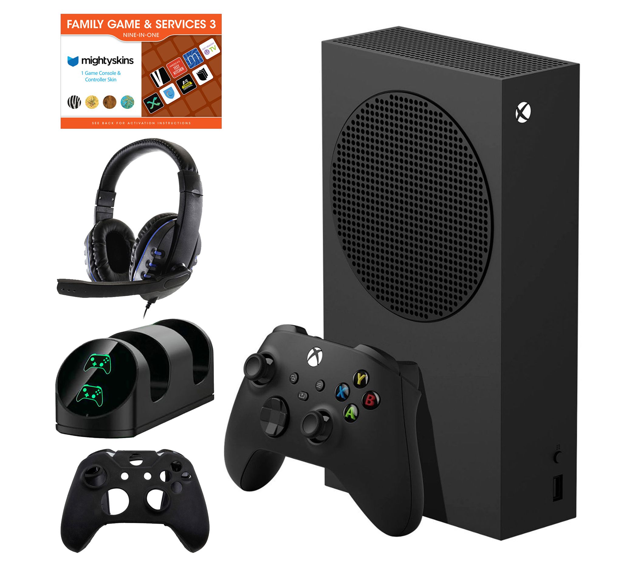 Includes Xbox Series S console, wireless controller with 2 AA batteries, HDMI cable, gaming headset, silicone sleeve, charging dock, and voucher
