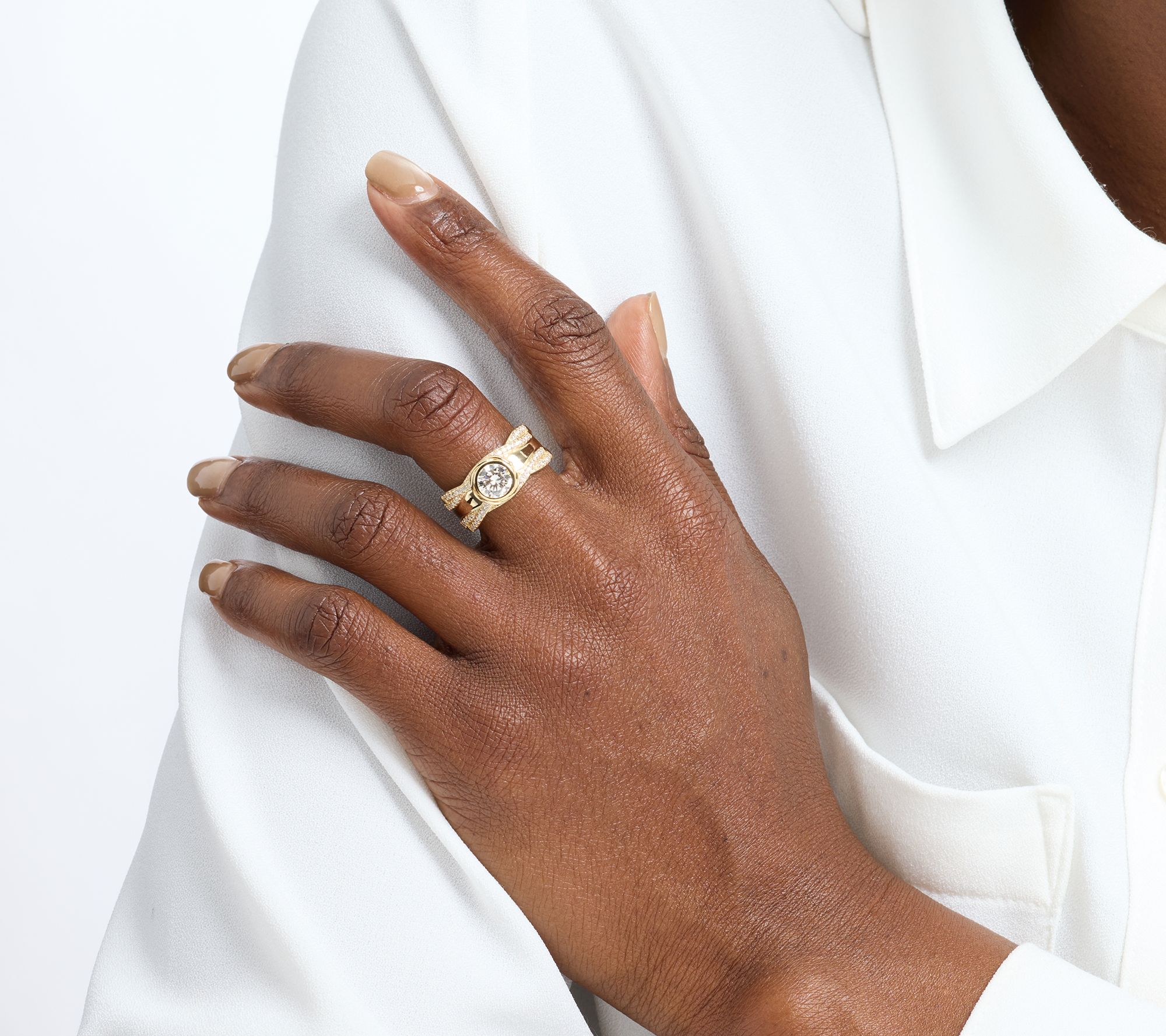 Lab-grown white diamonds; prong and pave settings; band design
