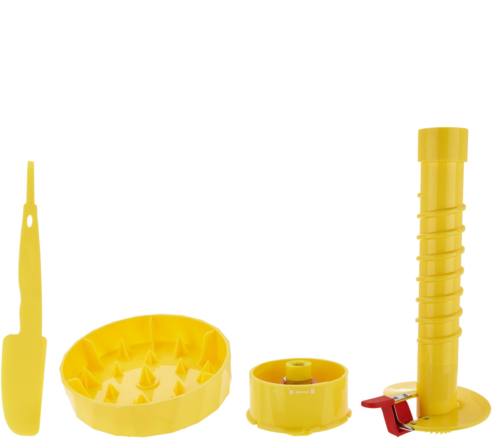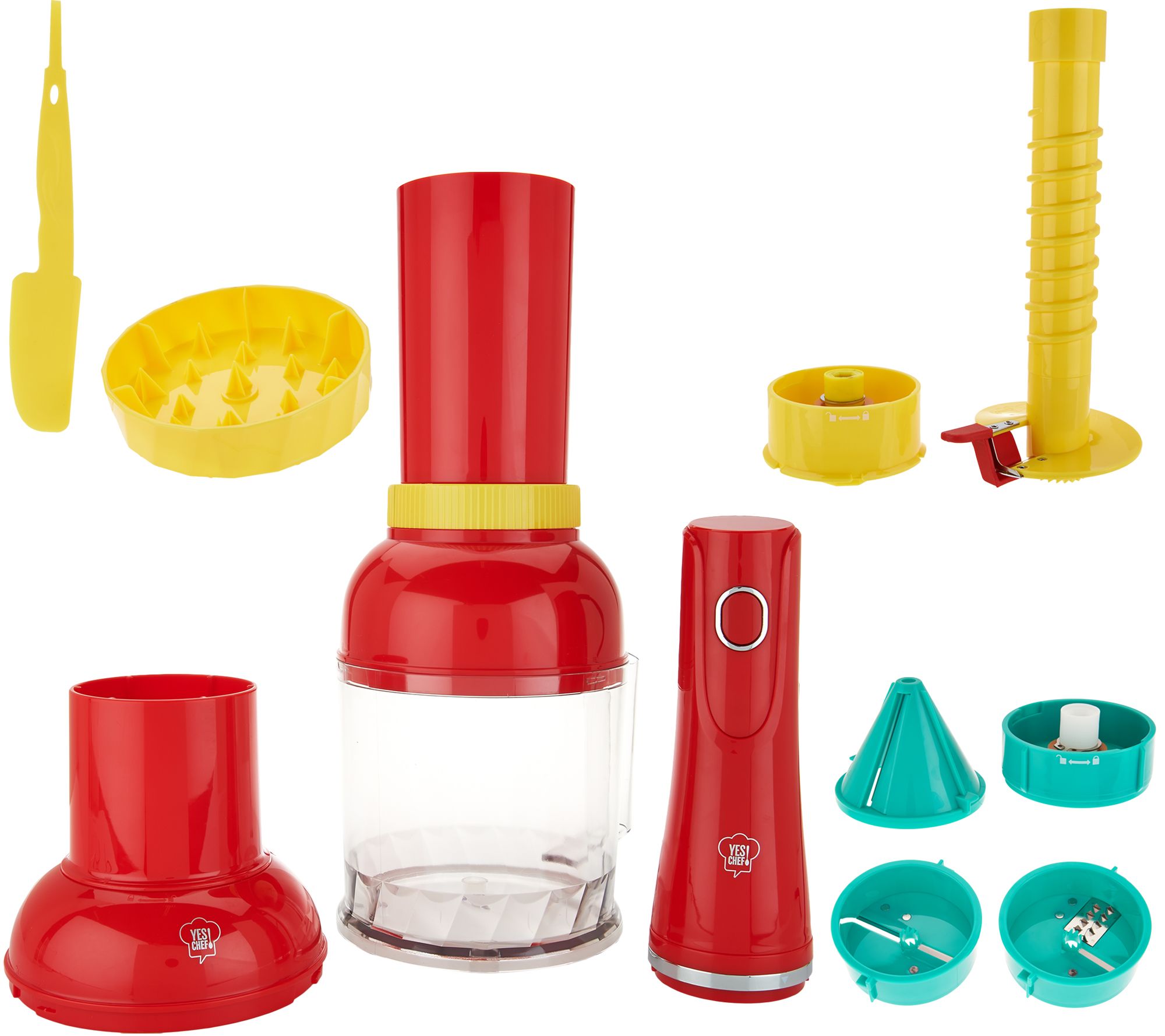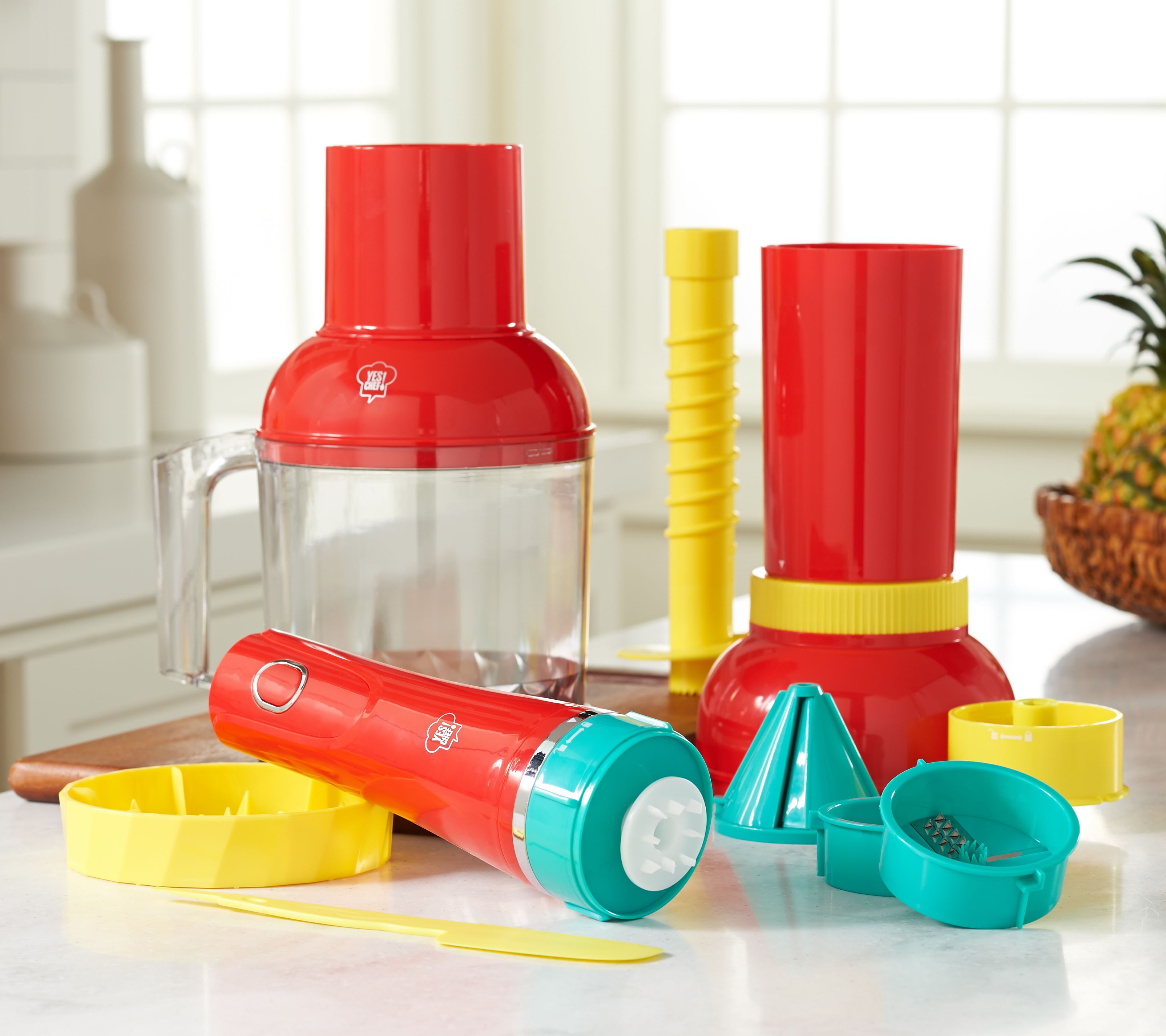 Includes motor unit; plate; bowl; noodle, ribbon, and wide ribbon blade; veggie base, shoot, and lid; pineapple base, shoot, and lid; spiral rod; and scraper