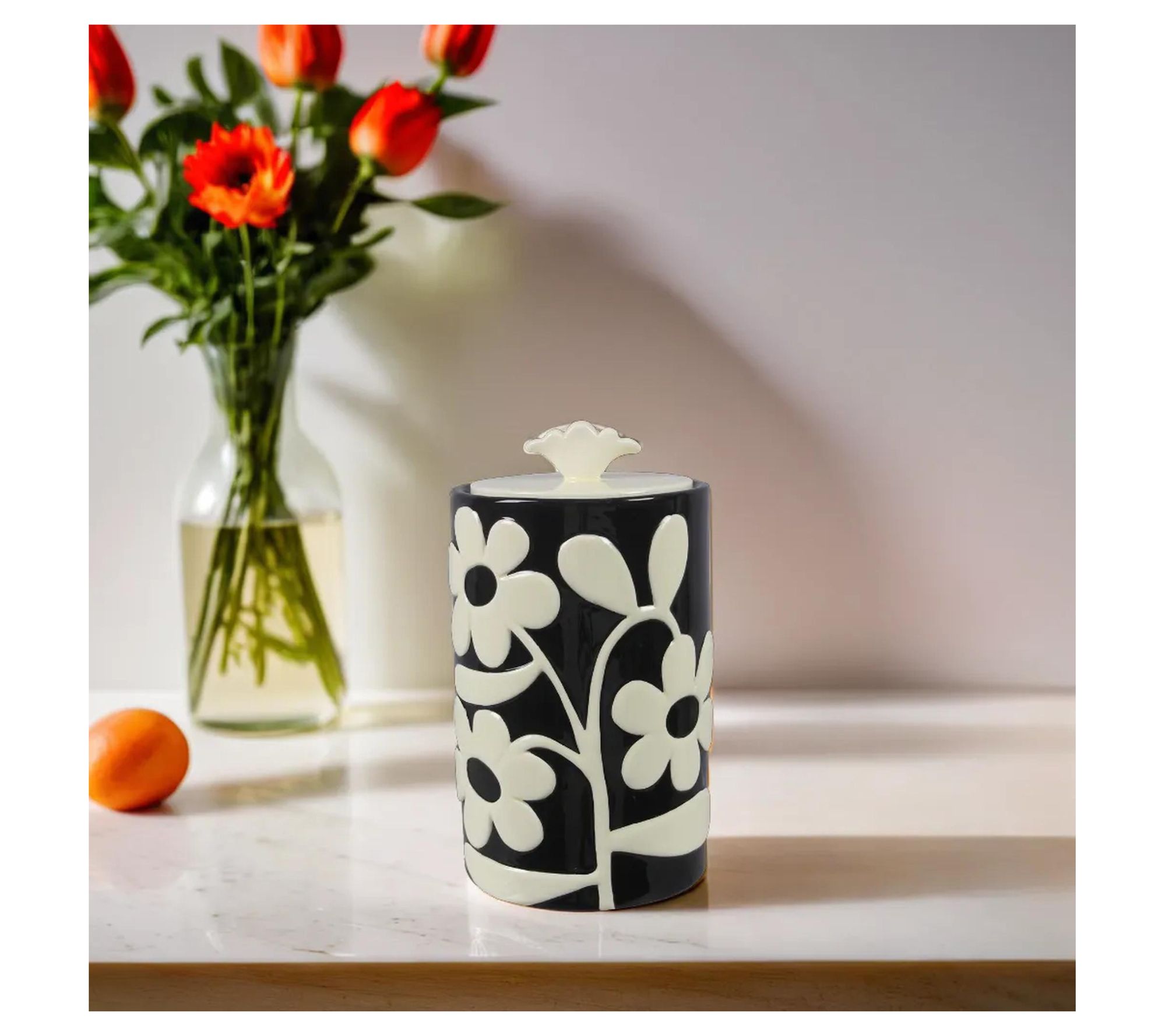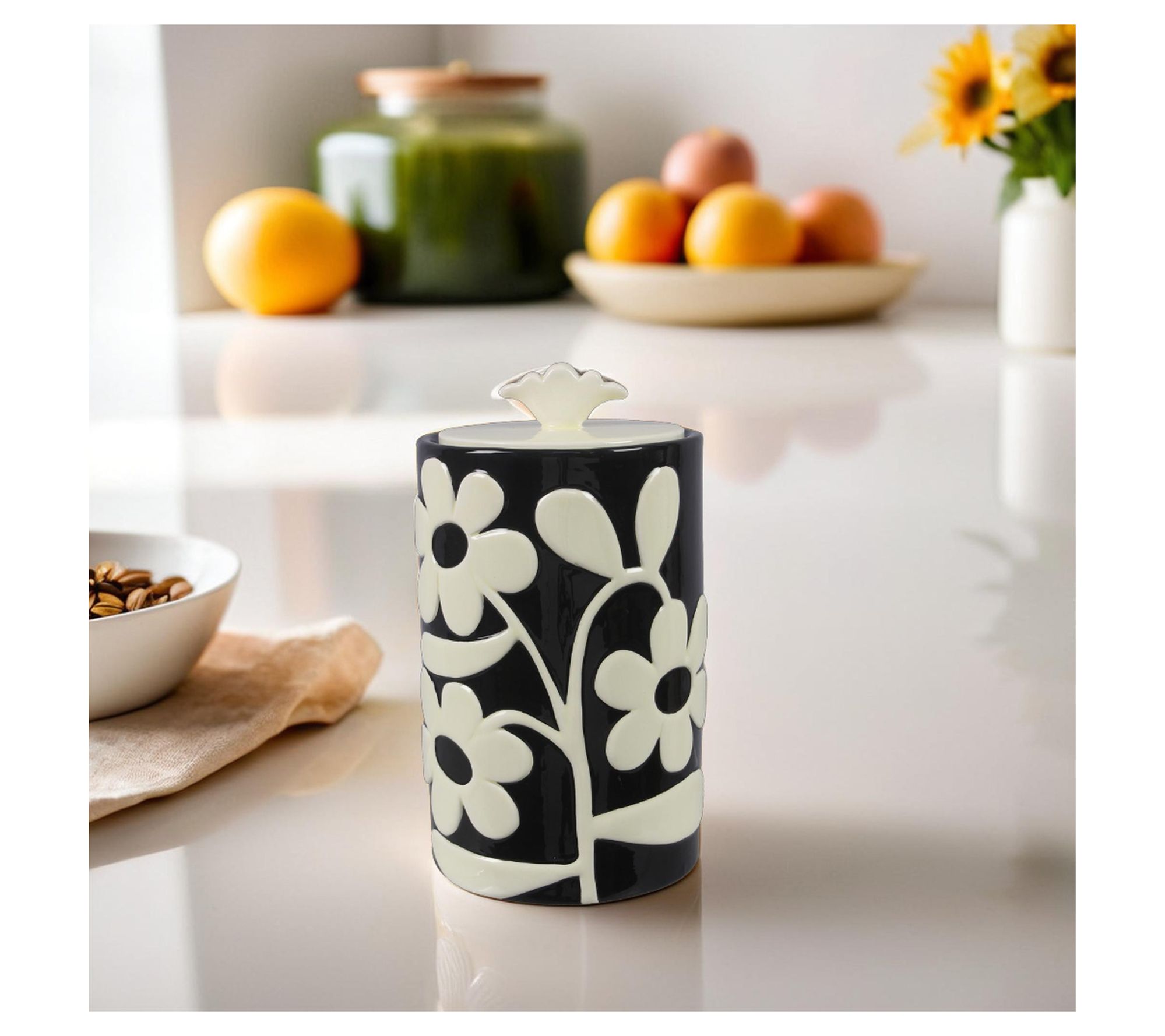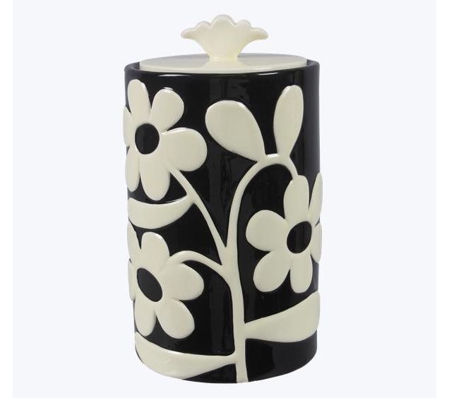 Store your kitchen essentials in style with this charming canister. Designed with a black and white raised floral pattern and topped with a white lid, it's both functional and decorative. Ideal for storing dry goods like flour, sugar, or coffee, it keeps your kitchen looking tidy and chic. From Young's.